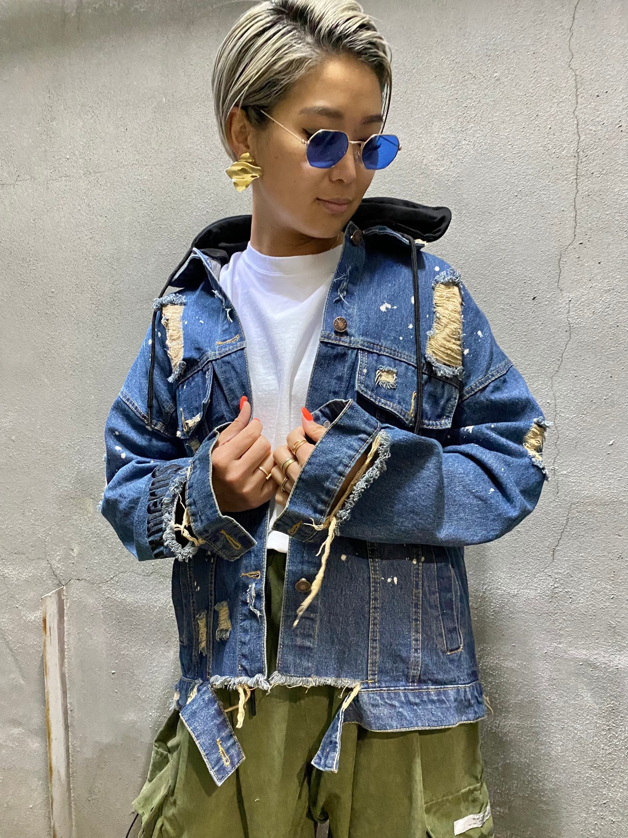 damage Indian wolf design denim jacket デニム ジャケット デニムジャケット ウルフ 狼 フード フーディー
