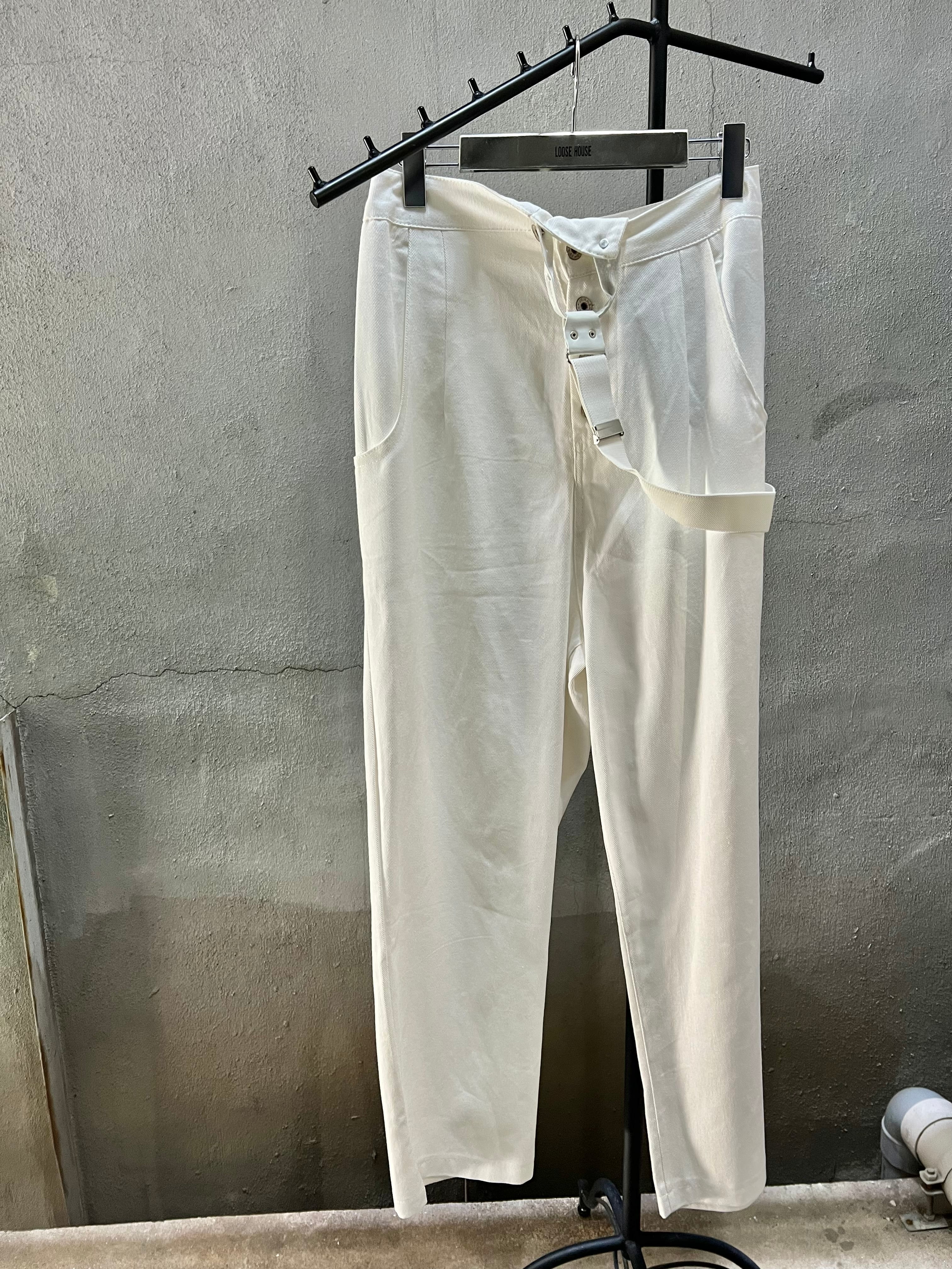 one strap white denim design pants パンツ デザインパンツ ストラップ サスペンダー ホワイトデニム
