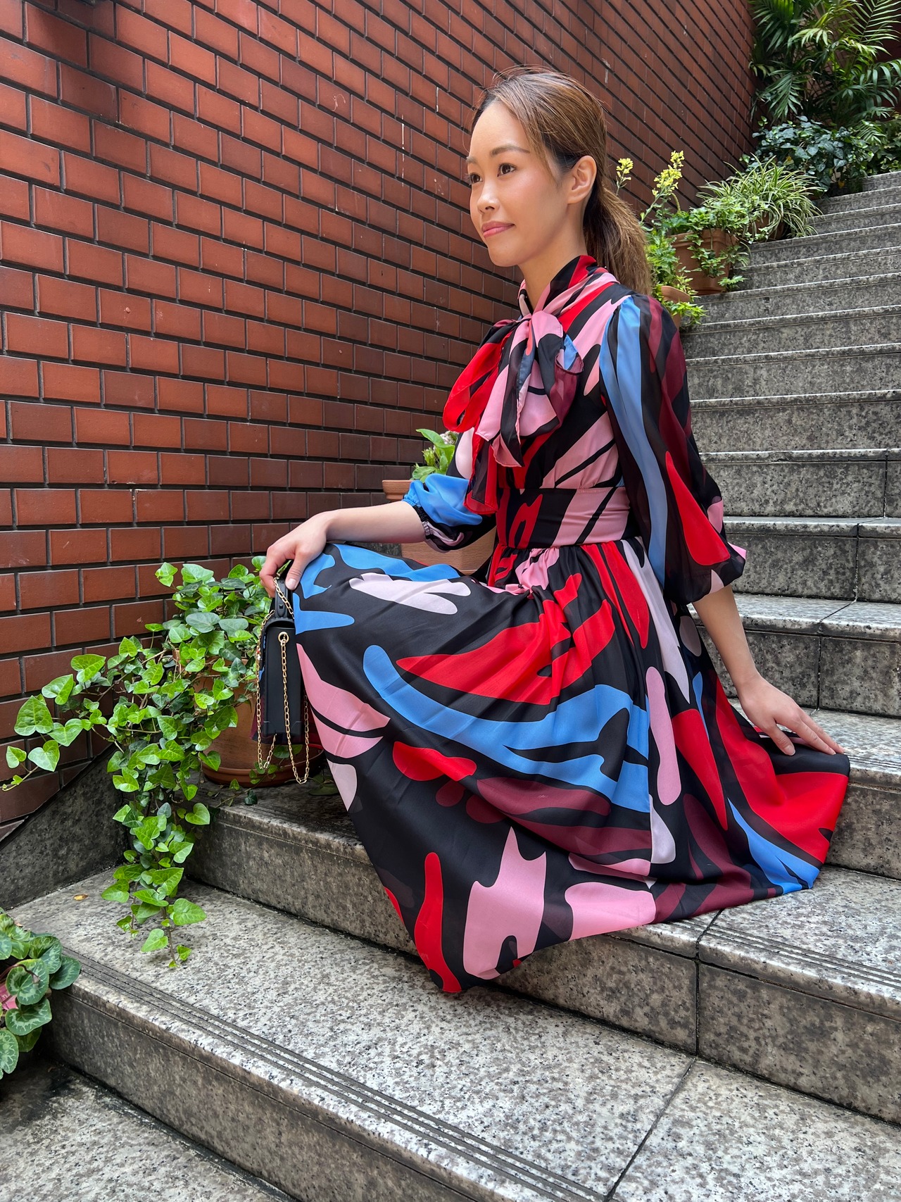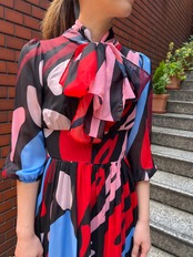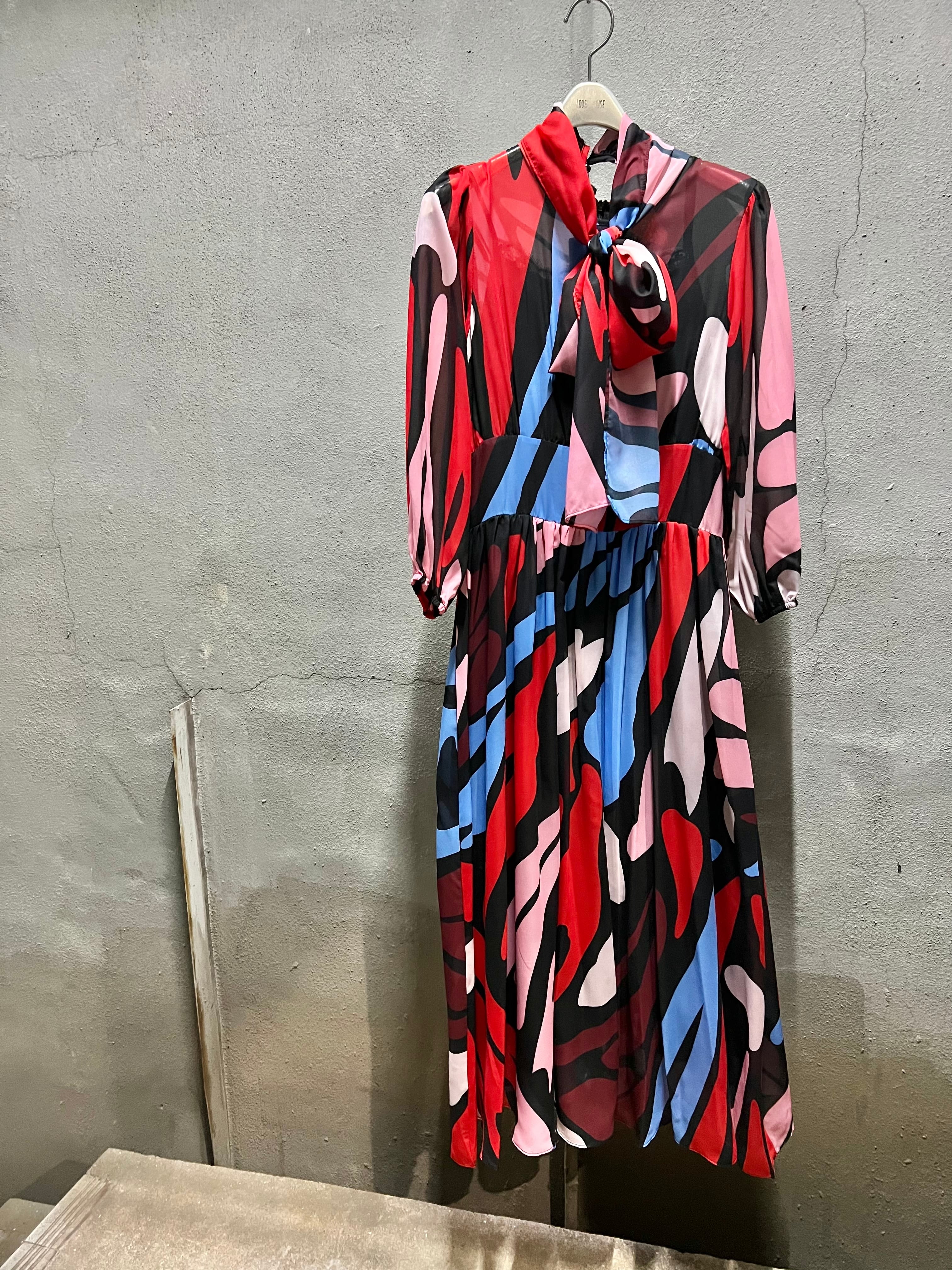 print chiffon bow-tie flare one-piece ワンピース ワンピ 柄ワンピ ボウタイ シフォン