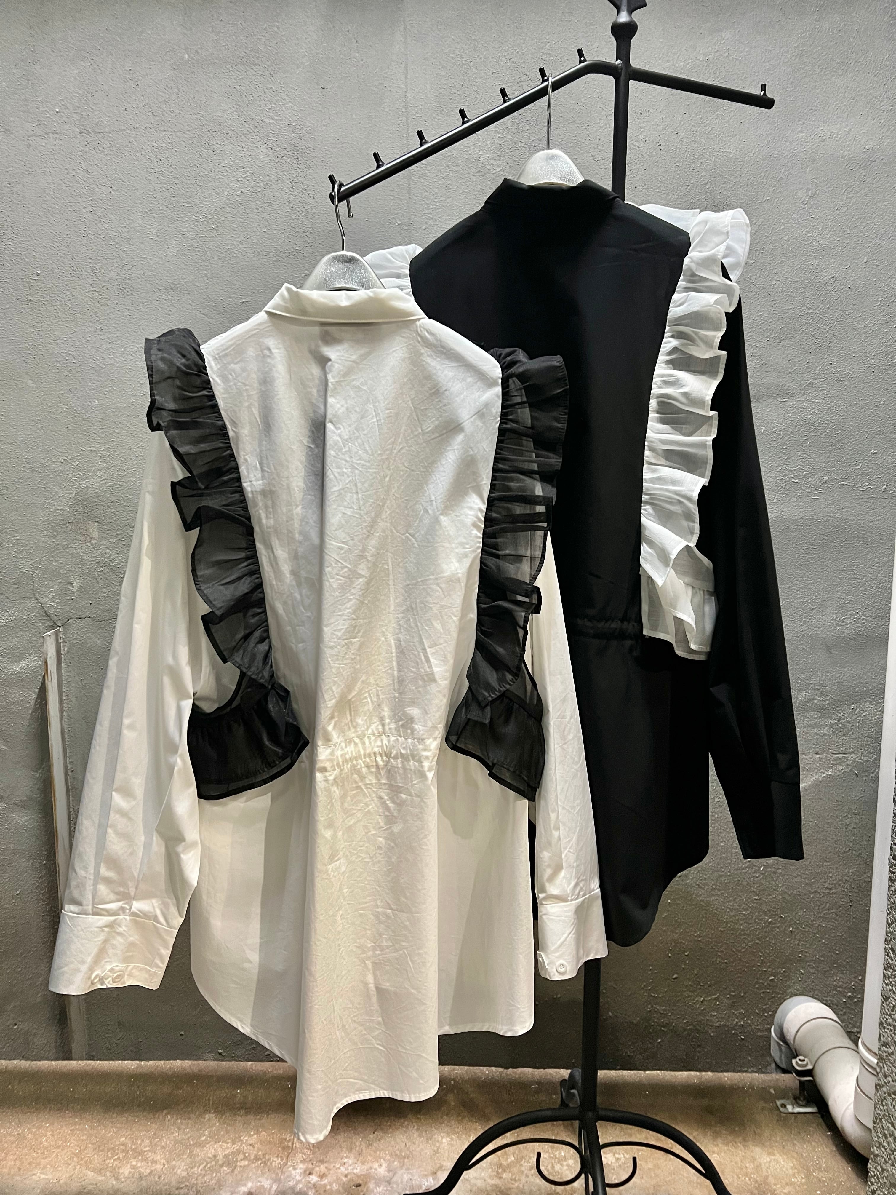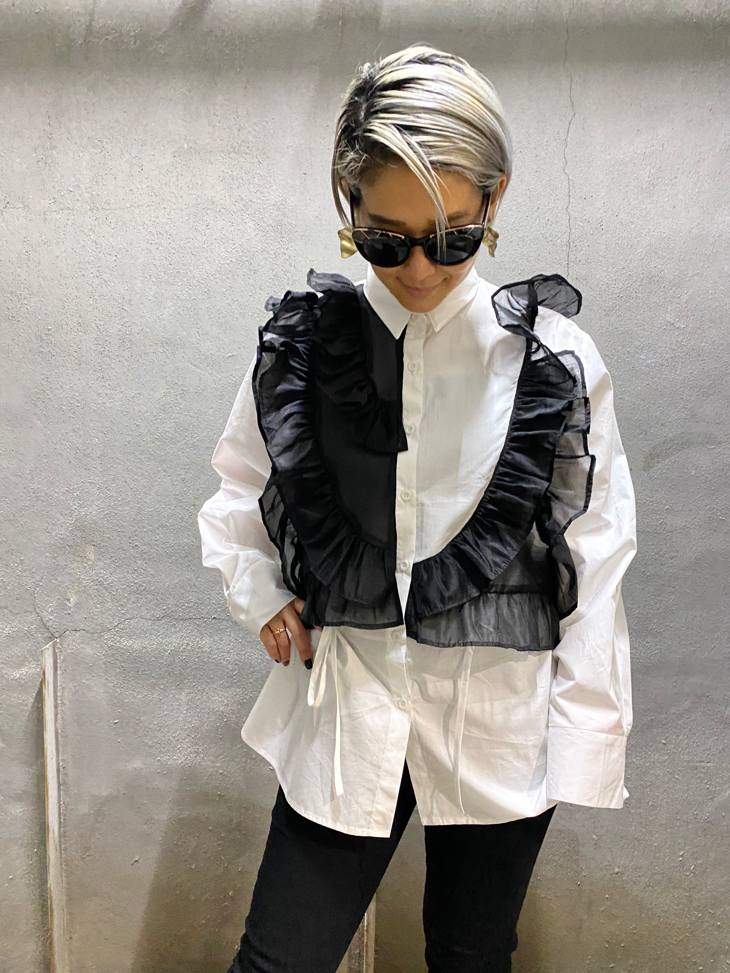 bi-color frill design shirt シャツ フリル バイカラー 配色 白黒 デザインシャツ