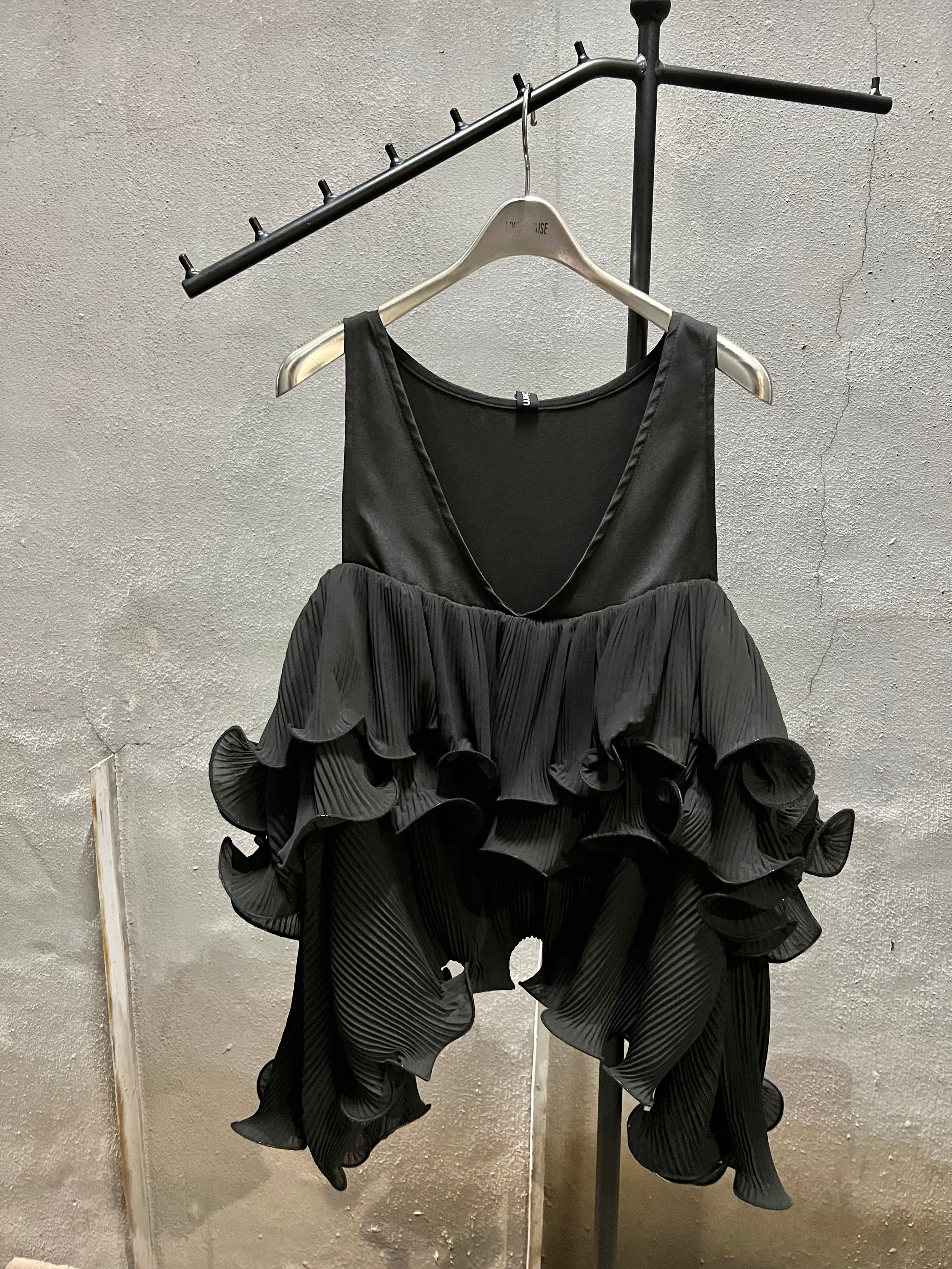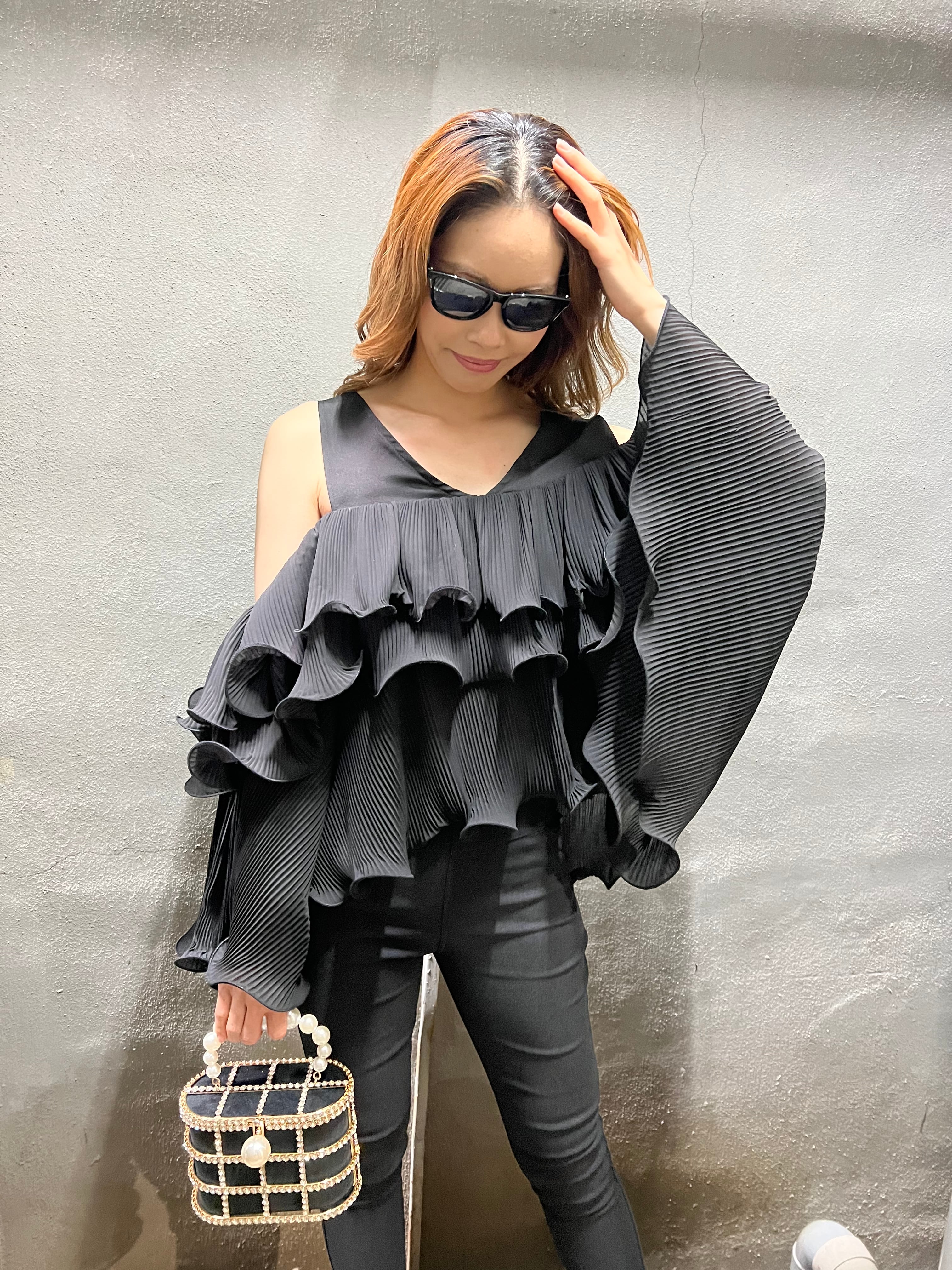 open sleeve chiffon frill design tops トップス オープンスリーブ シフォン プリーツ フリル