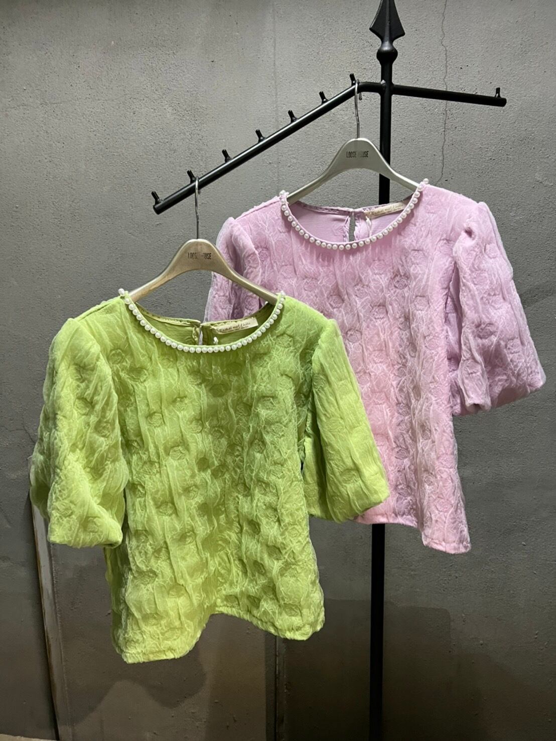 jacquard pearl neck tops トップス ジャガード パフスリーブ パール デザイントップス 可愛い きれいめ