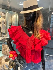 ボリューミーなフリルが可愛い深めVネックのブラウス。