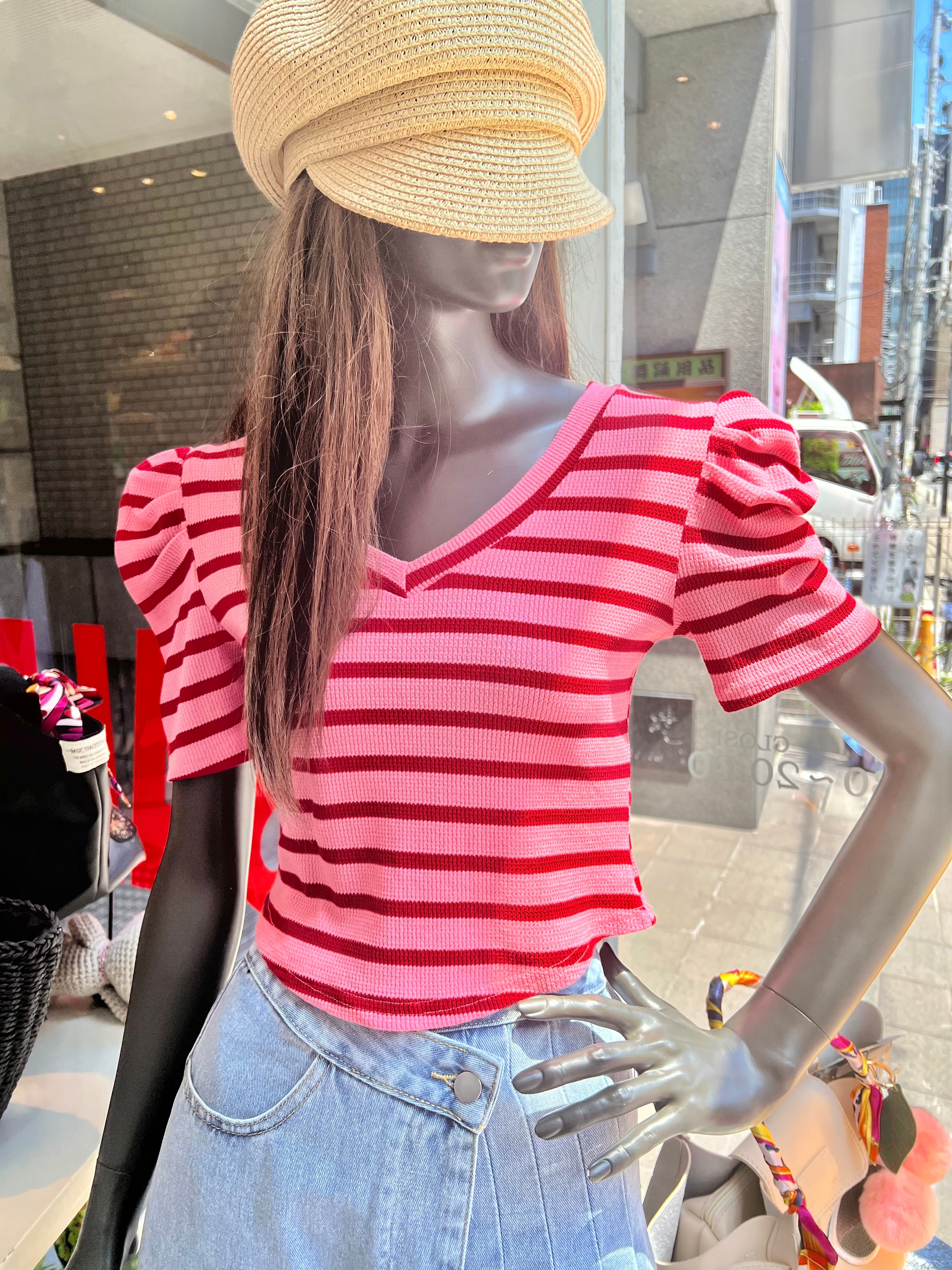 color border Vneck tops トップス ボーダー カラフル バイカラー Vネック デザインスリーブ