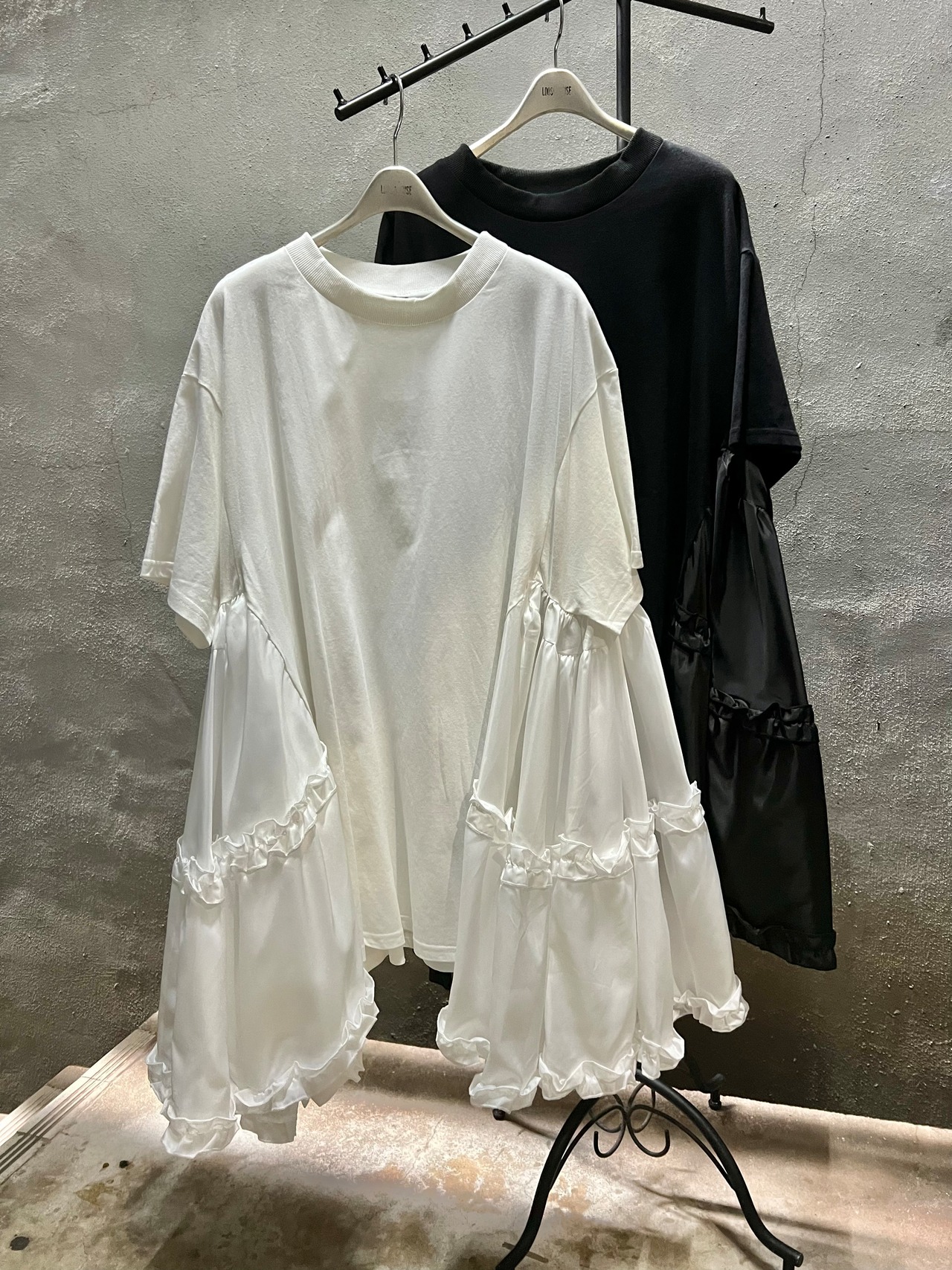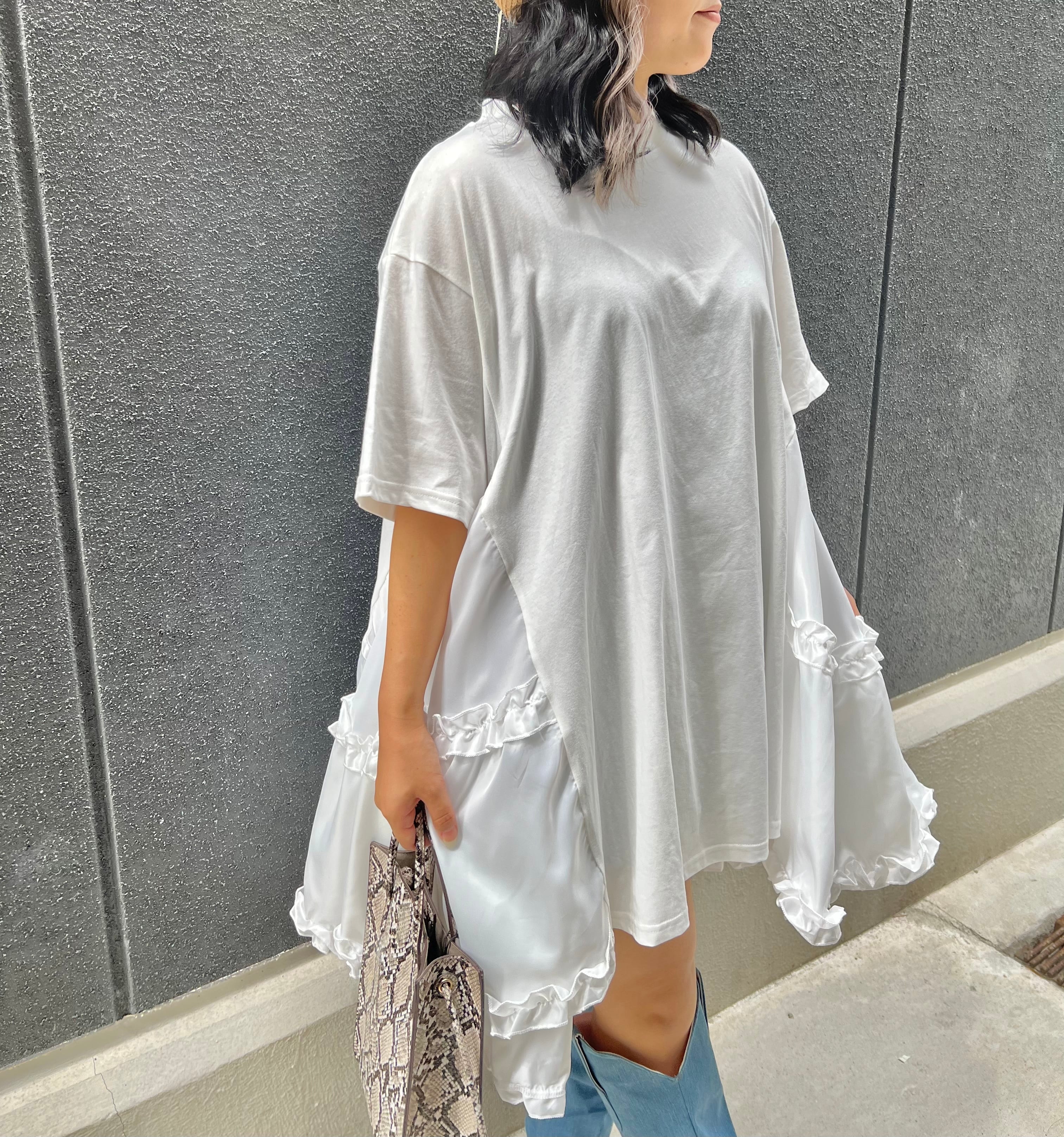 different fabric mix mini frill trimming volume flare one-piece ワンピース ワンピ 異素材 フリル ボリューム フレア