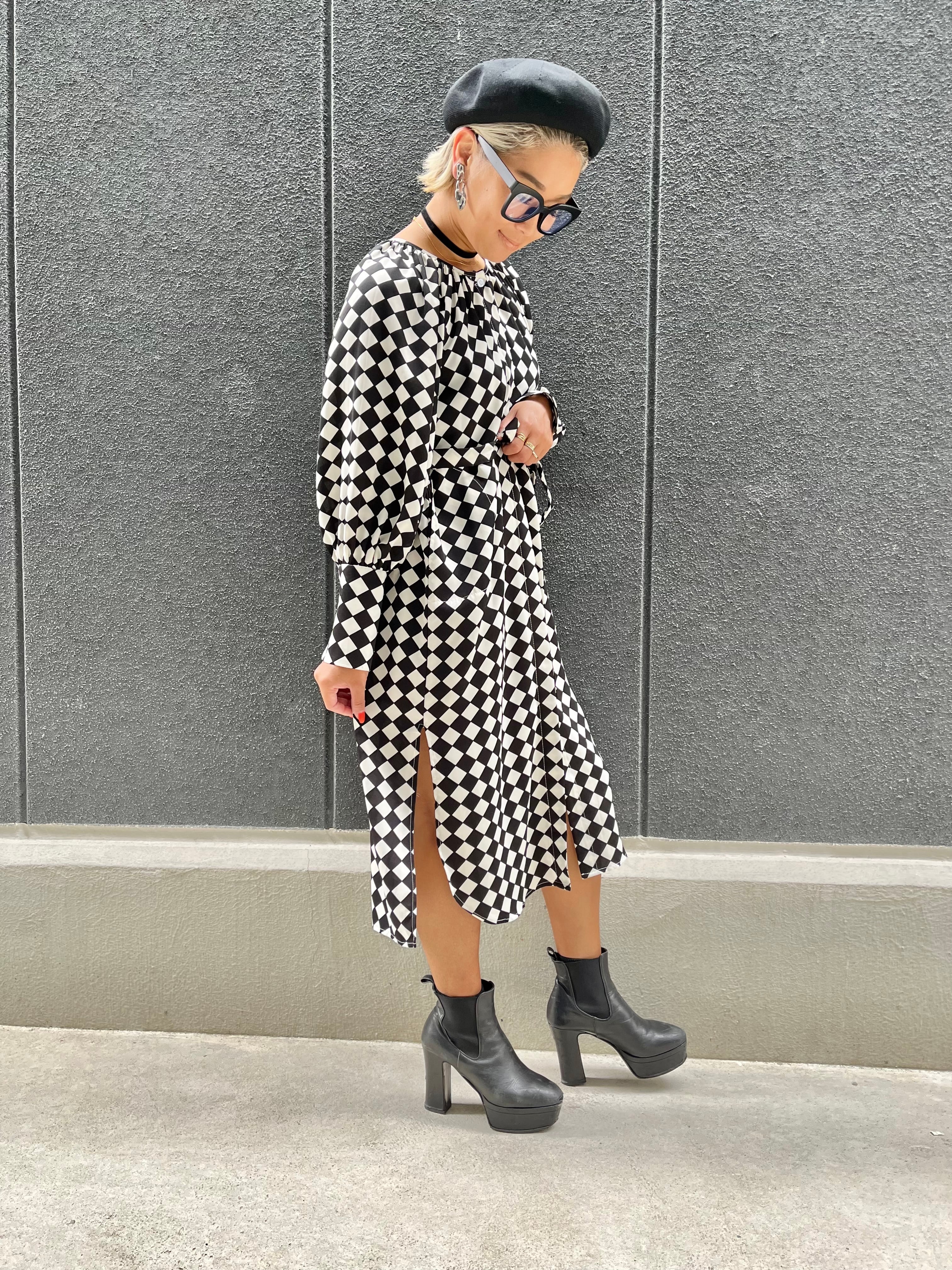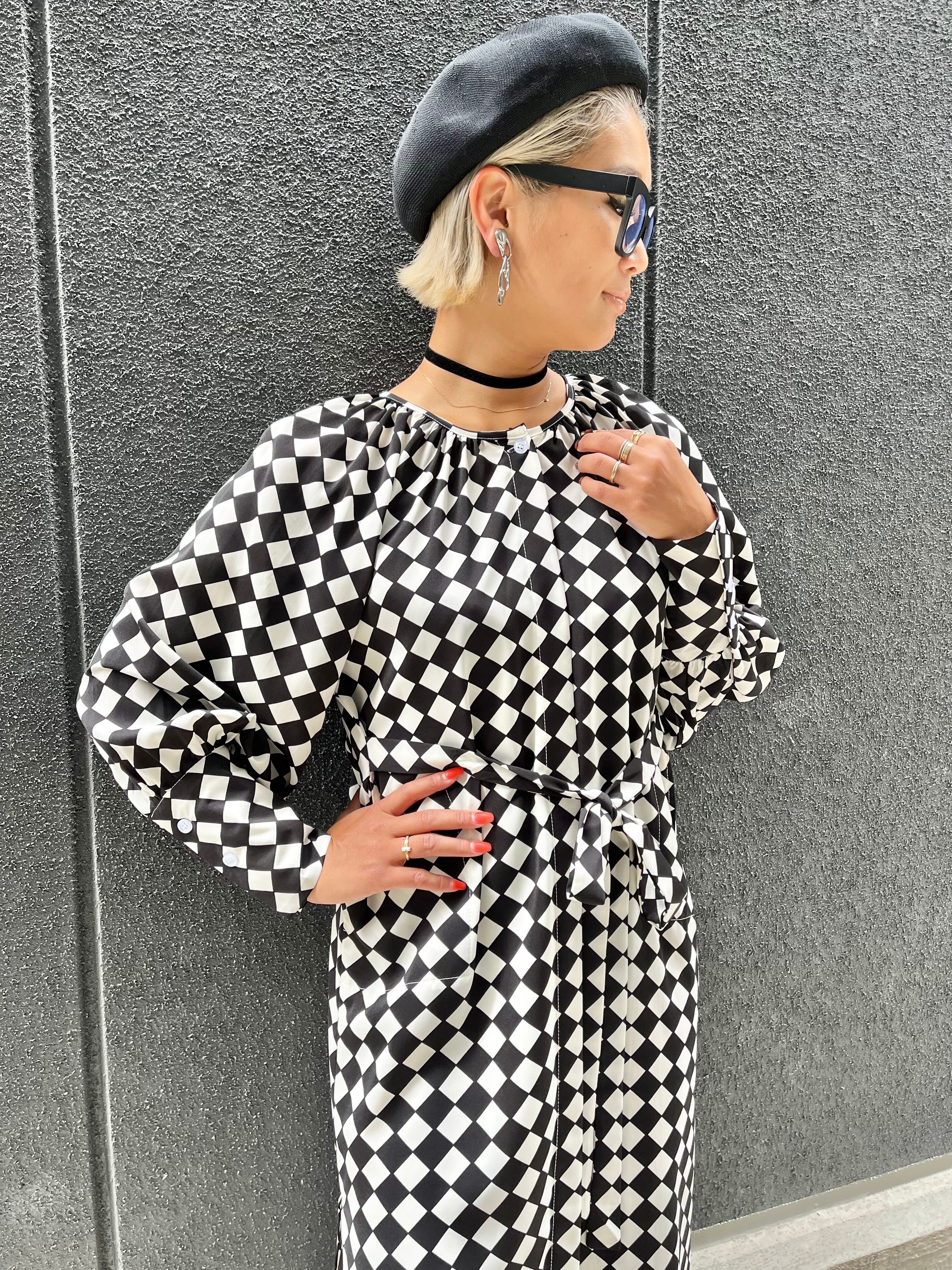 diamond check pattern belted one-piece ワンピース ワンピ ダイヤ柄 チェック ベルト 柄ワンピ 白黒