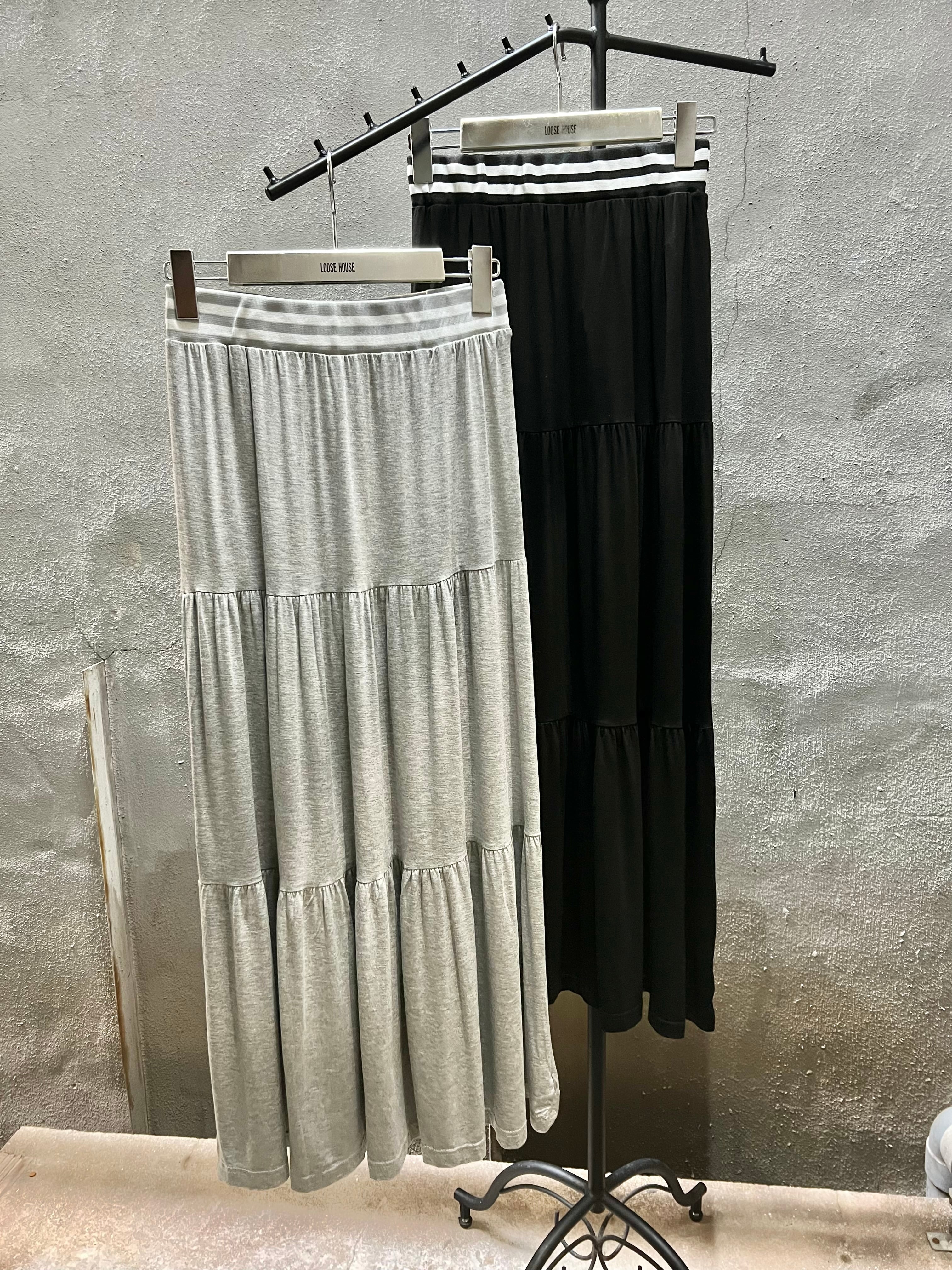 cut tiered gather long skirt スカート ロングスカート カジュアル ライン入り ゴムウエスト ティアード