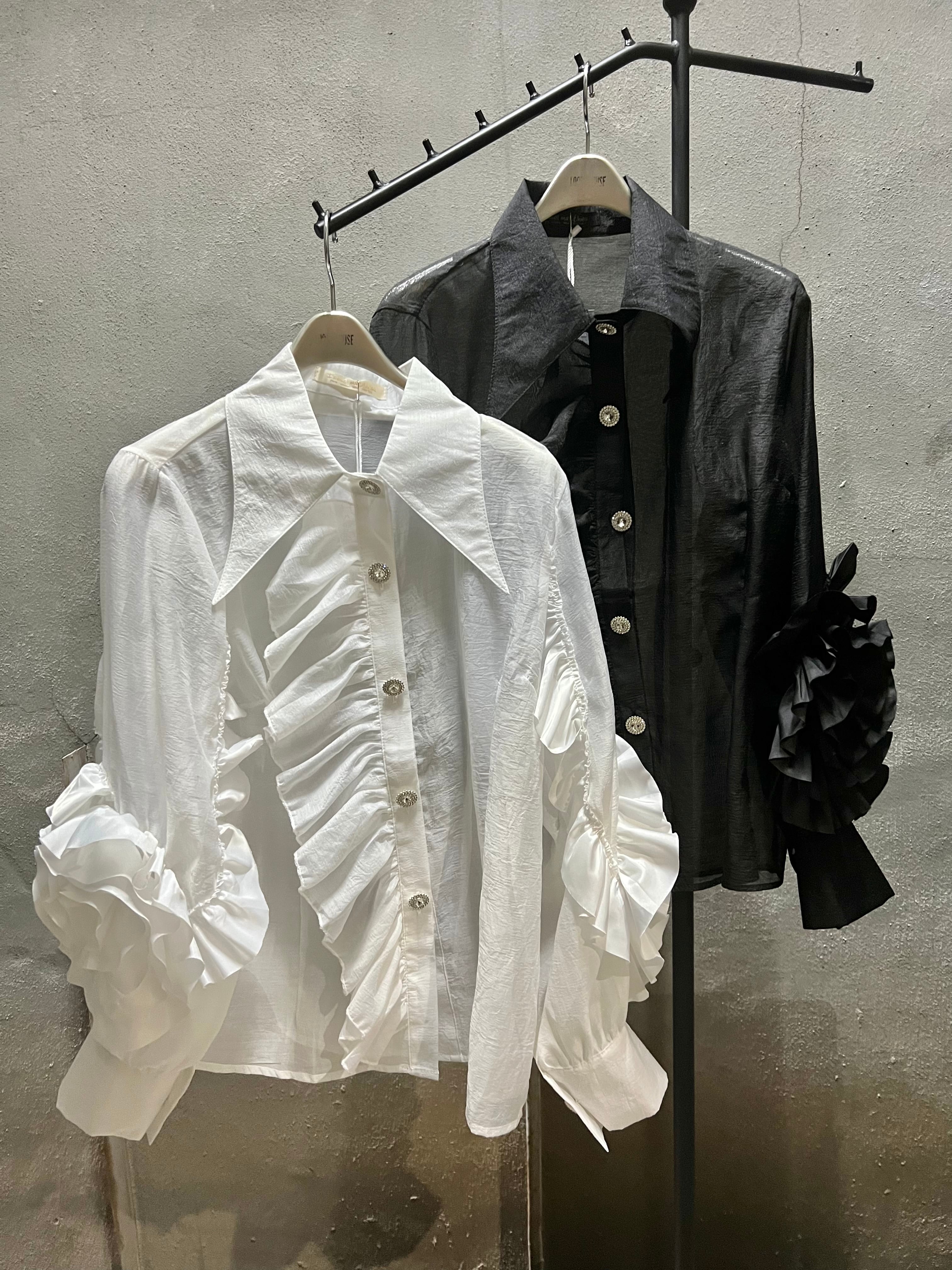 organdy touch frill flower motif sleeve design shirt シャツ ブラウス フリル フラワー ストーン カラフル カラバリ オーガンジー