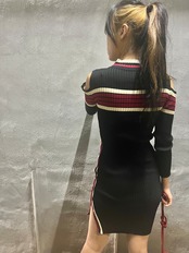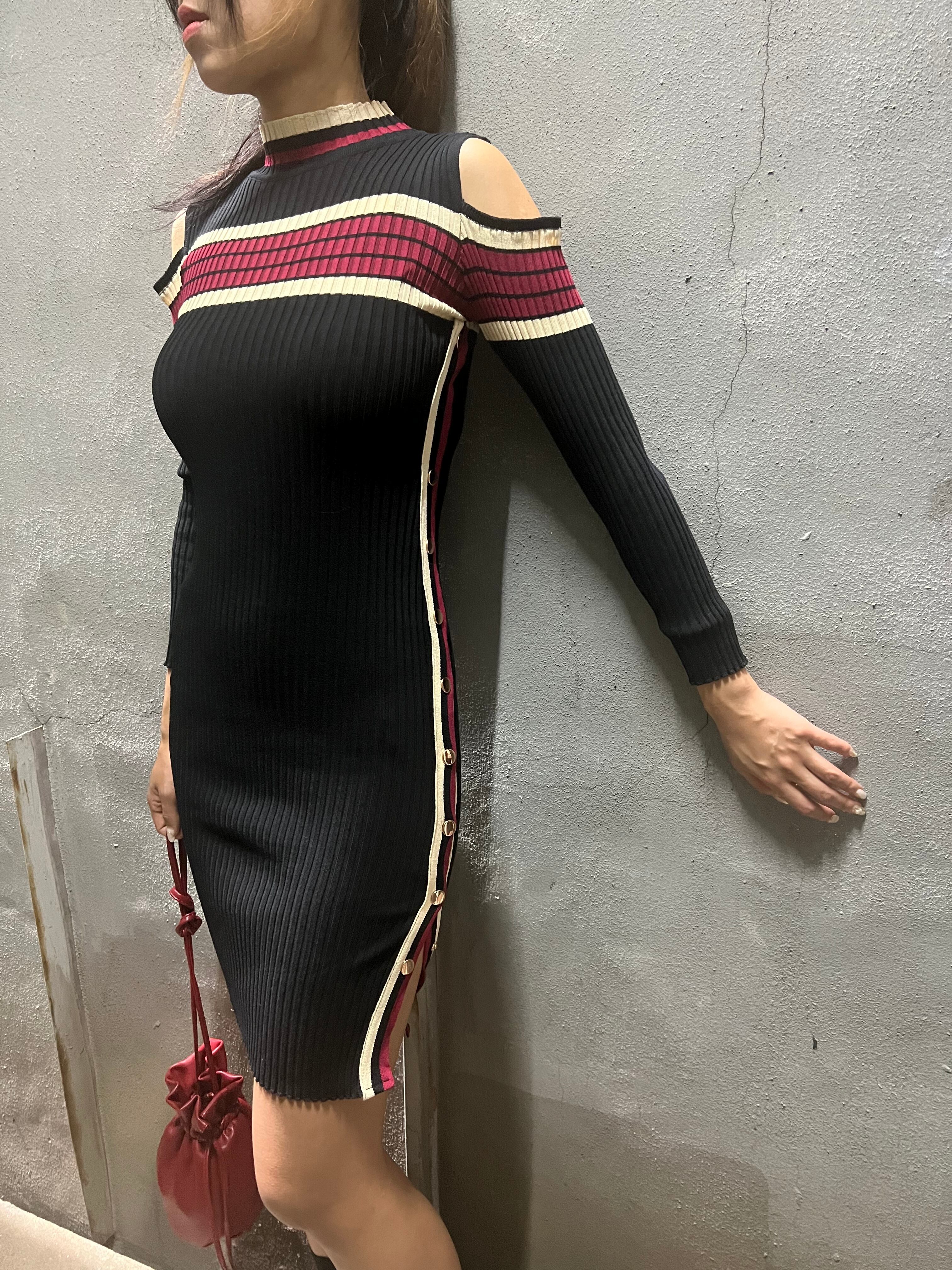 lib knit red line open shoulder one-piece ワンピース ワンピ ニットワンピ リブニット ライン入り 肩開き スリット 金ボタン タイト