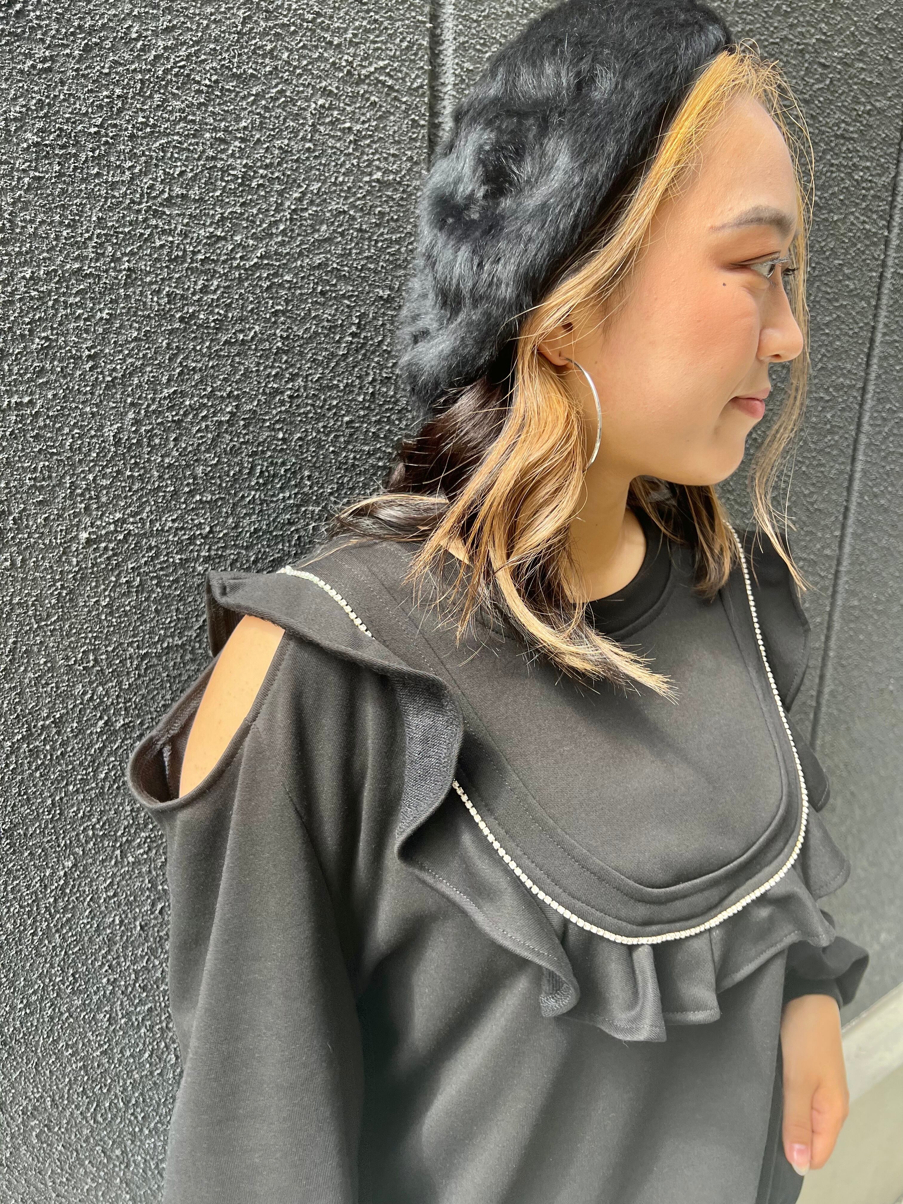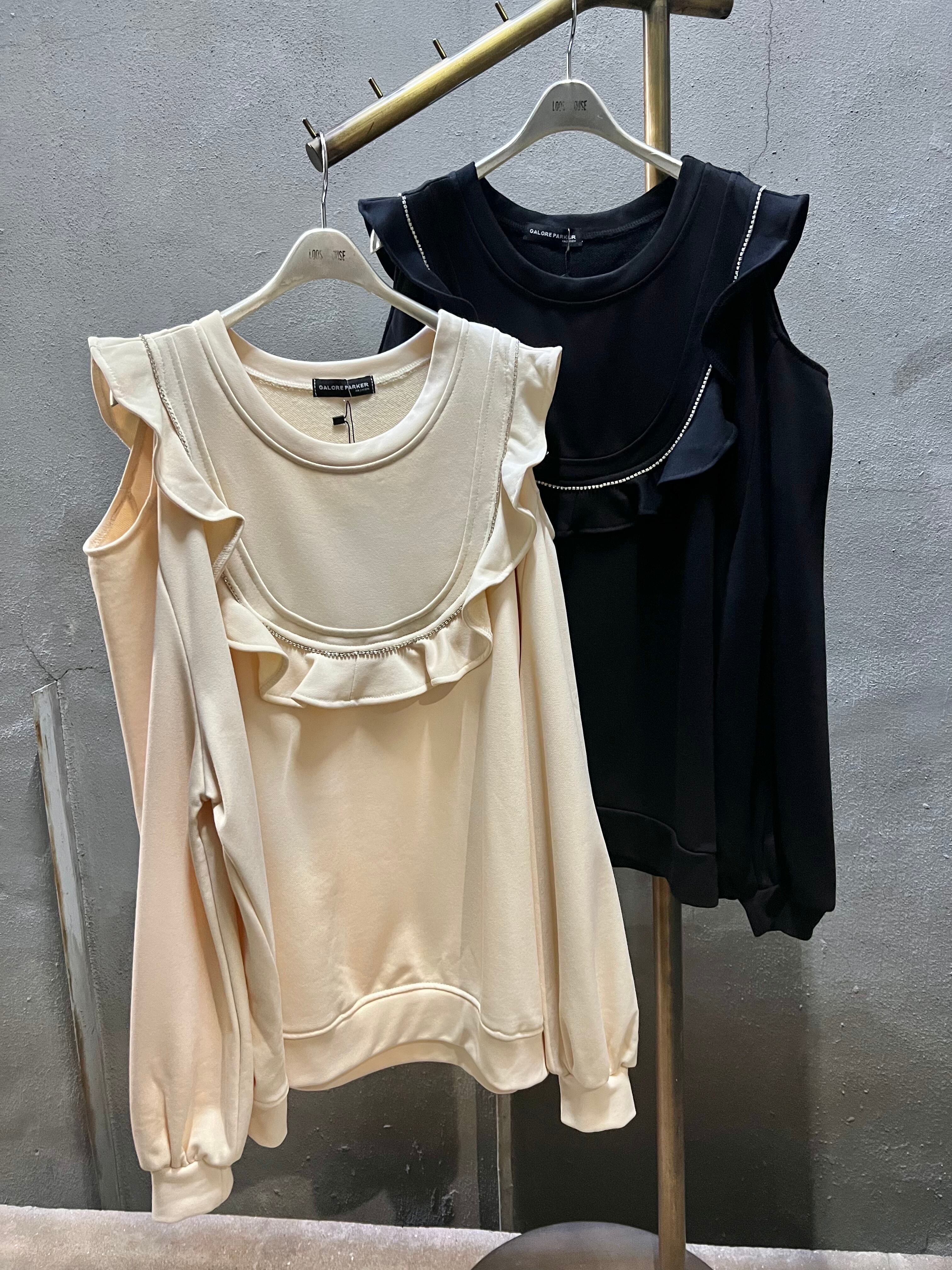 frill ・ stone trimming open shoulder pullover tops トップス プルオーバー スウェット フリル 肩開き オーバーサイズ