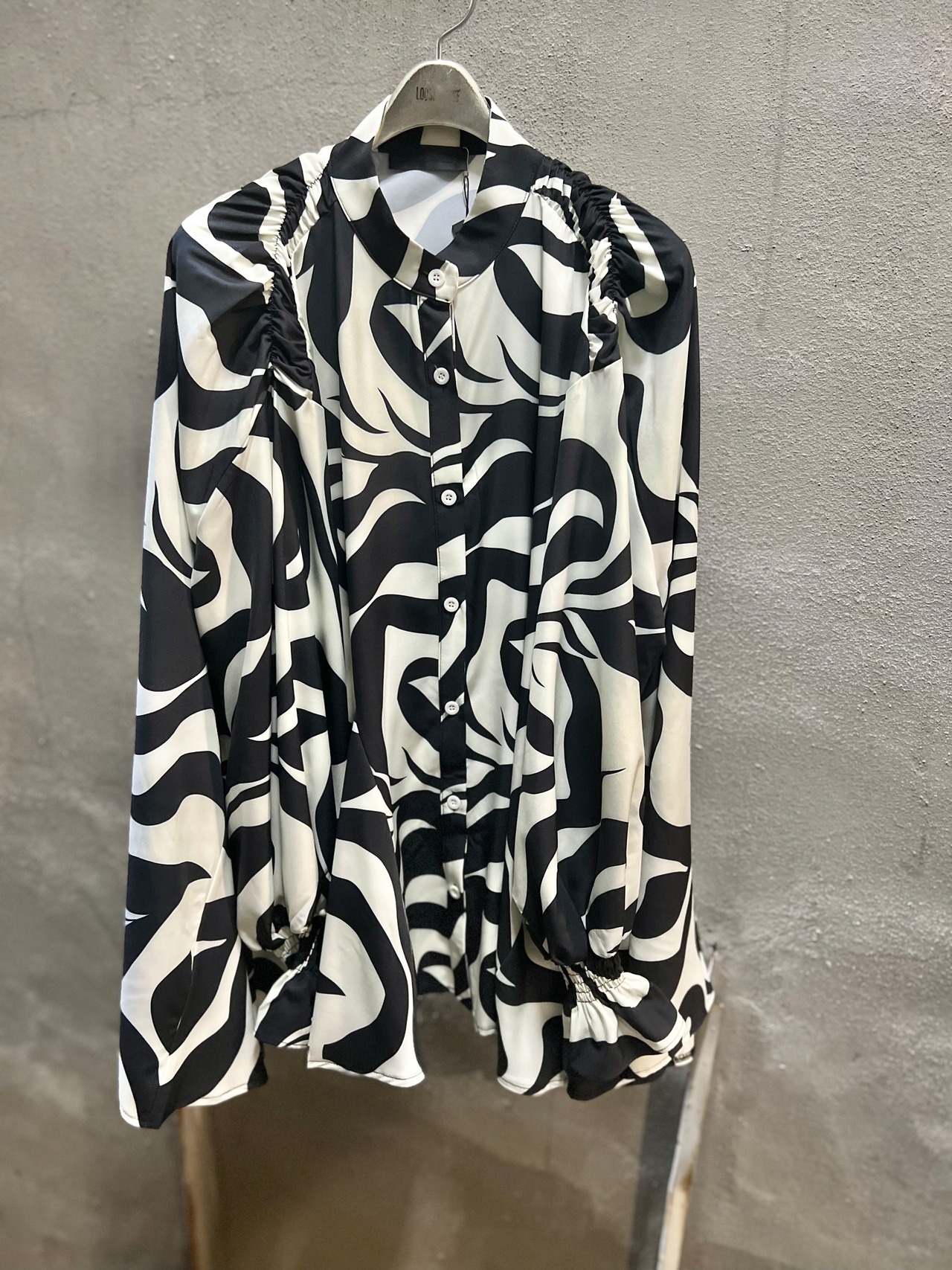 bi-color print volume flare shirt tunic シャツ ミニワンピ チュニック フレアー フリル デザインワンピ バイカラー 白黒
