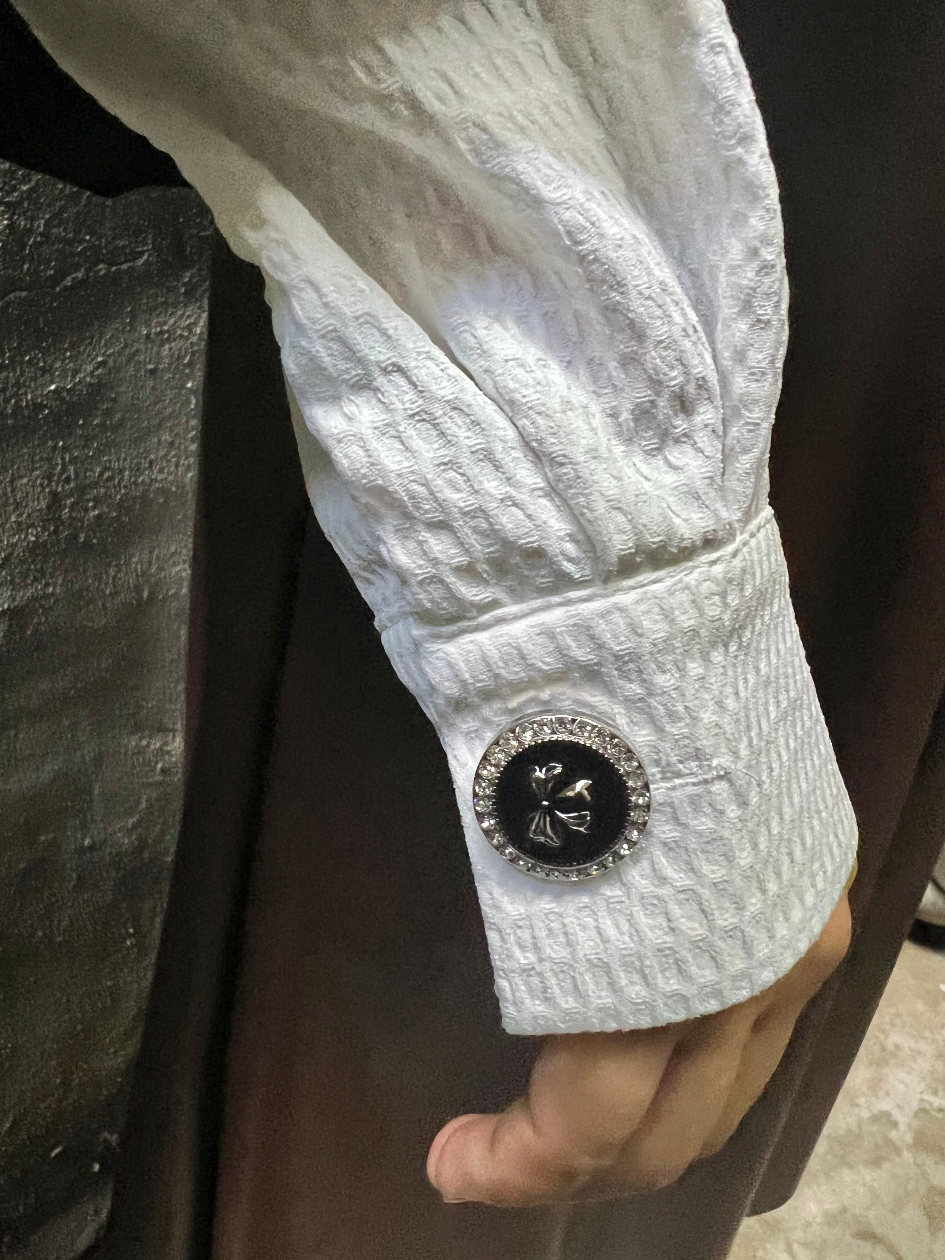 ホワイトシャツのセンターに付いているボタンにも注目です♪