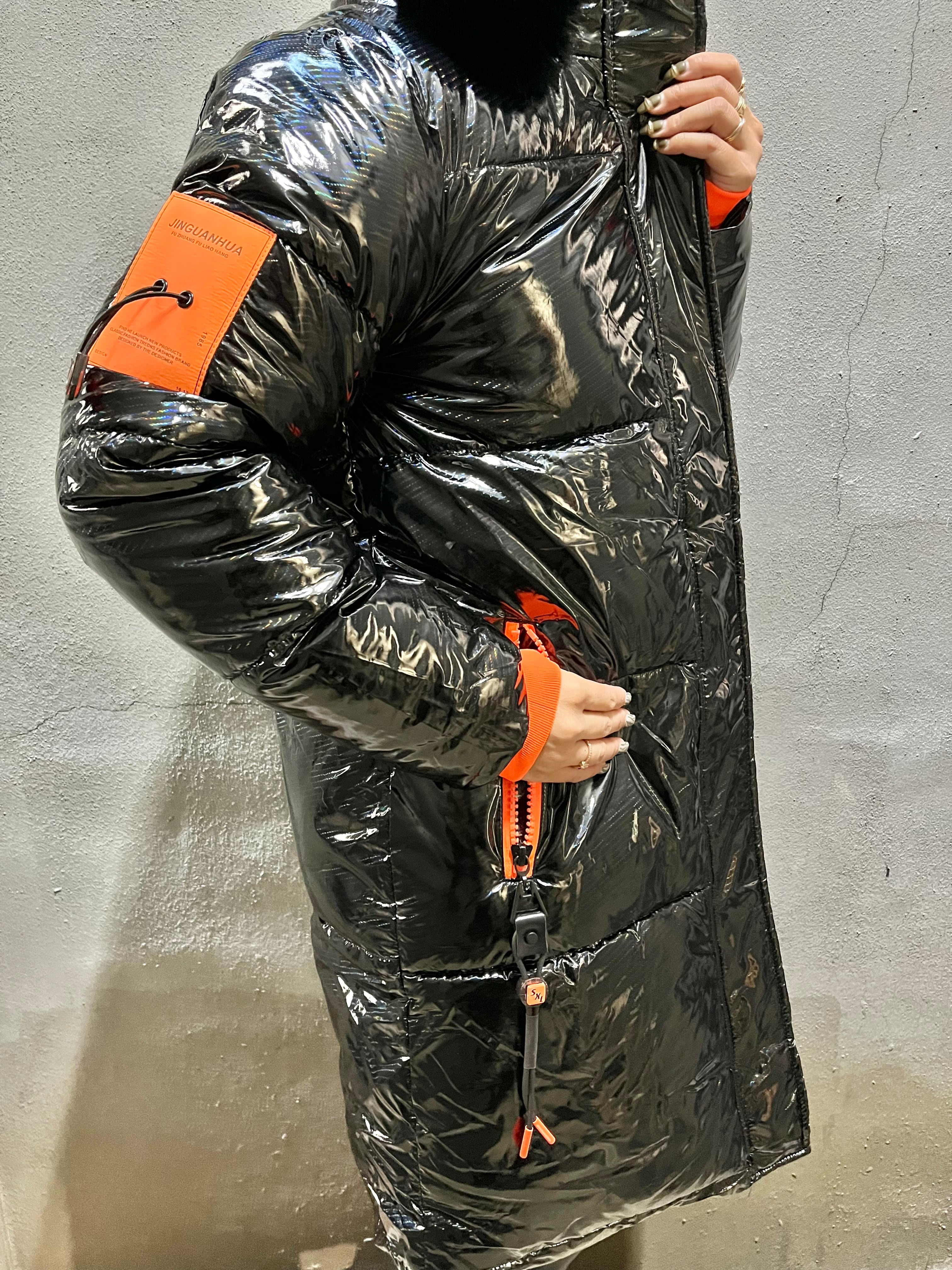 光沢のあるエナメル・オーロラ素材の中綿コート