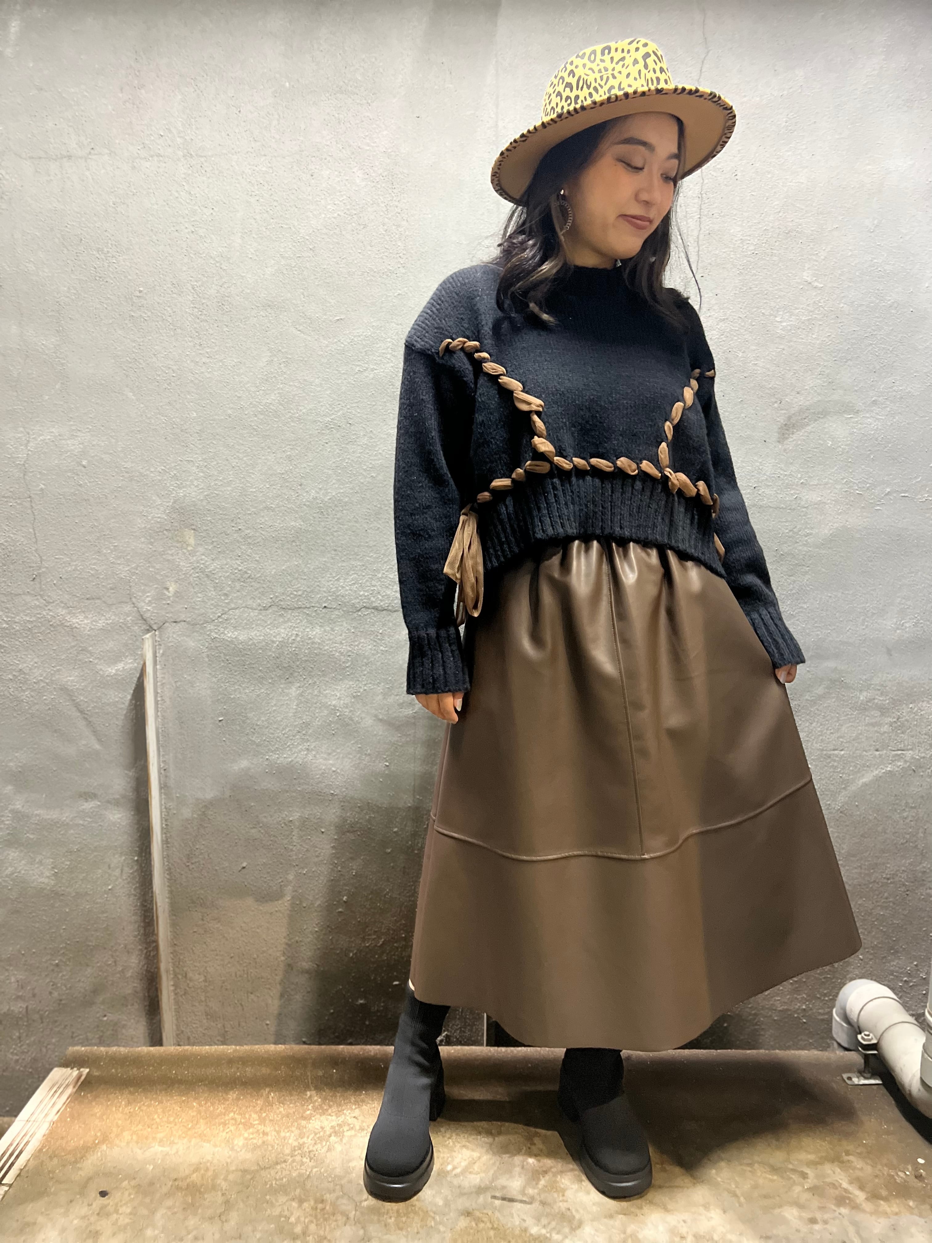 brown ribbon knit sweater ニット セーター トップス ニットトップス リボン バイカラー ショート丈