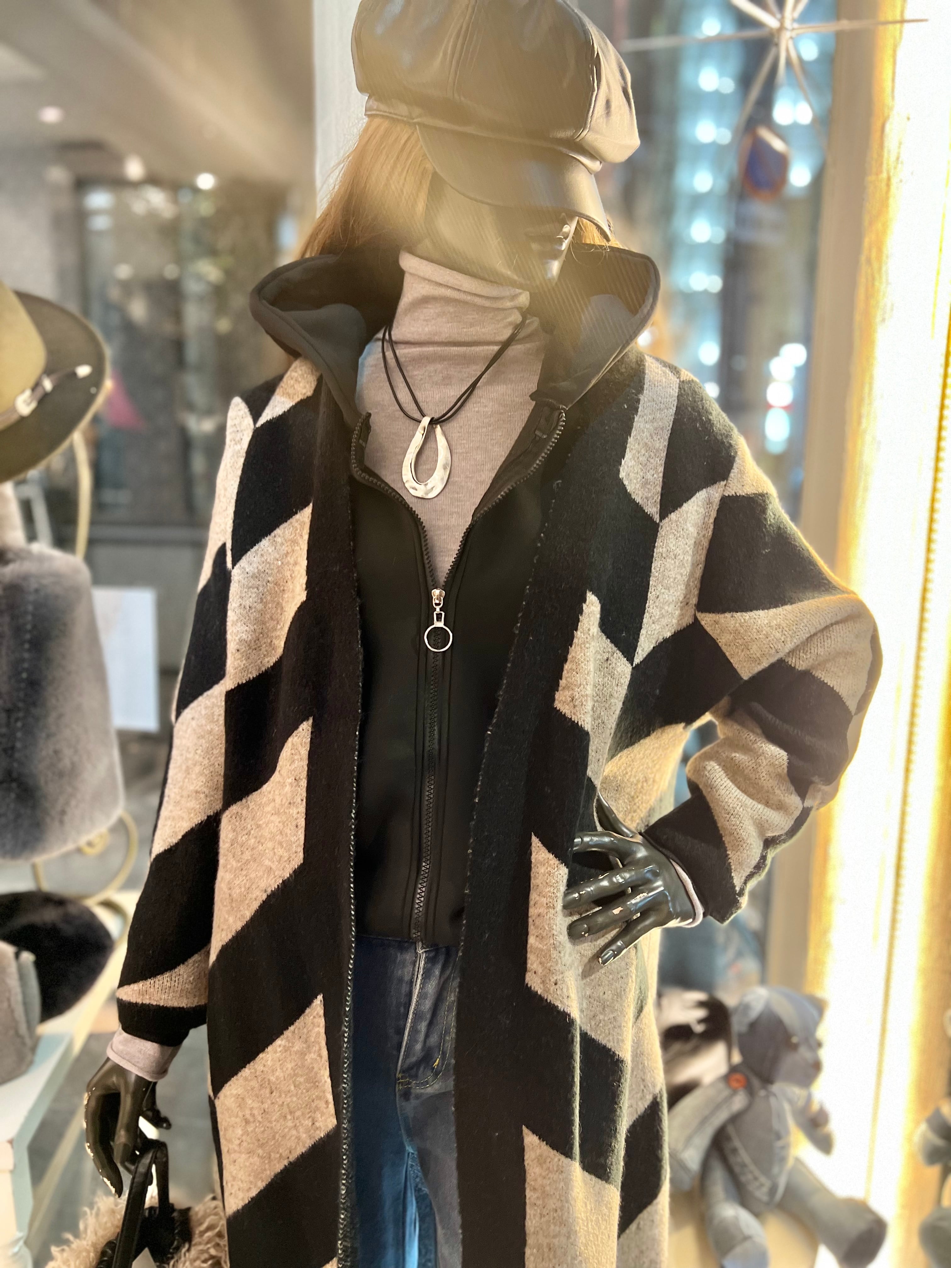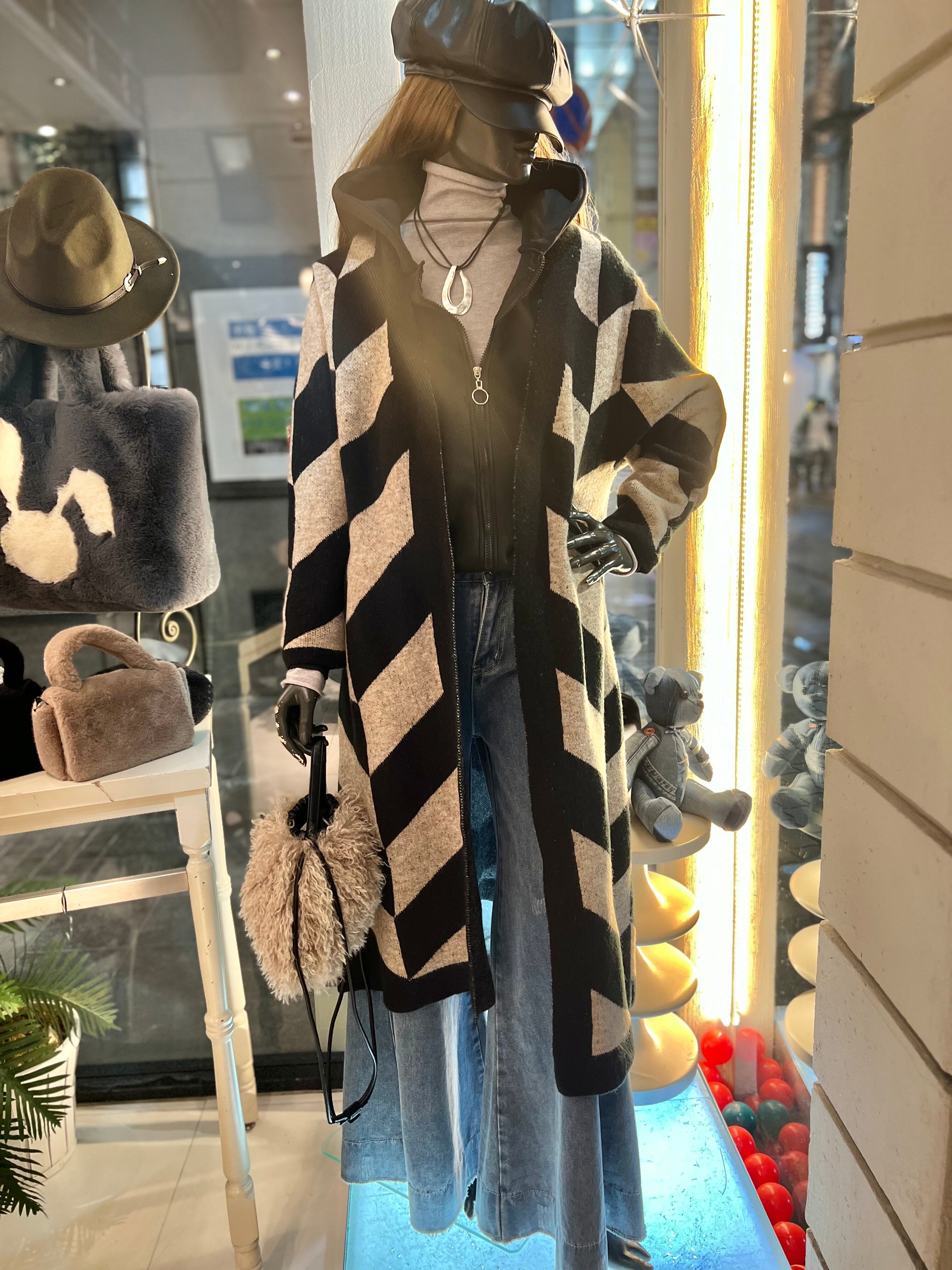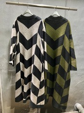 ヘリンボーン柄のロング丈ニットカーディガン。