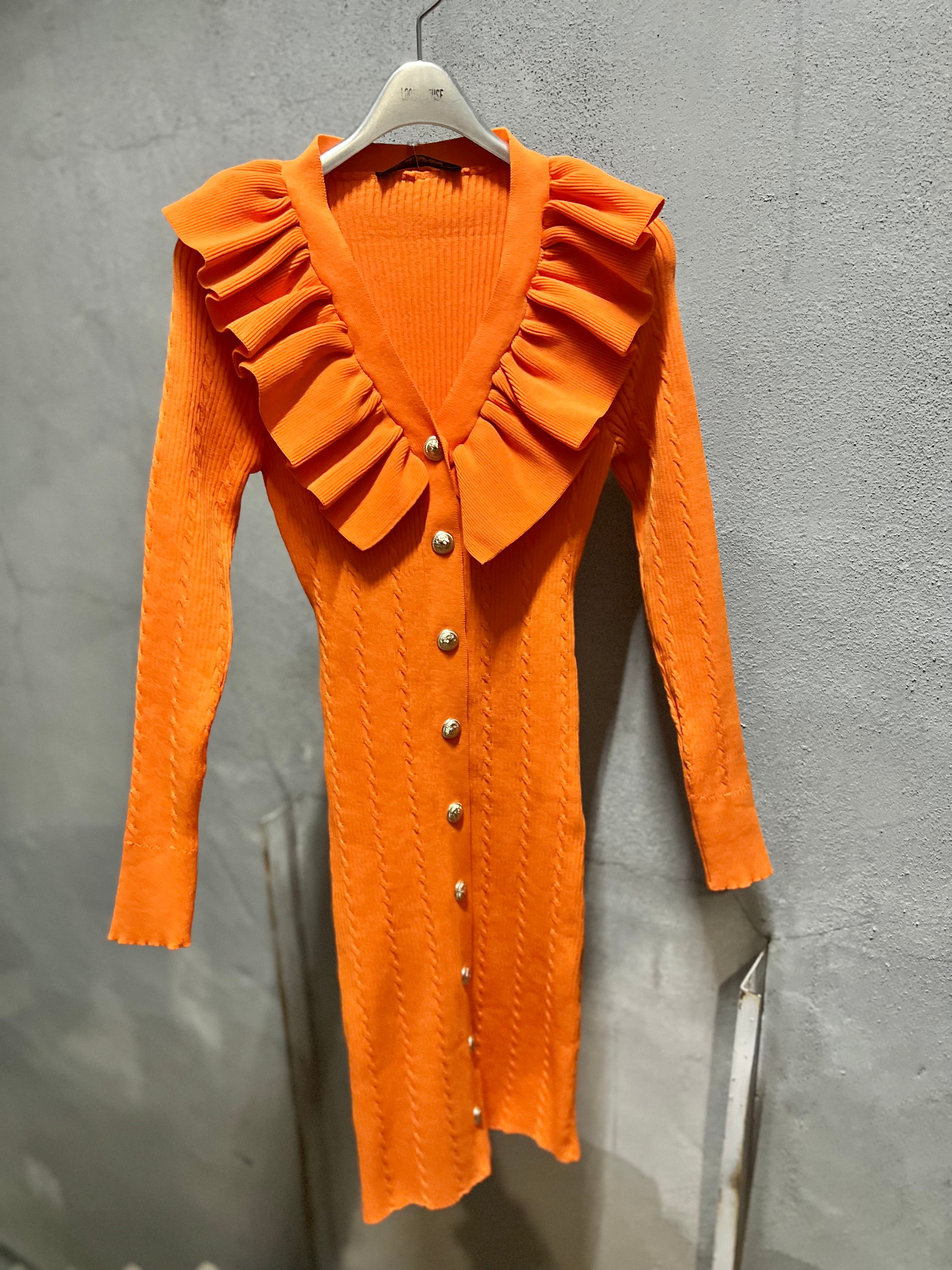 frill × gold button V-neck tight one-piece ワンピース タイト ニット フリル 金ボタン 細身 ぴったりめ