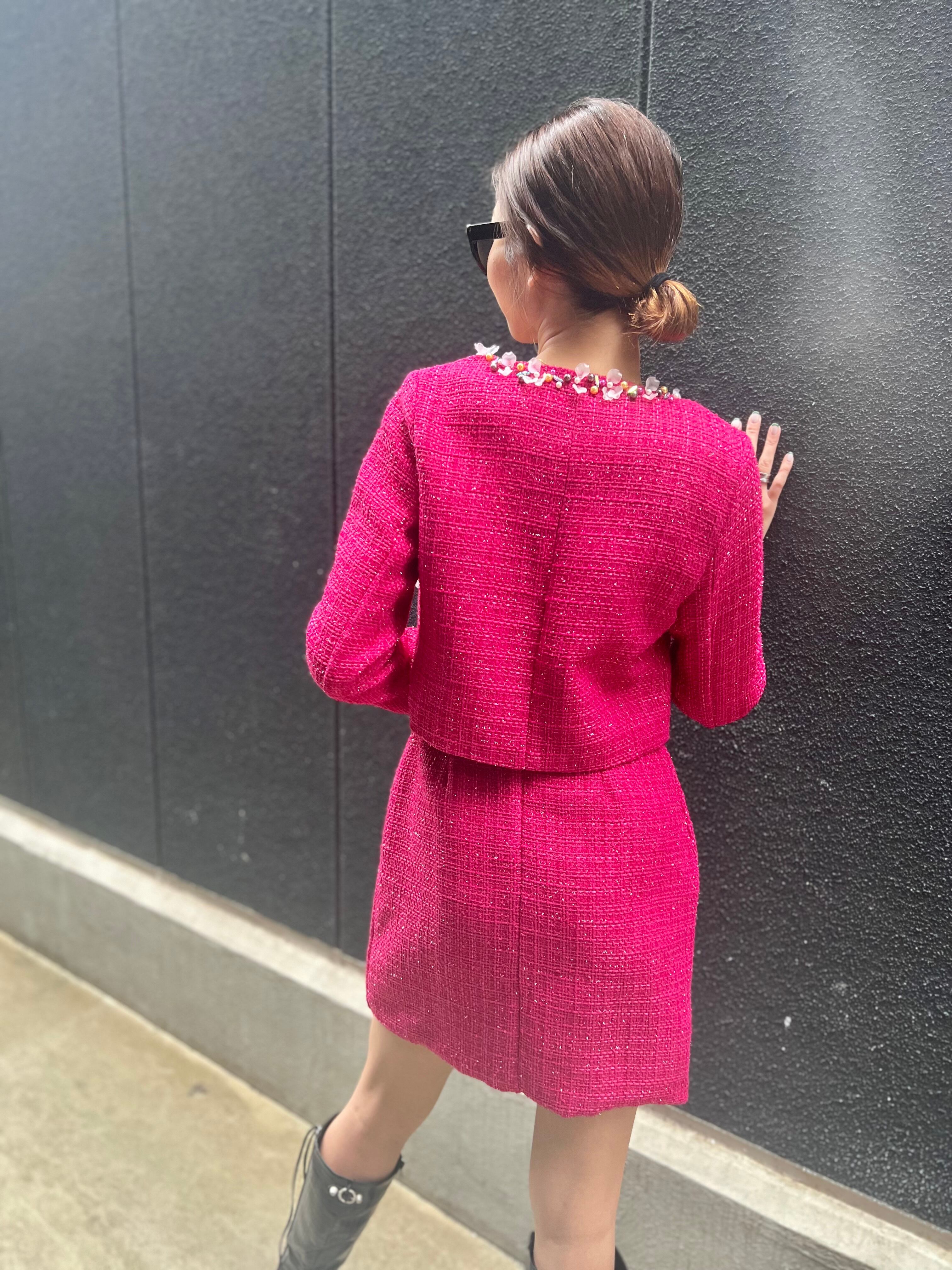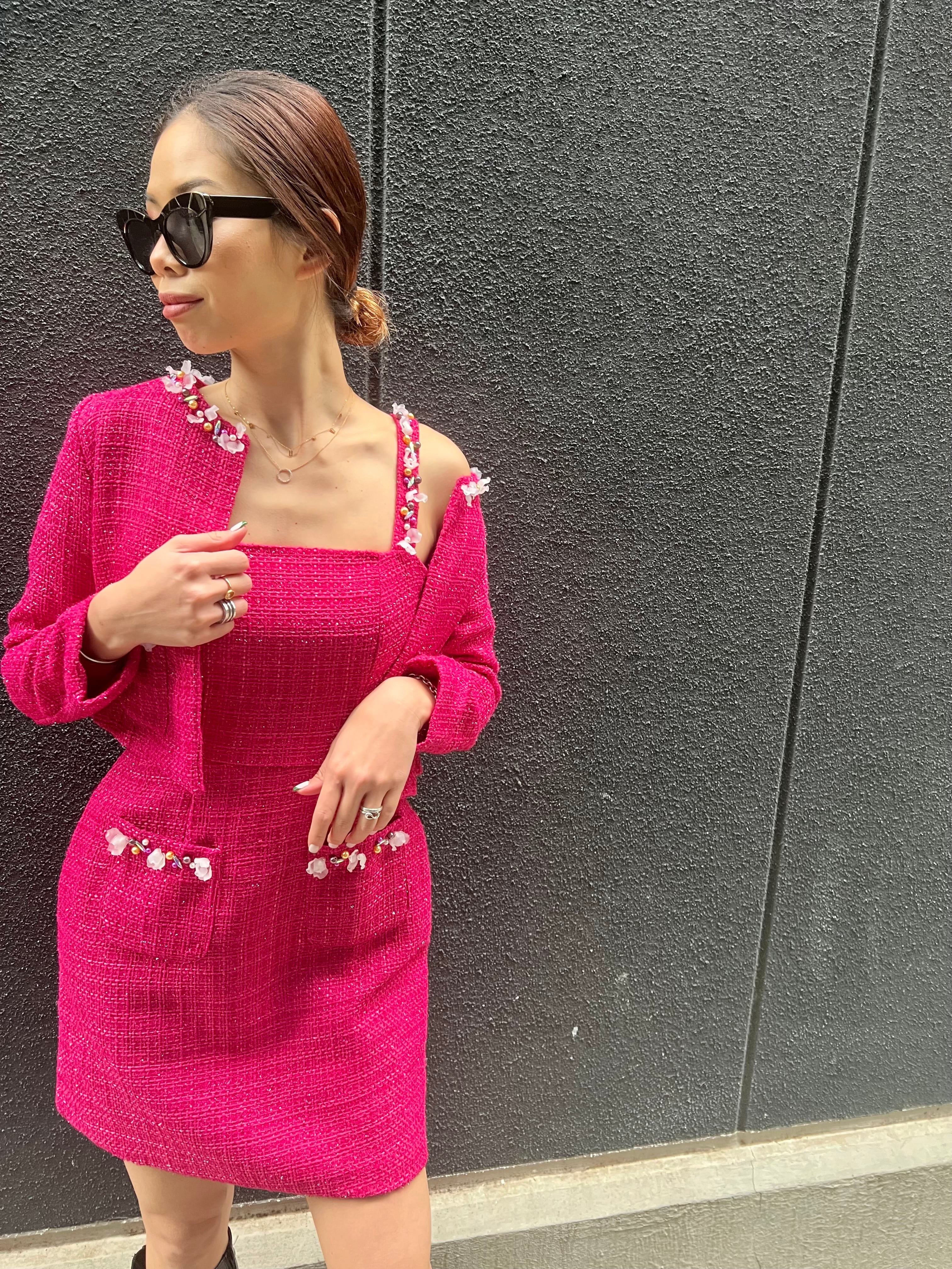 tweed flower bijou trimming design jacket × one-piece set upツィード ワンピース ジャケット アンサンブル 花びら ビーズ 刺繍