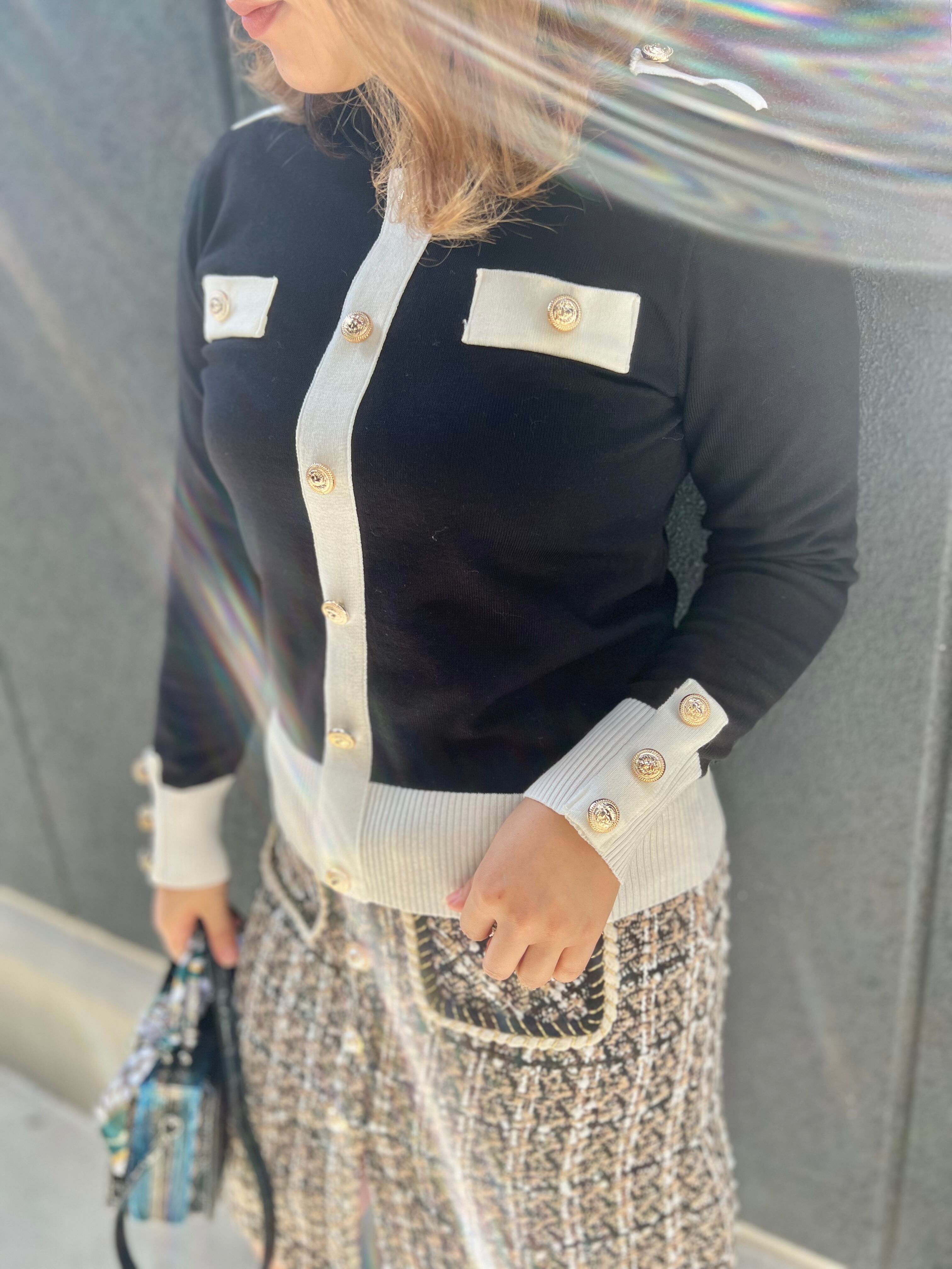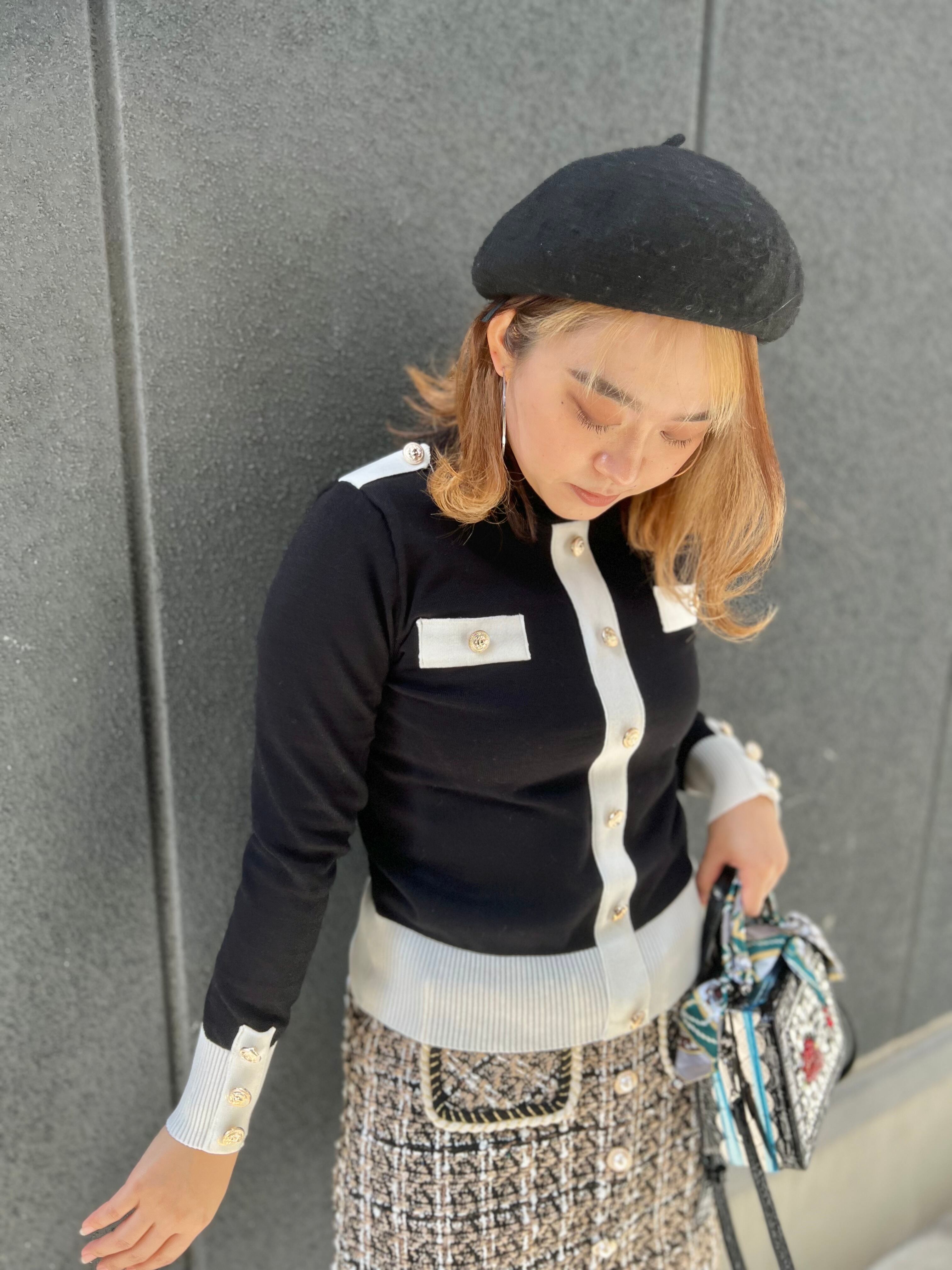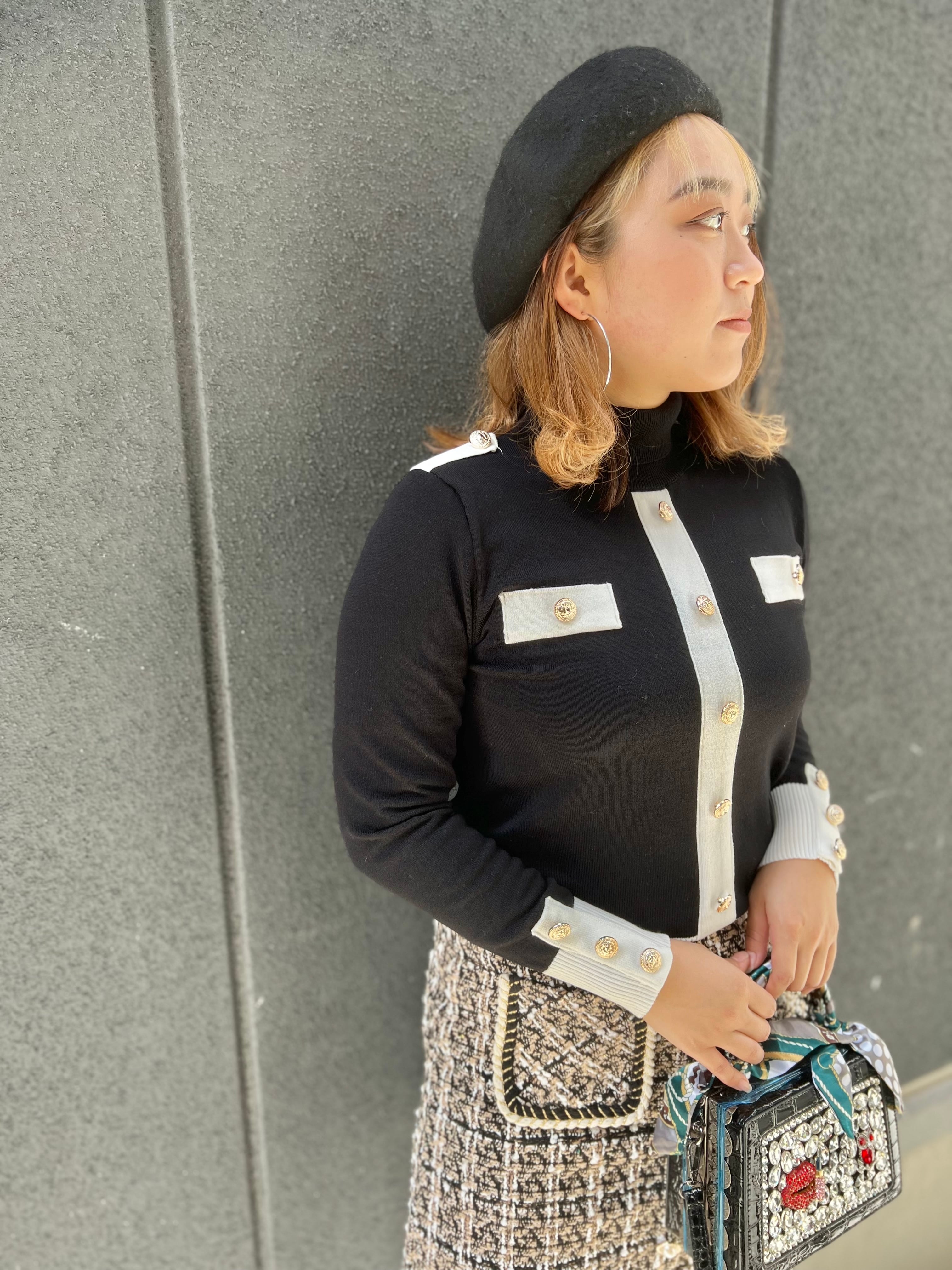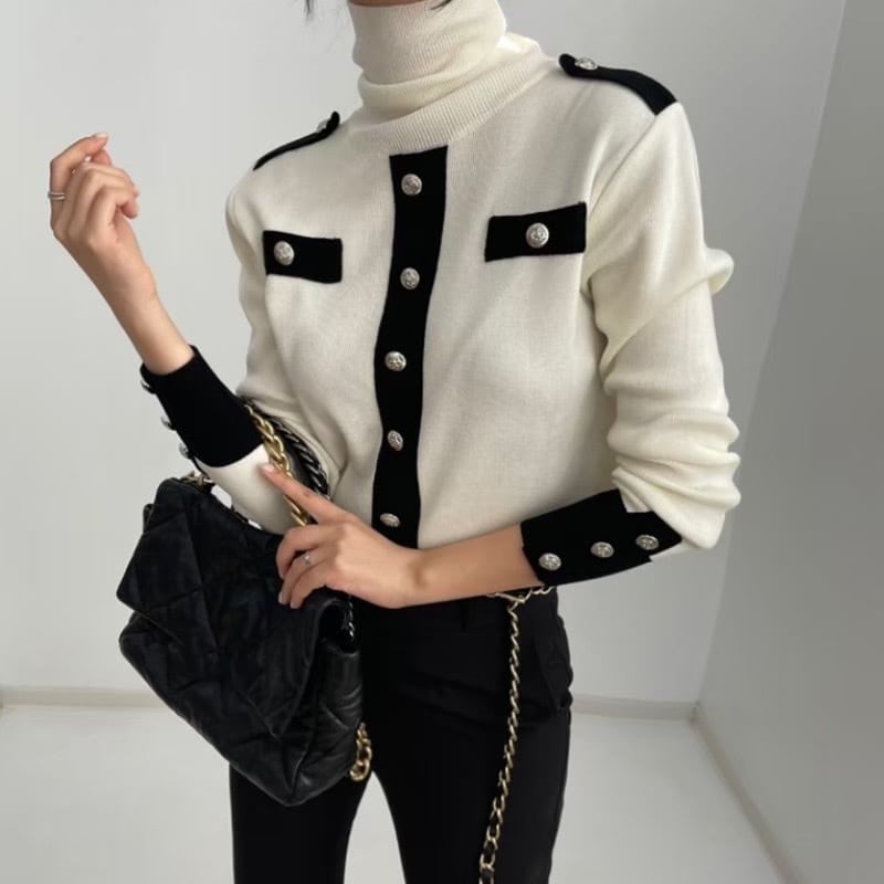 bi-color line change gold button high neck knit tops ニット トップス ハイネック バイカラー 白黒 金ボタン
