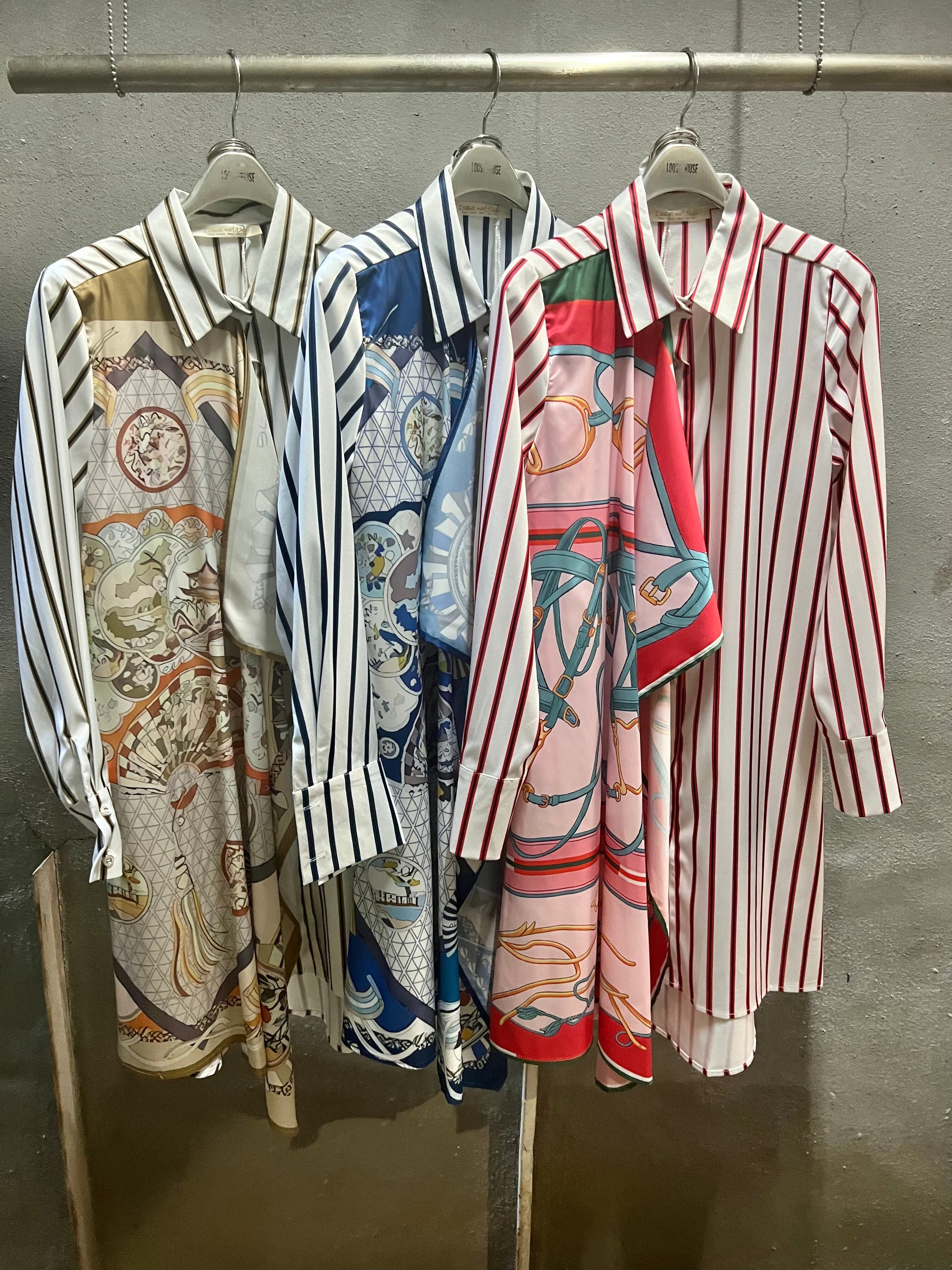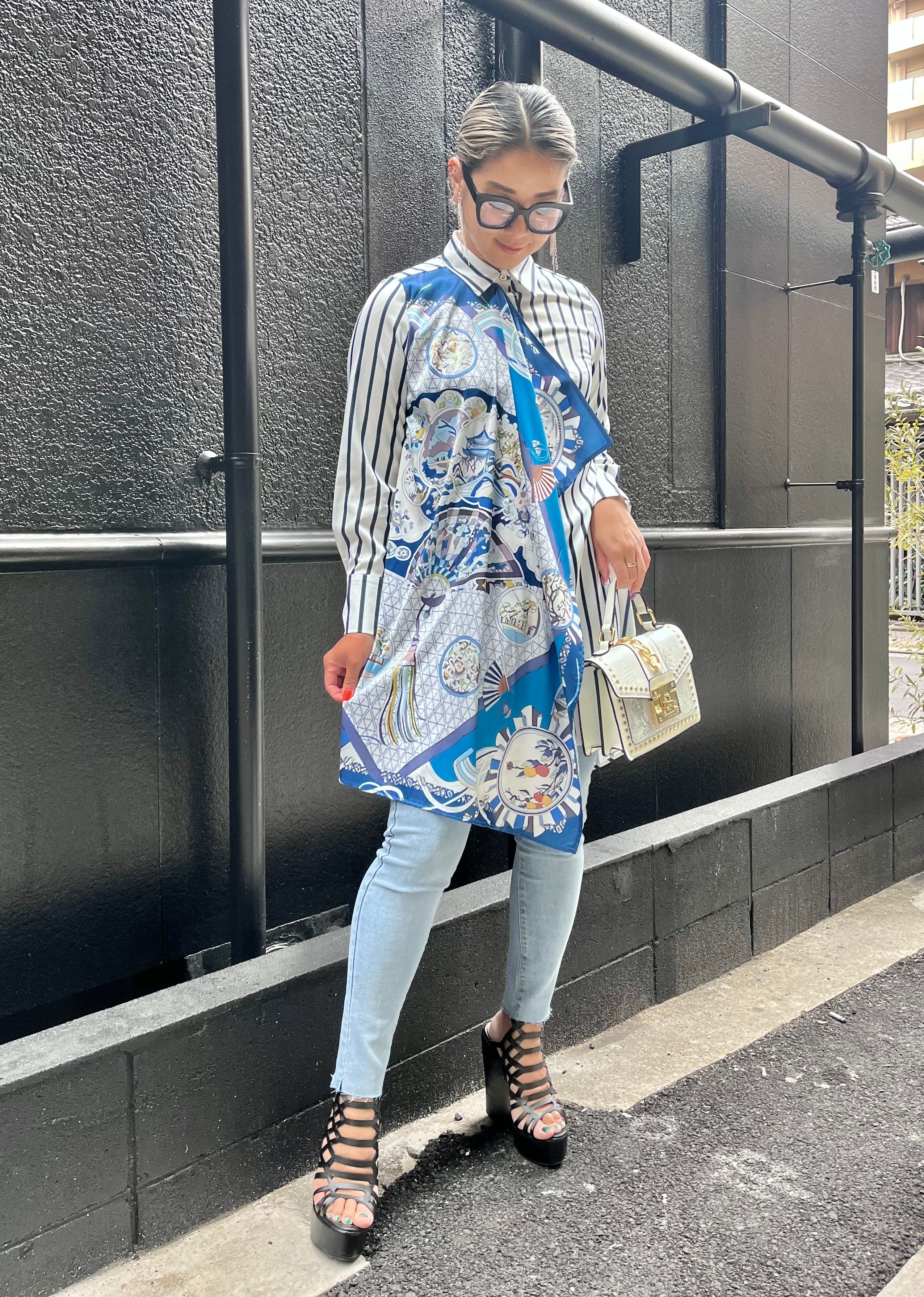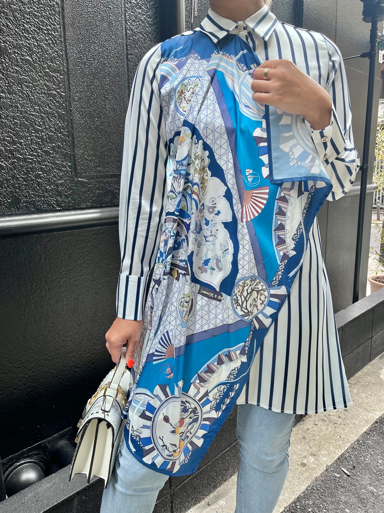 stripe pattern ・ scarf asymmetry shirt one-piece シャツ ロングシャツ シャツワンピース ワンピース ストライプ スカーフ