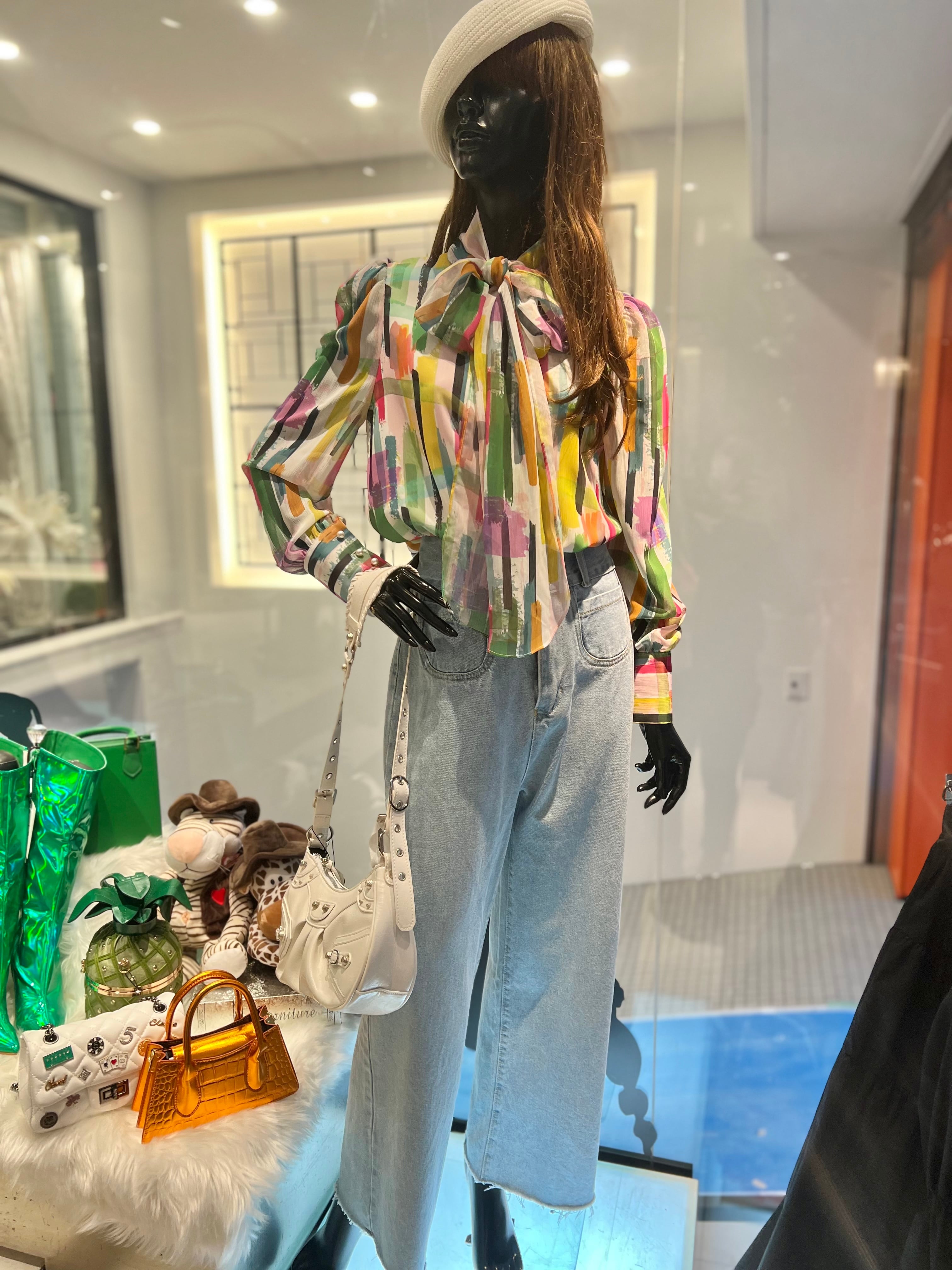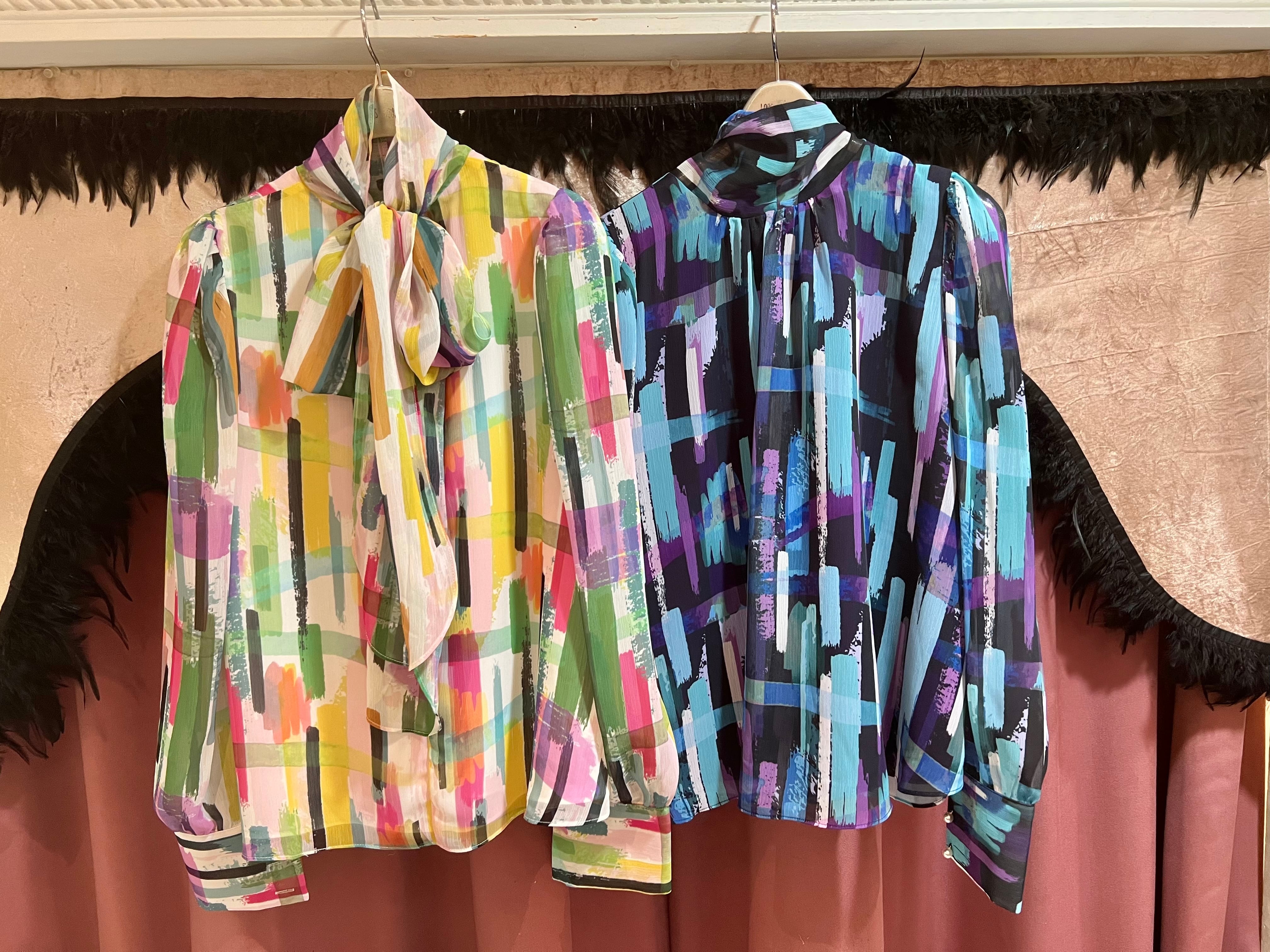 print chiffon bow-tie tops トップス シフォン ボウタイ リボン デザイントップス 柄 春 カラフル