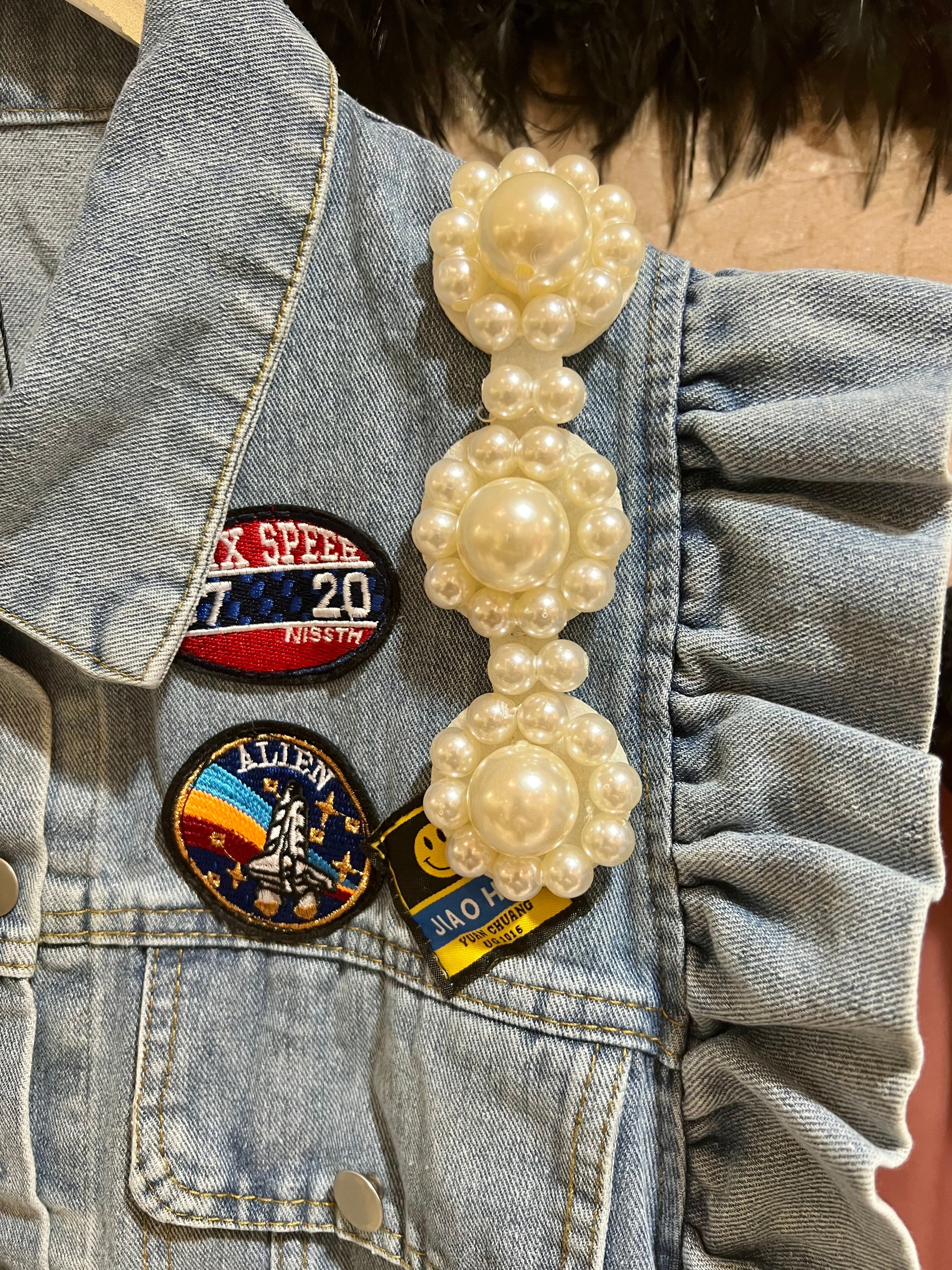 frill × big pearl deco denim vest ベスト デニム デニムベスト パール ワッペン フリル