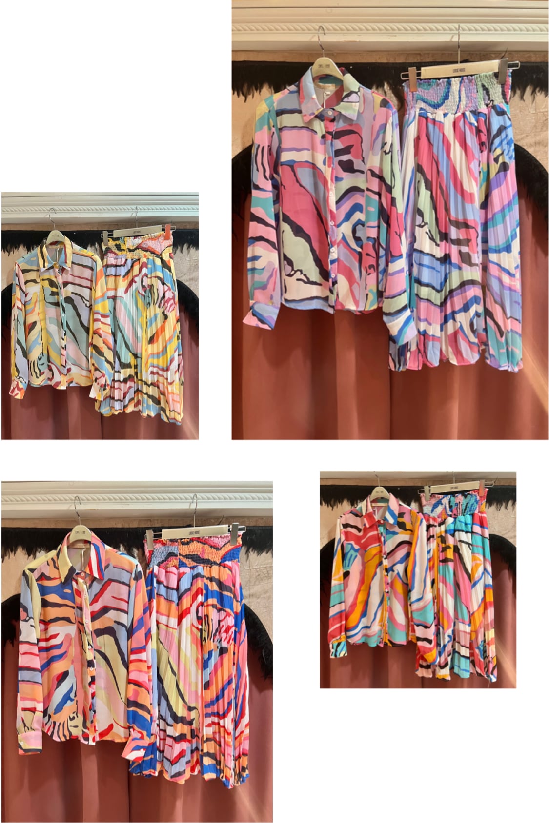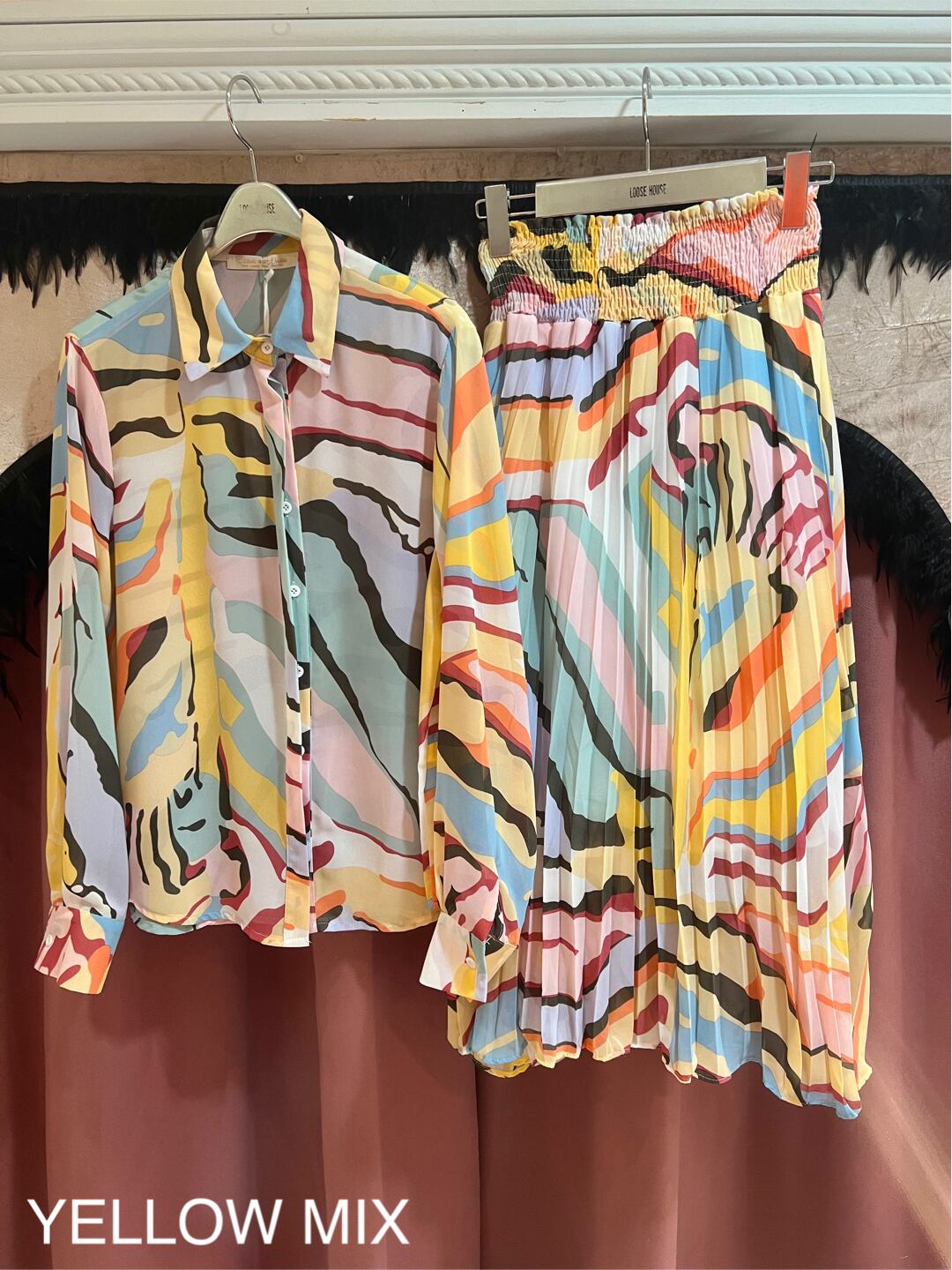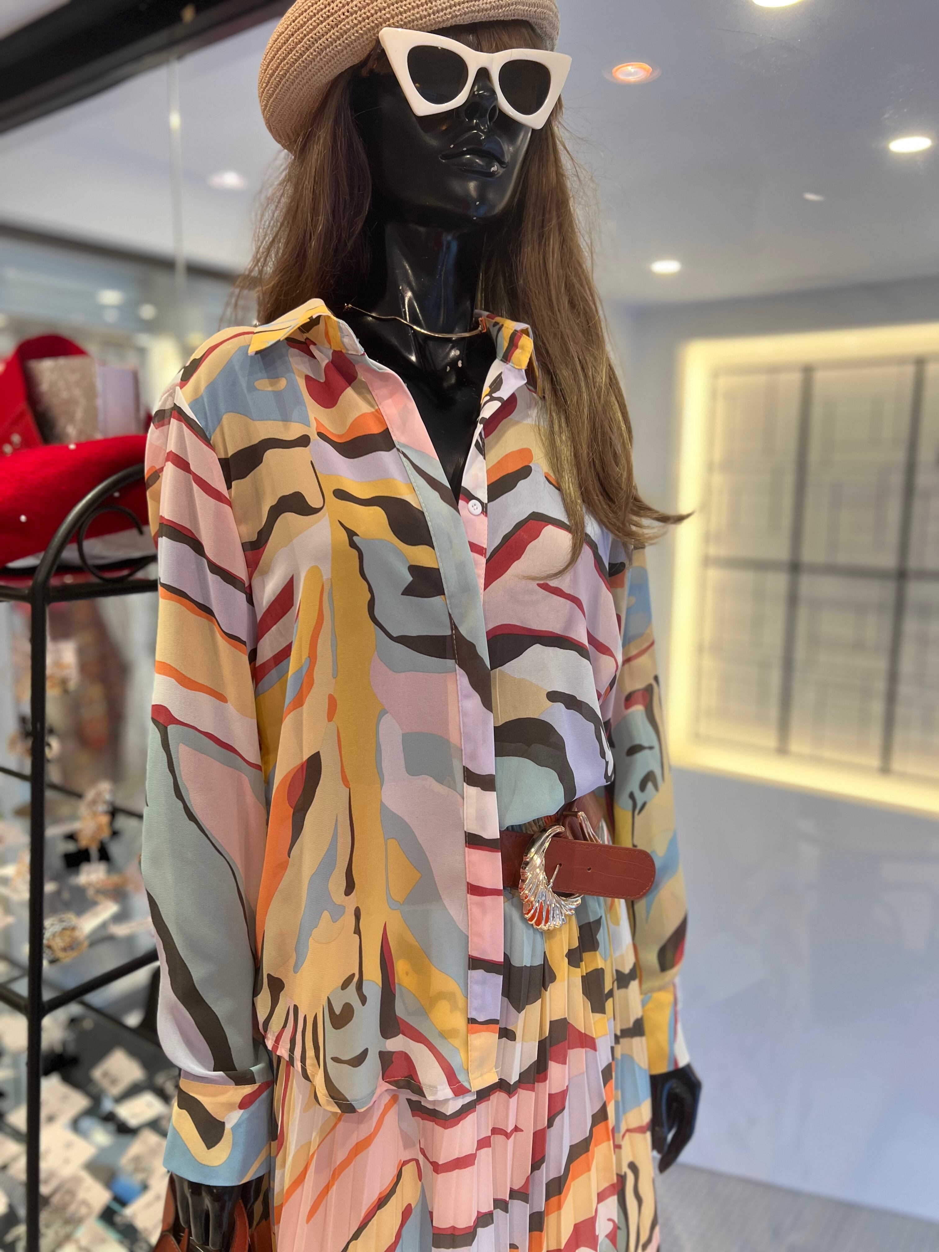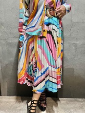 mix color print chiffon shirt × skirt set up 2P セットアップ 2点セット シャツ スカート シフォン プリント カラフル 着回し カラバリ