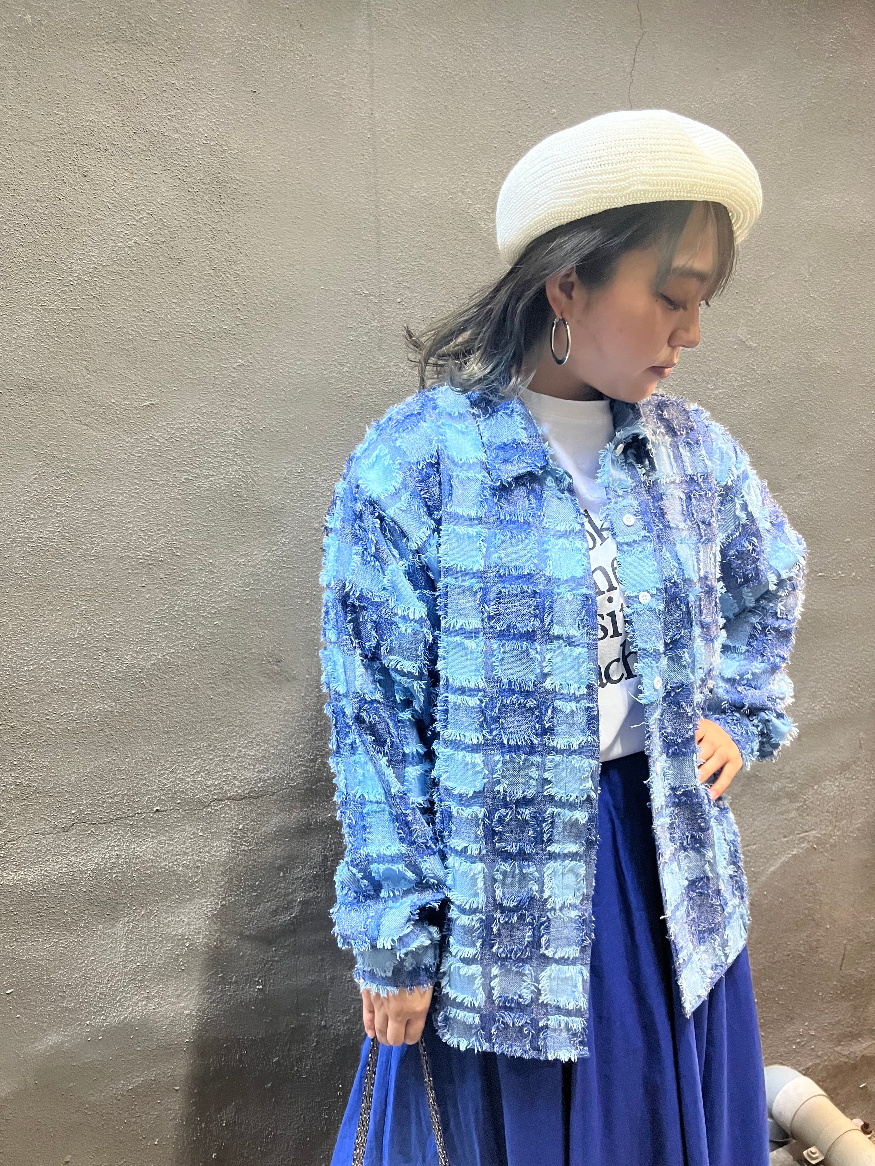 fringe check over size shirt シャツ フリンジ チェック オーバーサイズ ブルー
