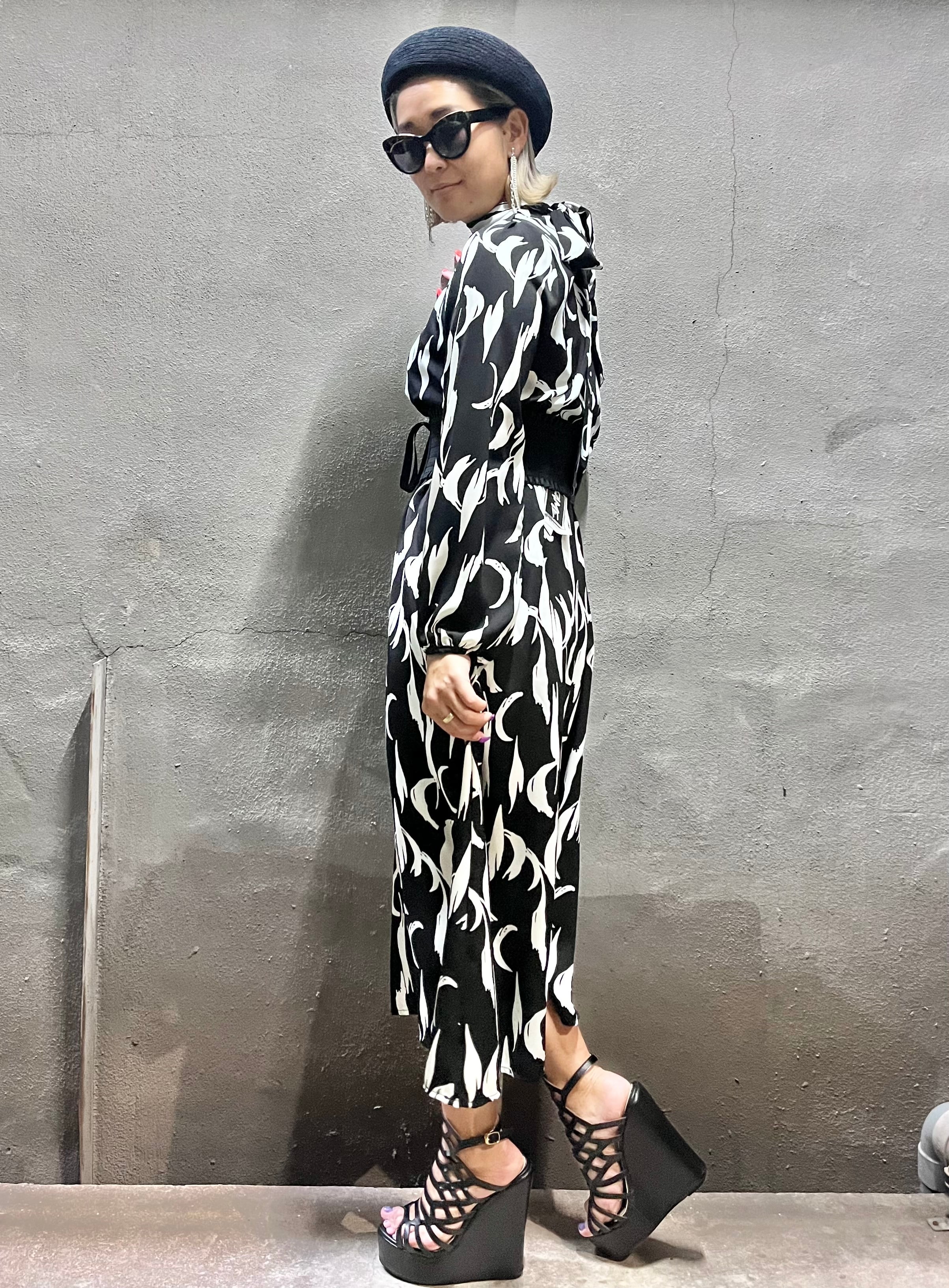 bi-color print back ribbon design one-piece ワンピース ロングワンピ バイカラー 白黒 リボン ハイネック きれいめ