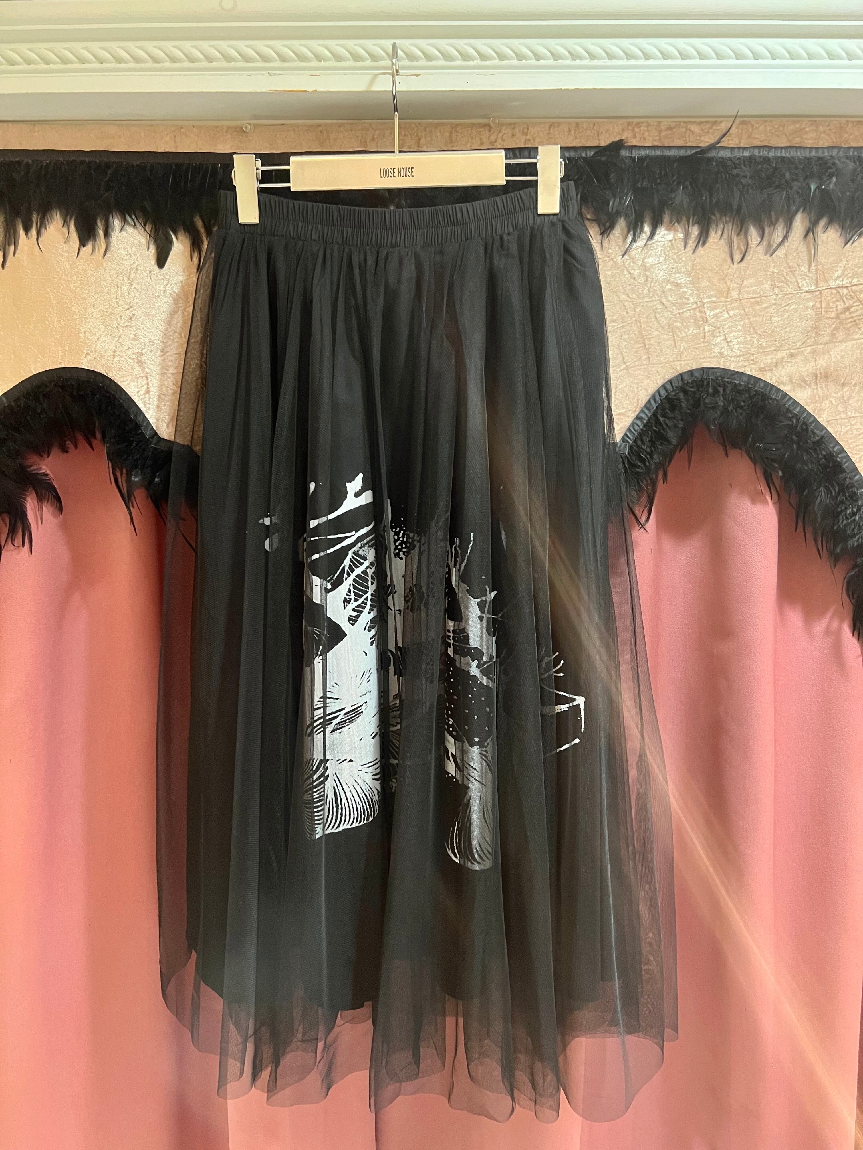 white print tulle cover gather skirt スカート チュール ゴムウエスト プリント 白黒 バイカラー モノトーン