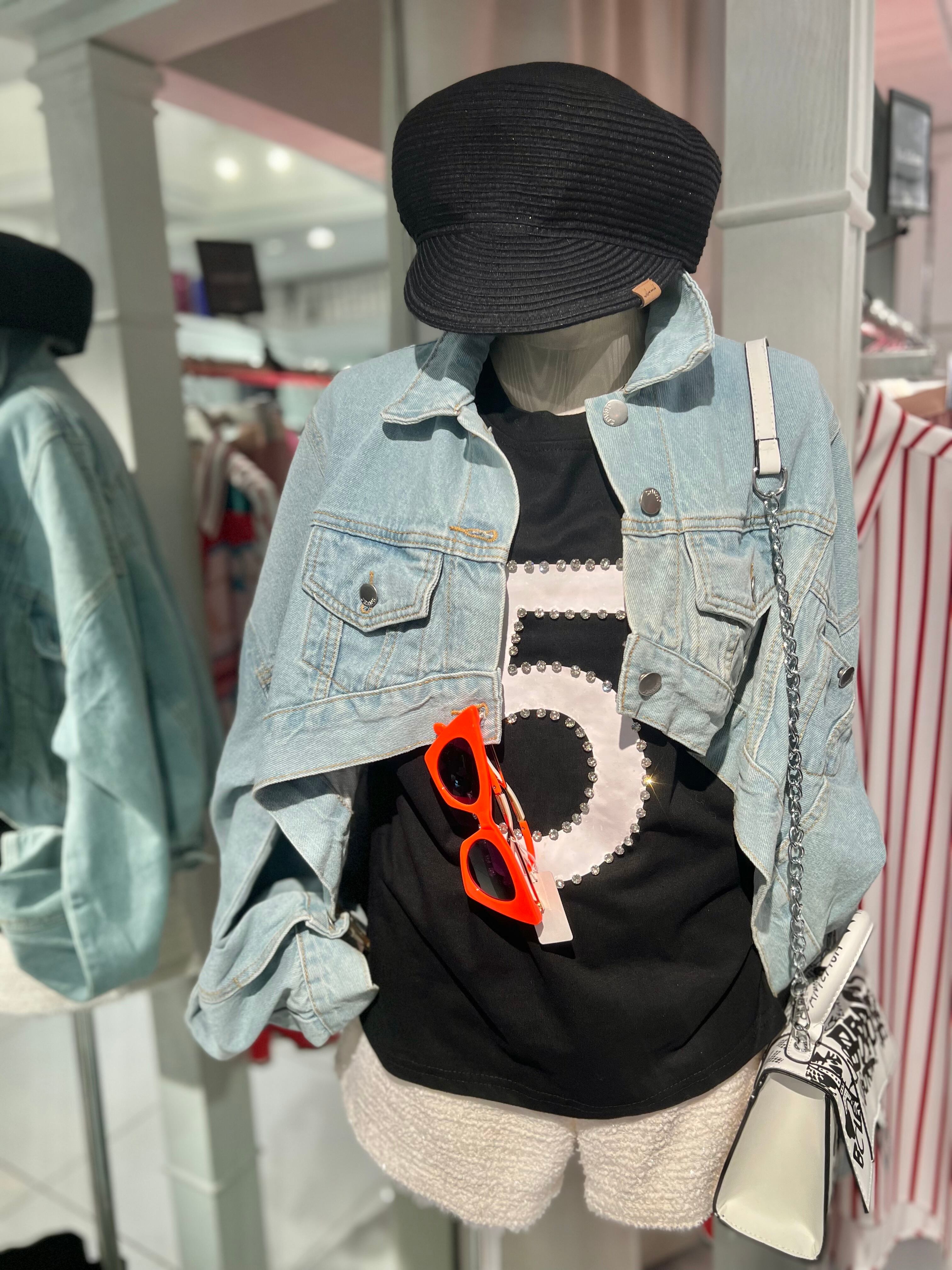 bijou〝5〟 design T-shir Tシャツ プリントT バイカラー 白黒 ビジュー デコレーション