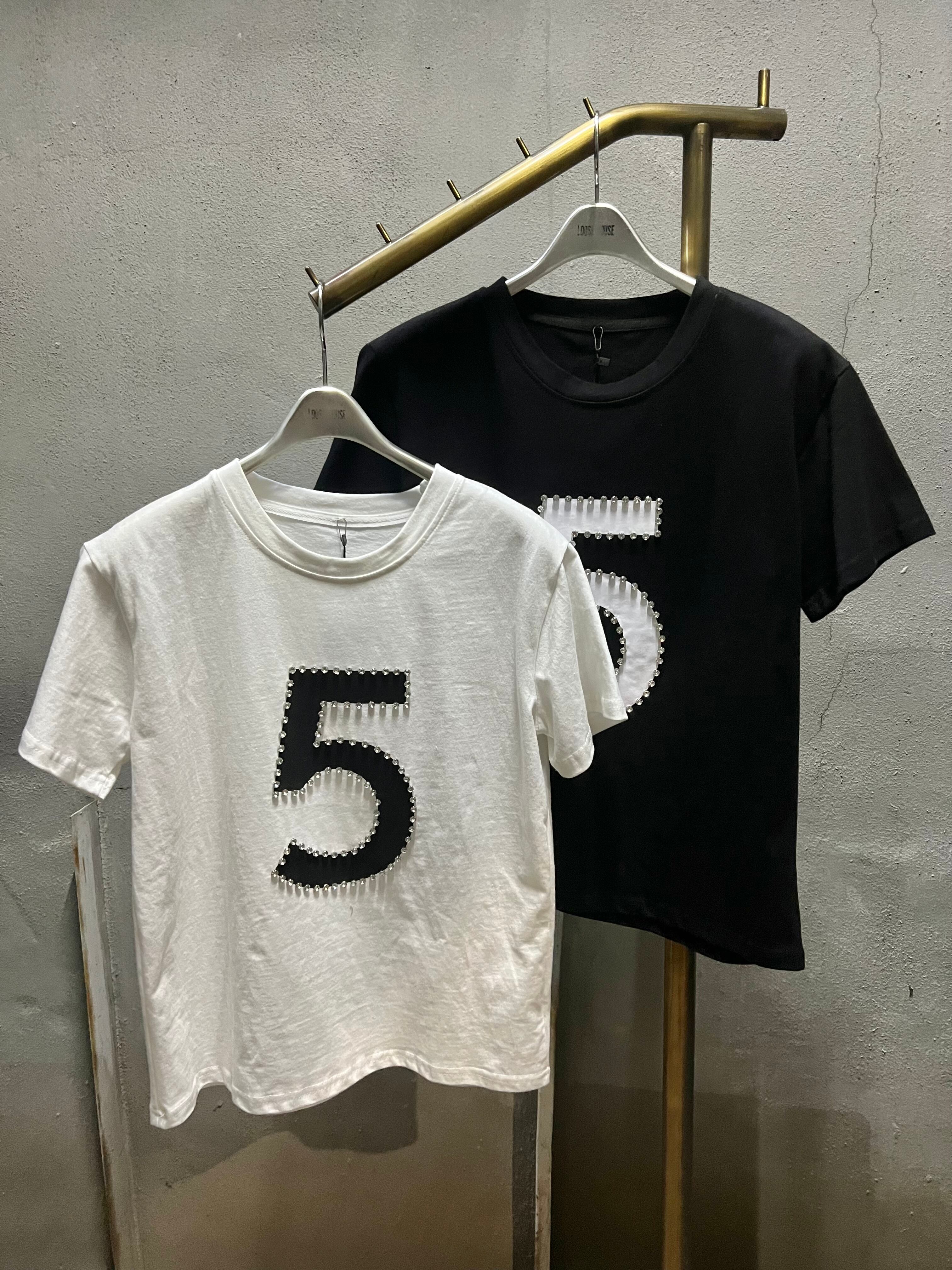 白と黒のバイカラーシンプルなデザインに、大胆にプリントされた5が目を引く一枚。