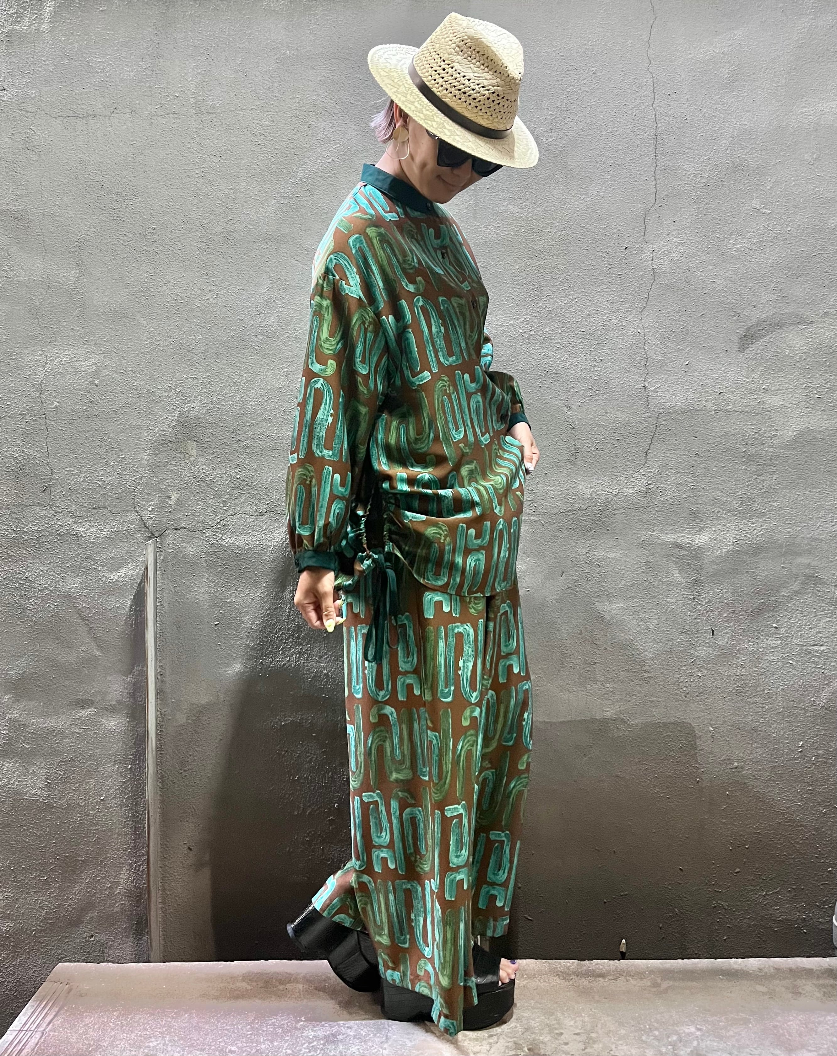 green print shirt × wide pants 2P set up セットアップ 2点セット シャツ パンツ 柄シャツ ワイドパンツ