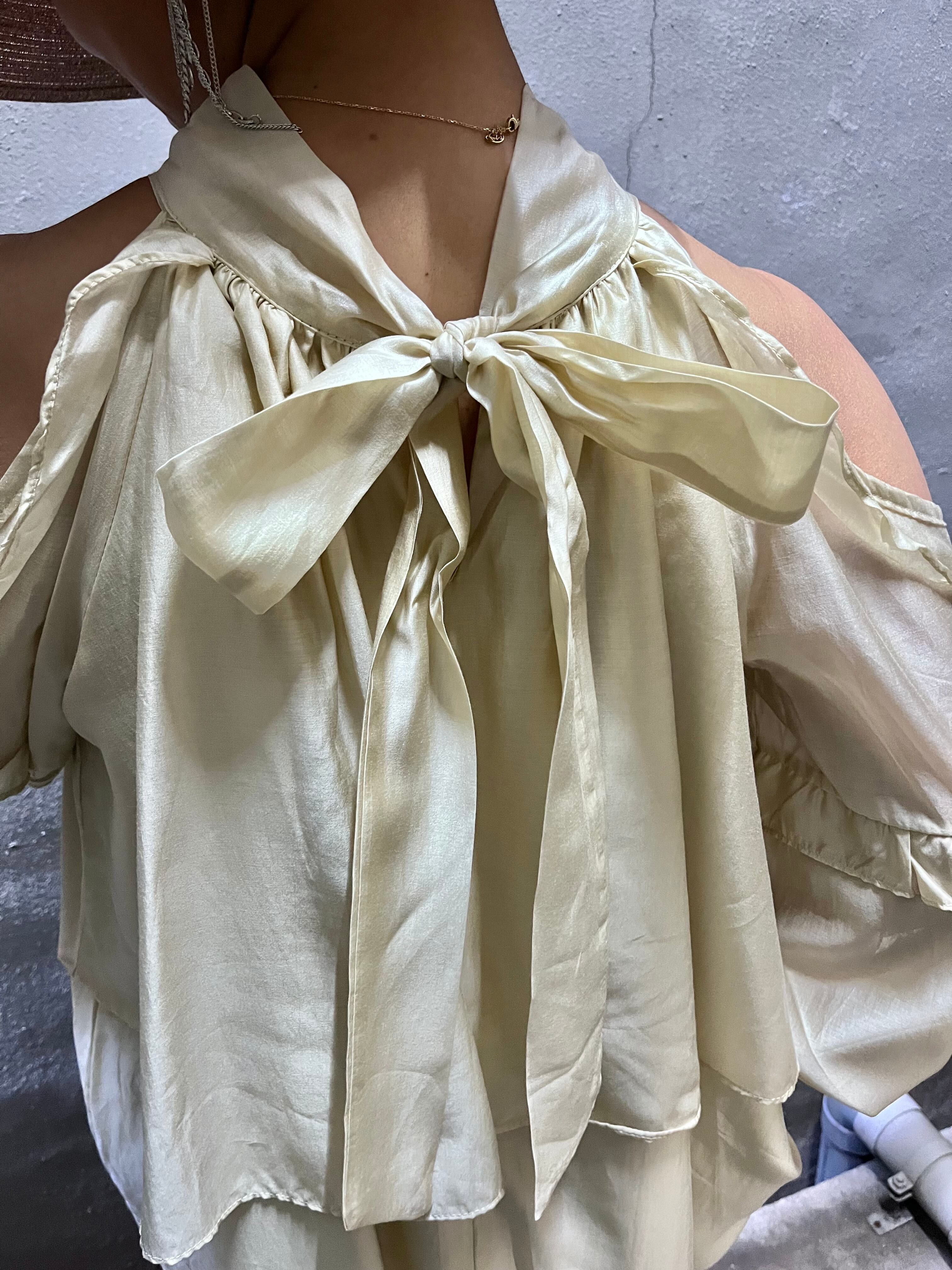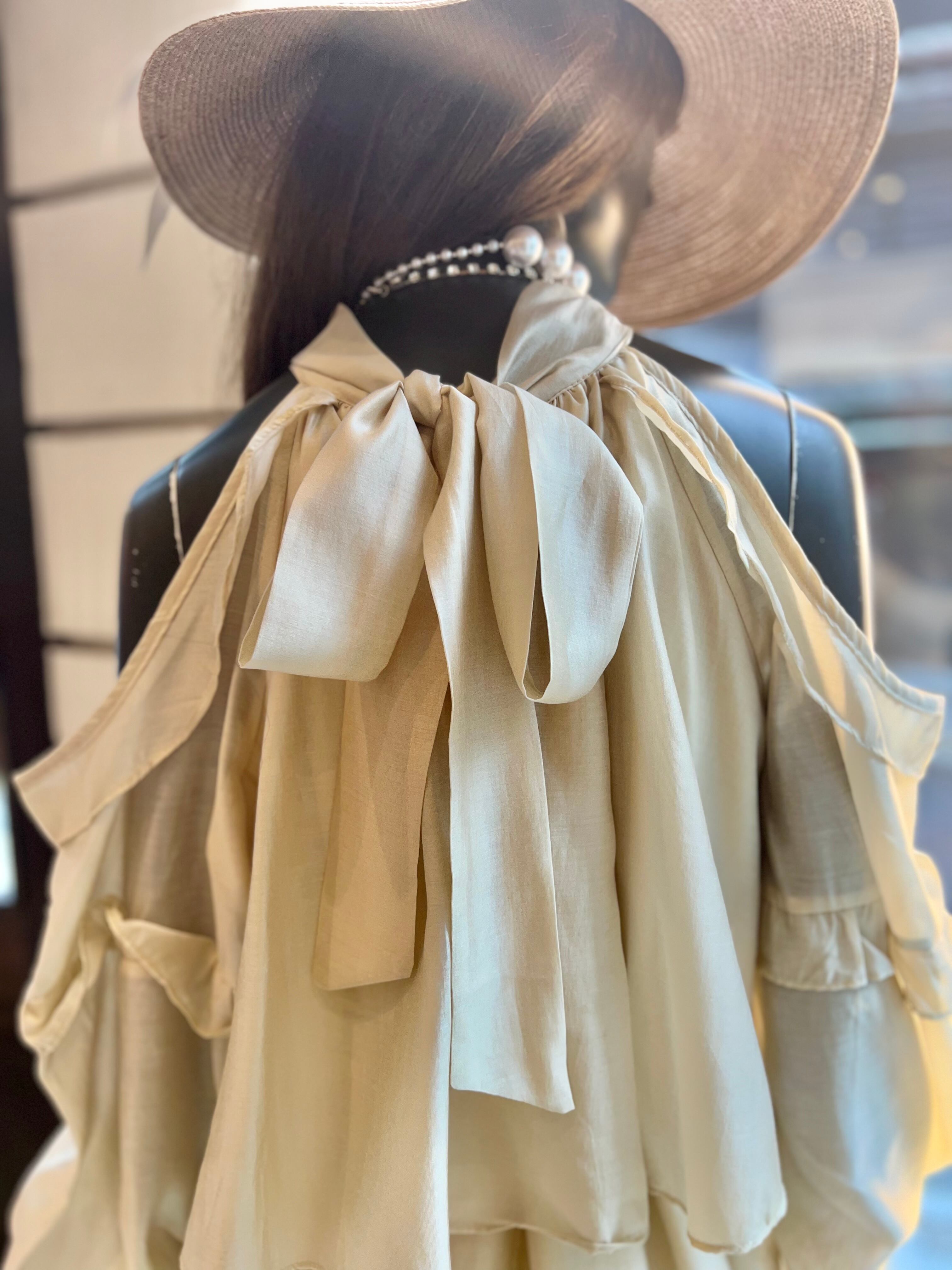 shiny chiffon open shoulder frill design tunic チュニック シフォン フリル リボン 肩開き