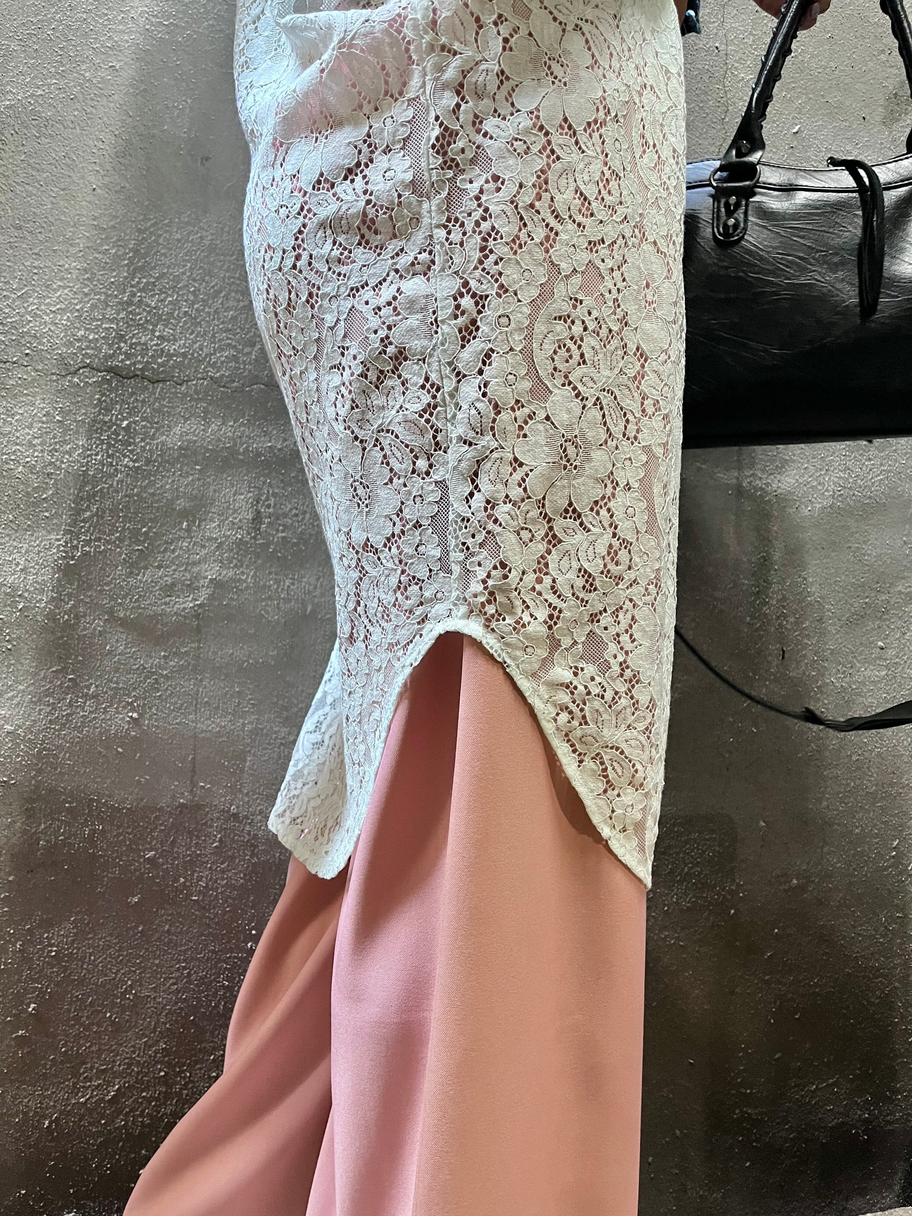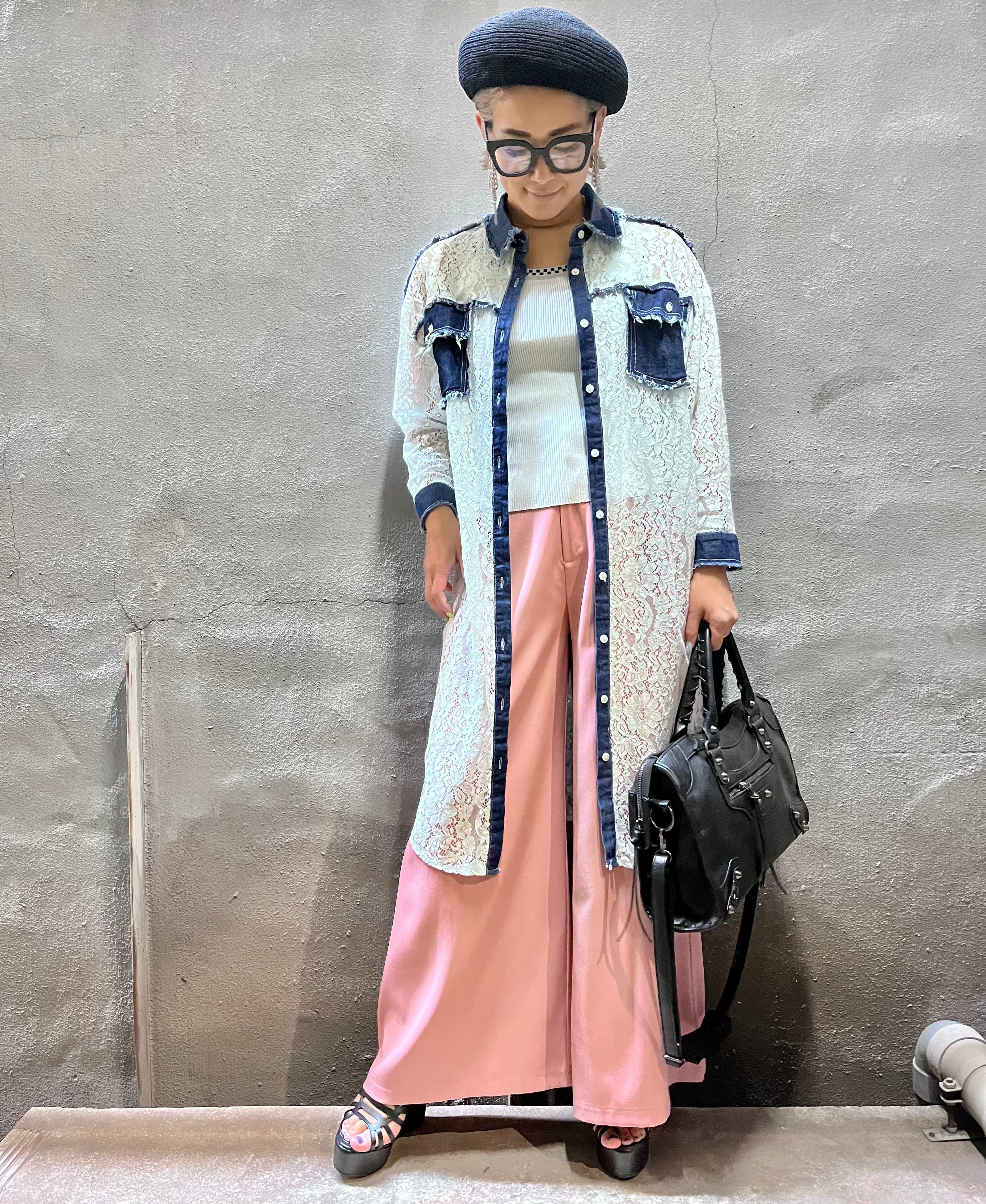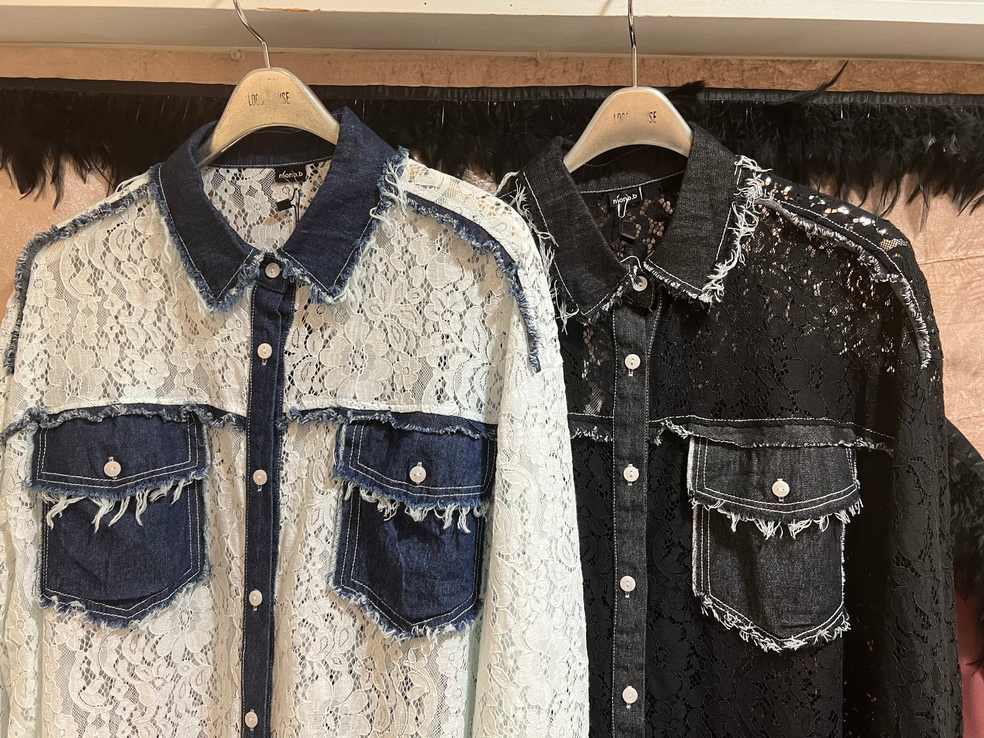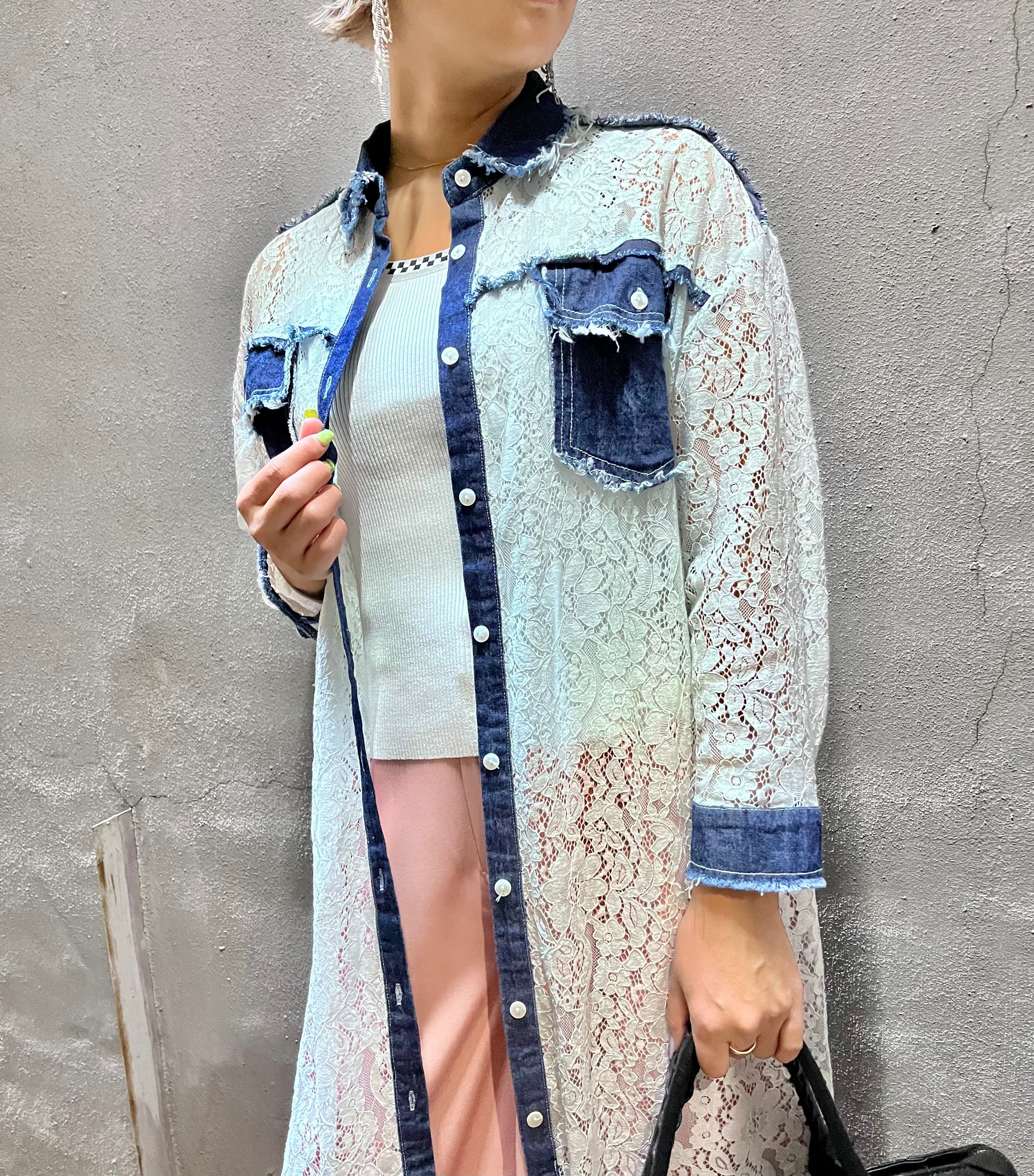 lace × denim shirt one-piece シャツ ワンピース シャツワンピ レース デニム 切替デザイン ロングシャツ