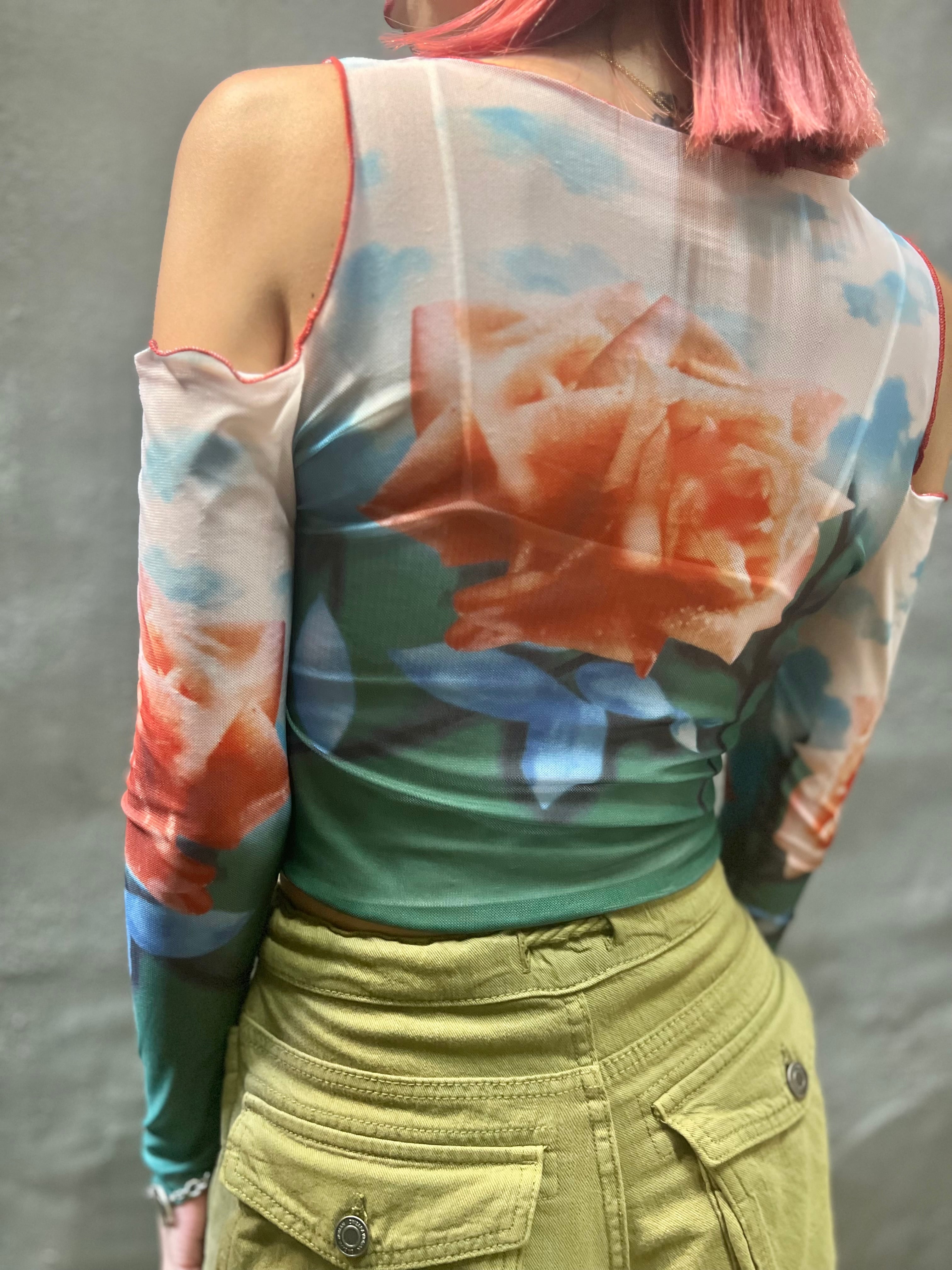 rose print open sleeve stretch mesh tops トップス メッシュ オープンスリーブ 肩開き ストレッチ 薔薇