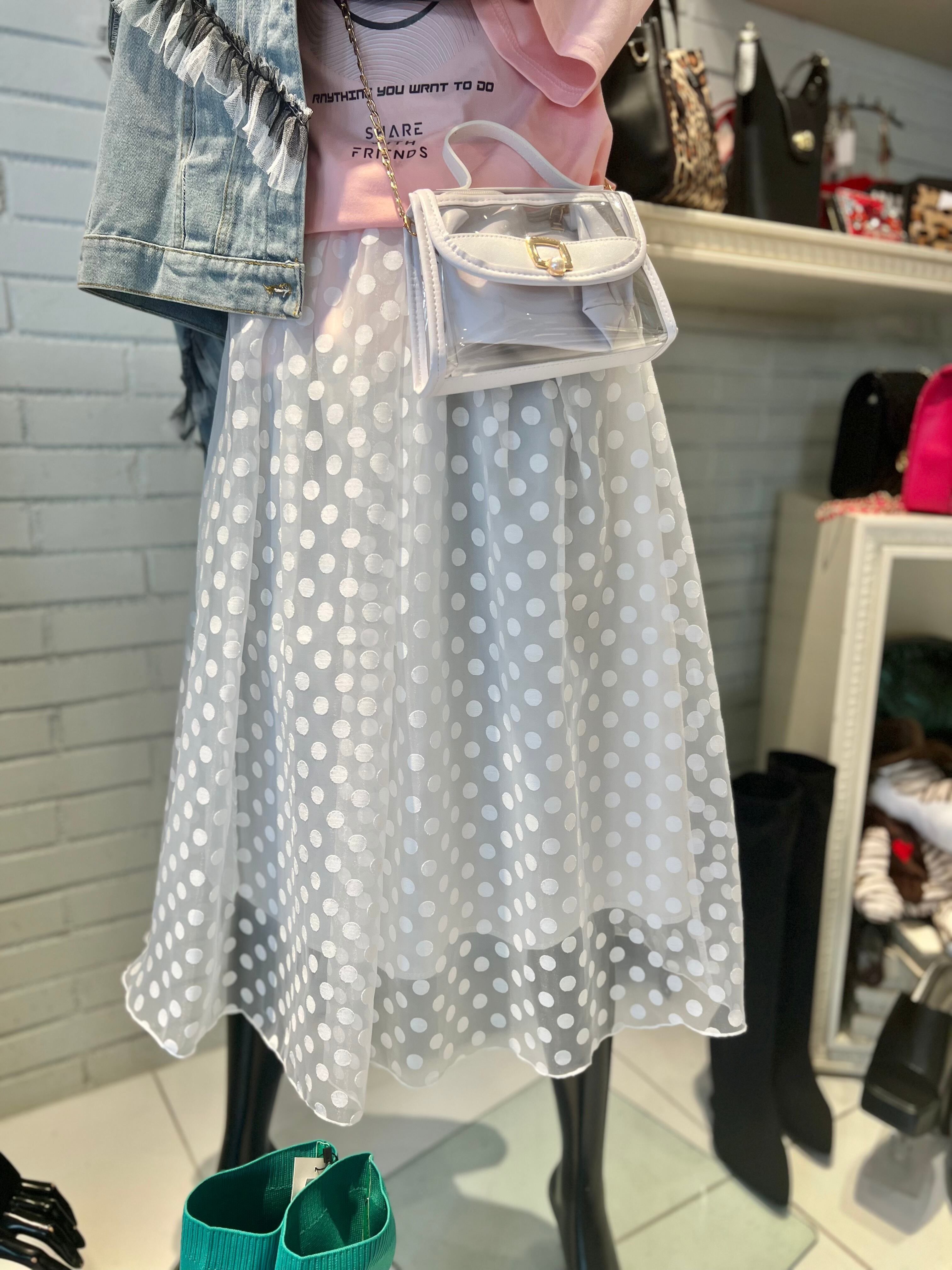 フェミニンで清楚な雰囲気の、オパールドットシフォンギャザースカート。