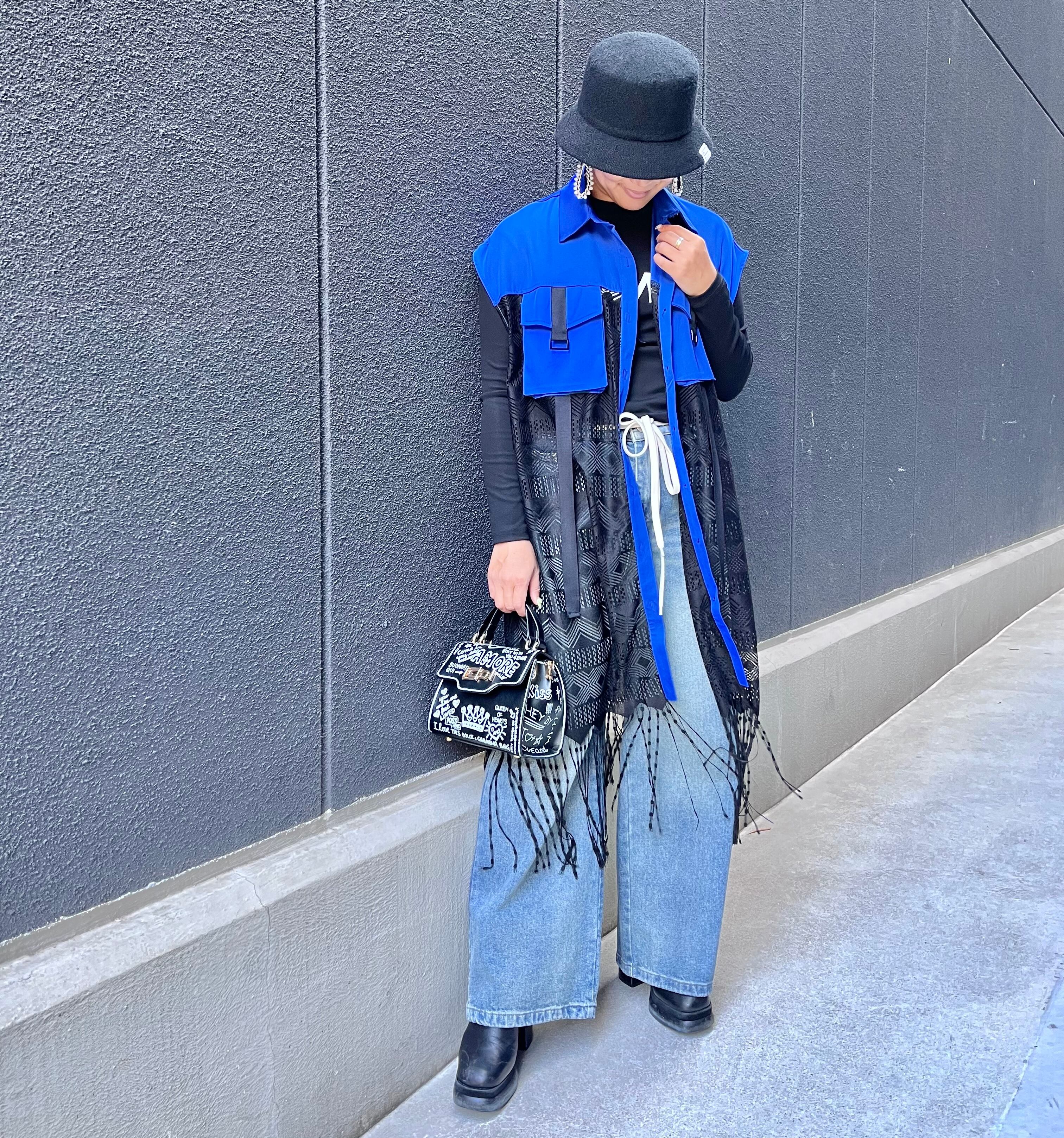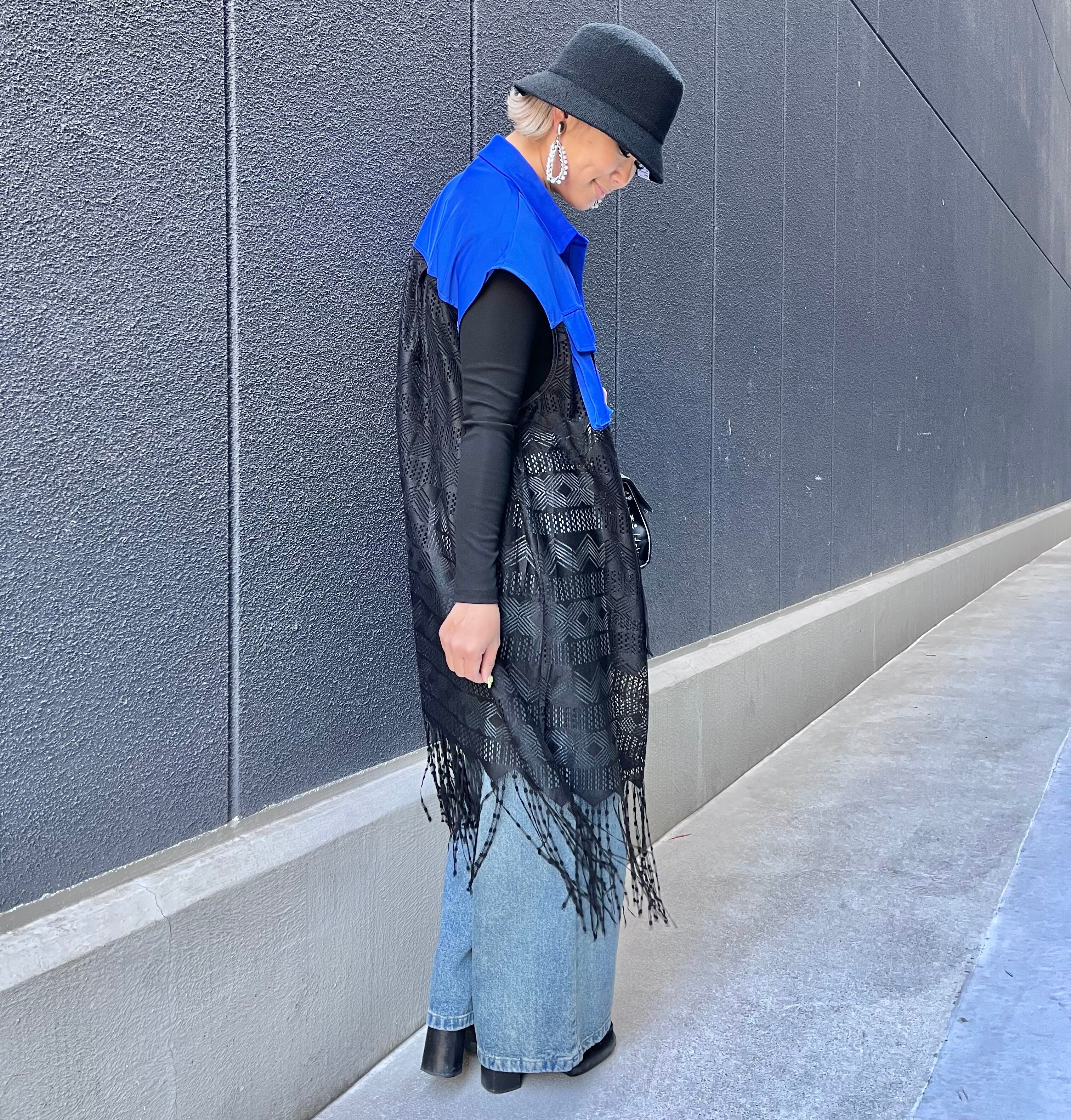 異素材の切り替えと裾のフリンジが印象的なロングジレです。