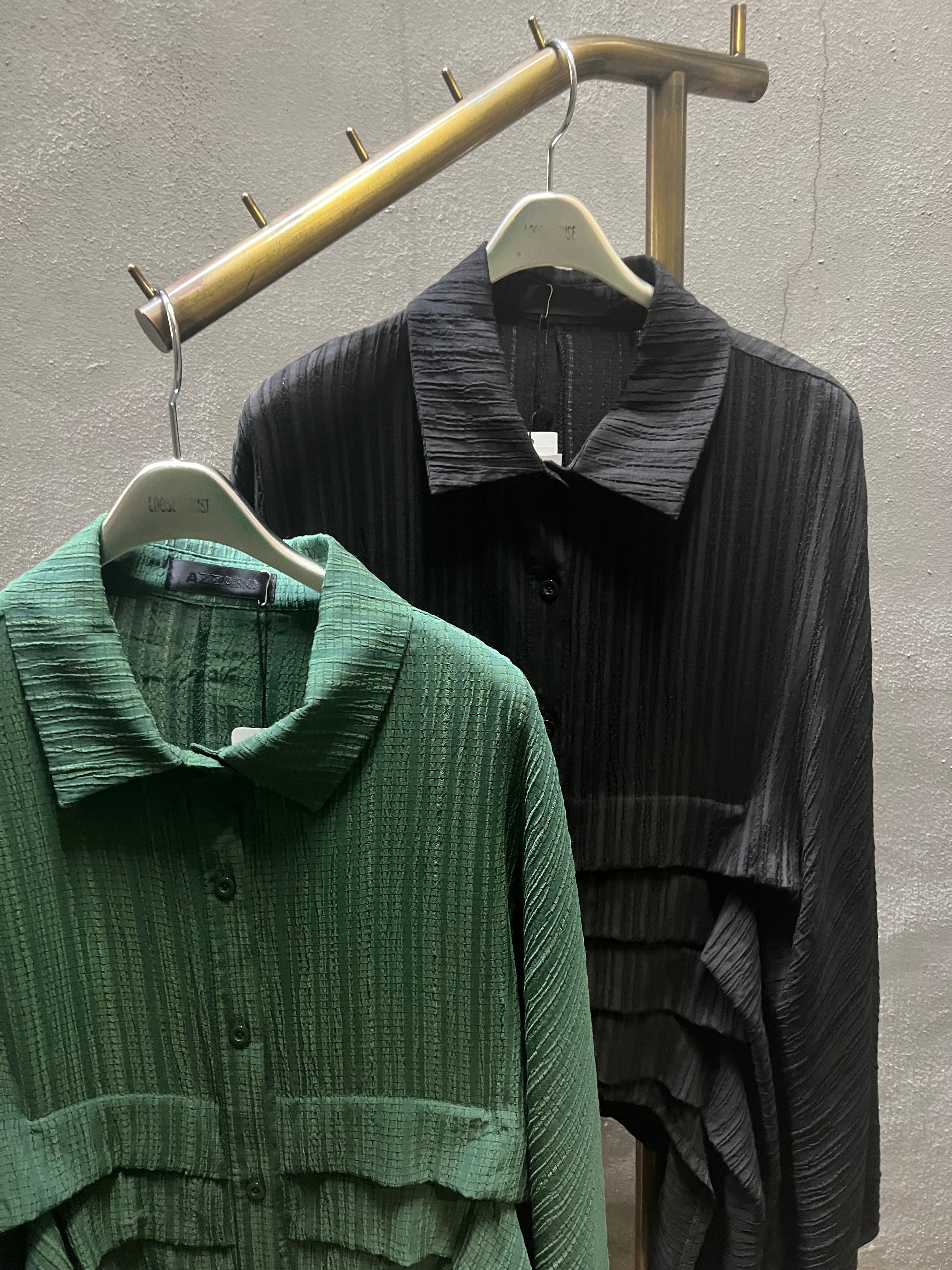 タックやドレープなど、デザインにこだわった個性的なシャツ。