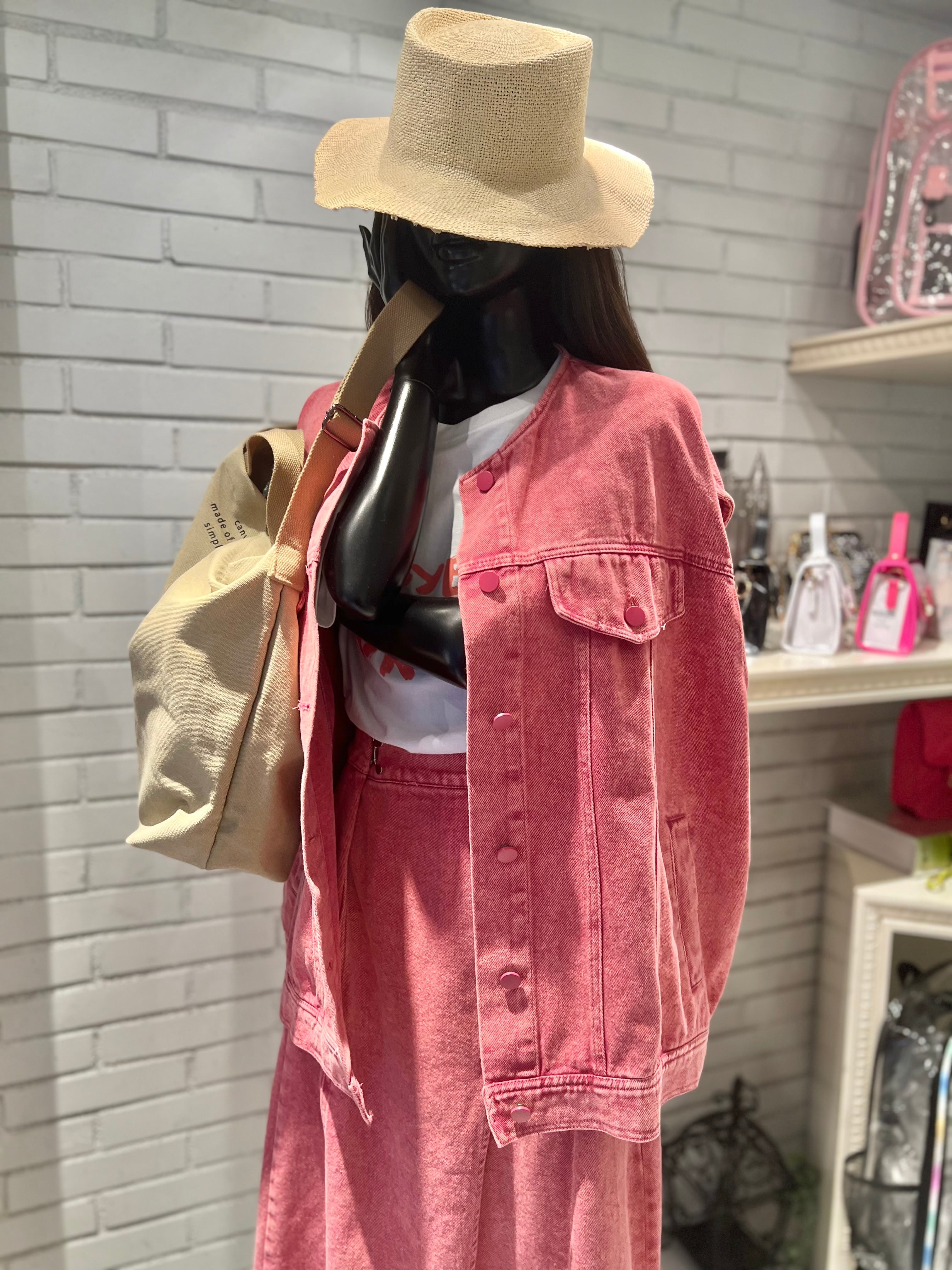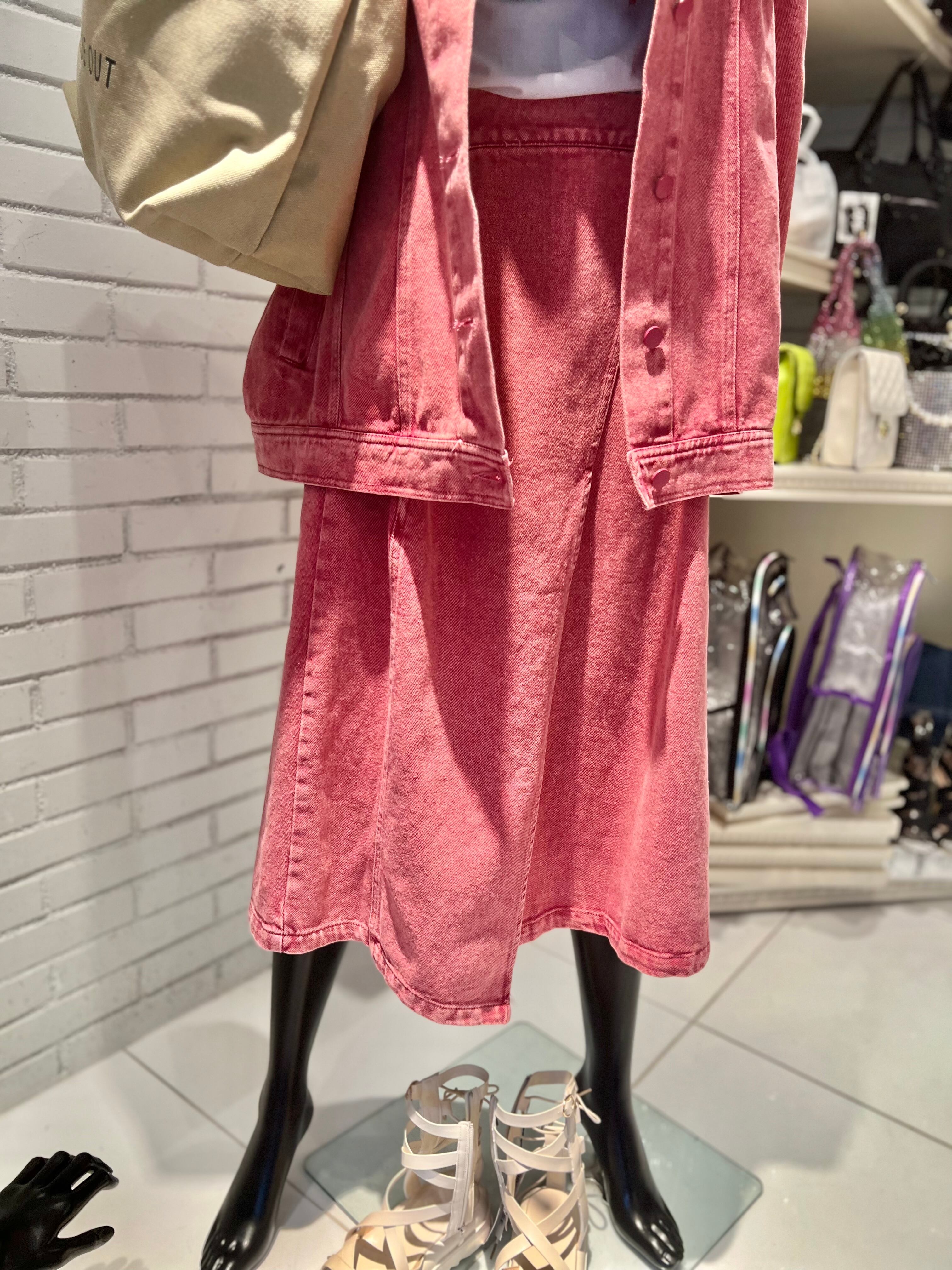 日差しの強い季節におすすめの、ピンクデニムのセットアップです。