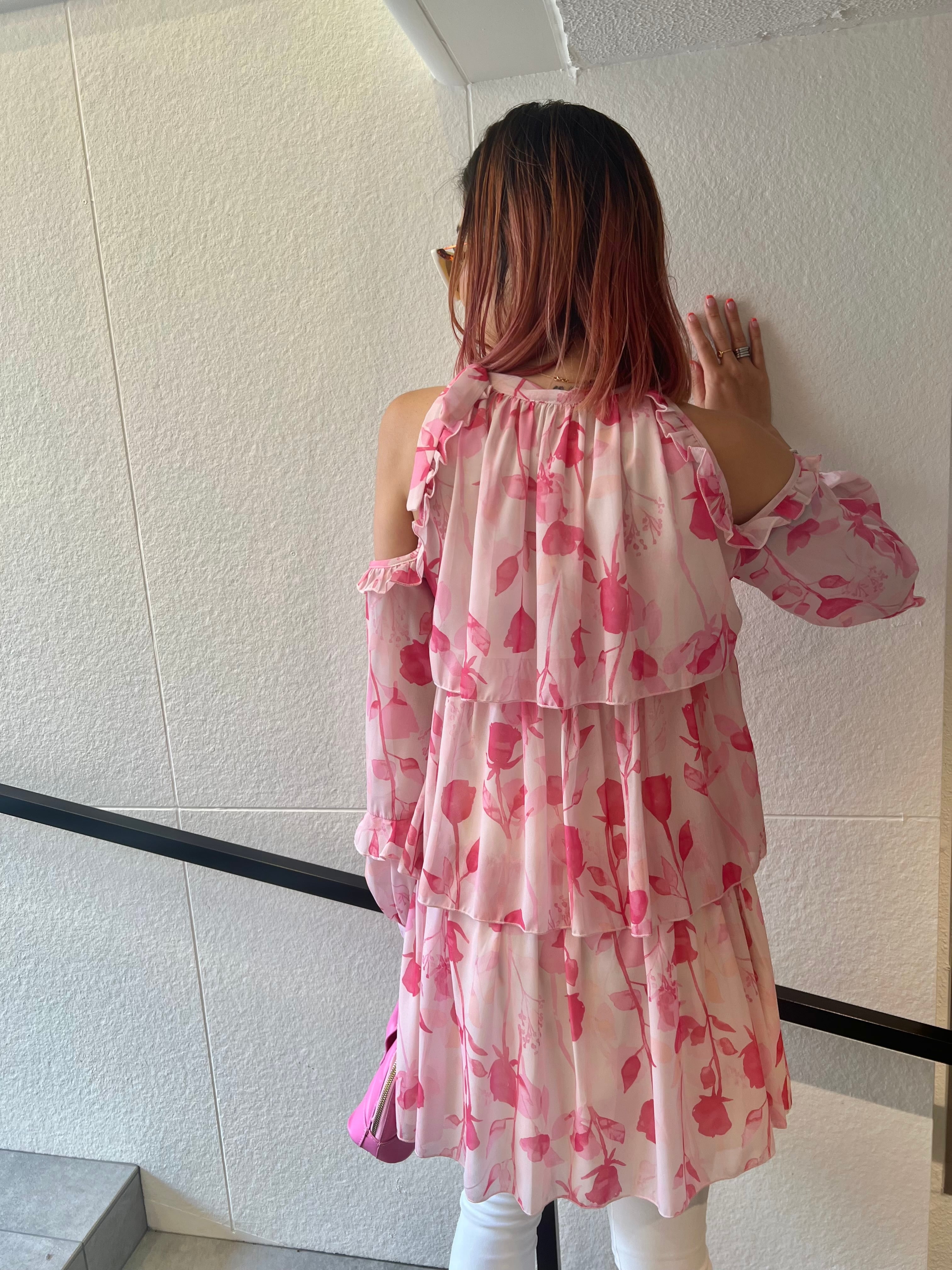 pink rose chiffon open shoulder mini one-piece ワンピース ワンピ 肩開き オープンショルダー 花柄 ローズ ピンク シフォン