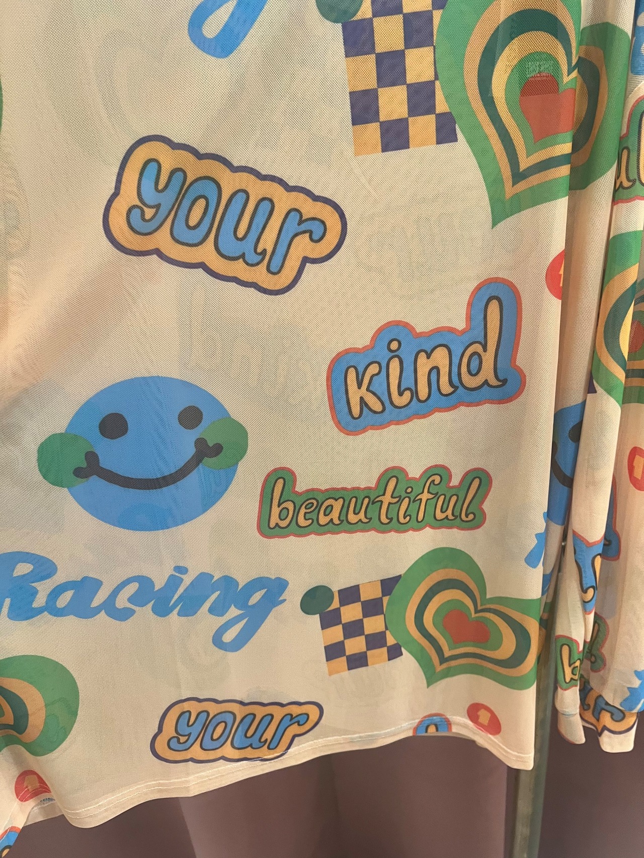カラフルなハートとキュートなスマイリープリントがポイント。