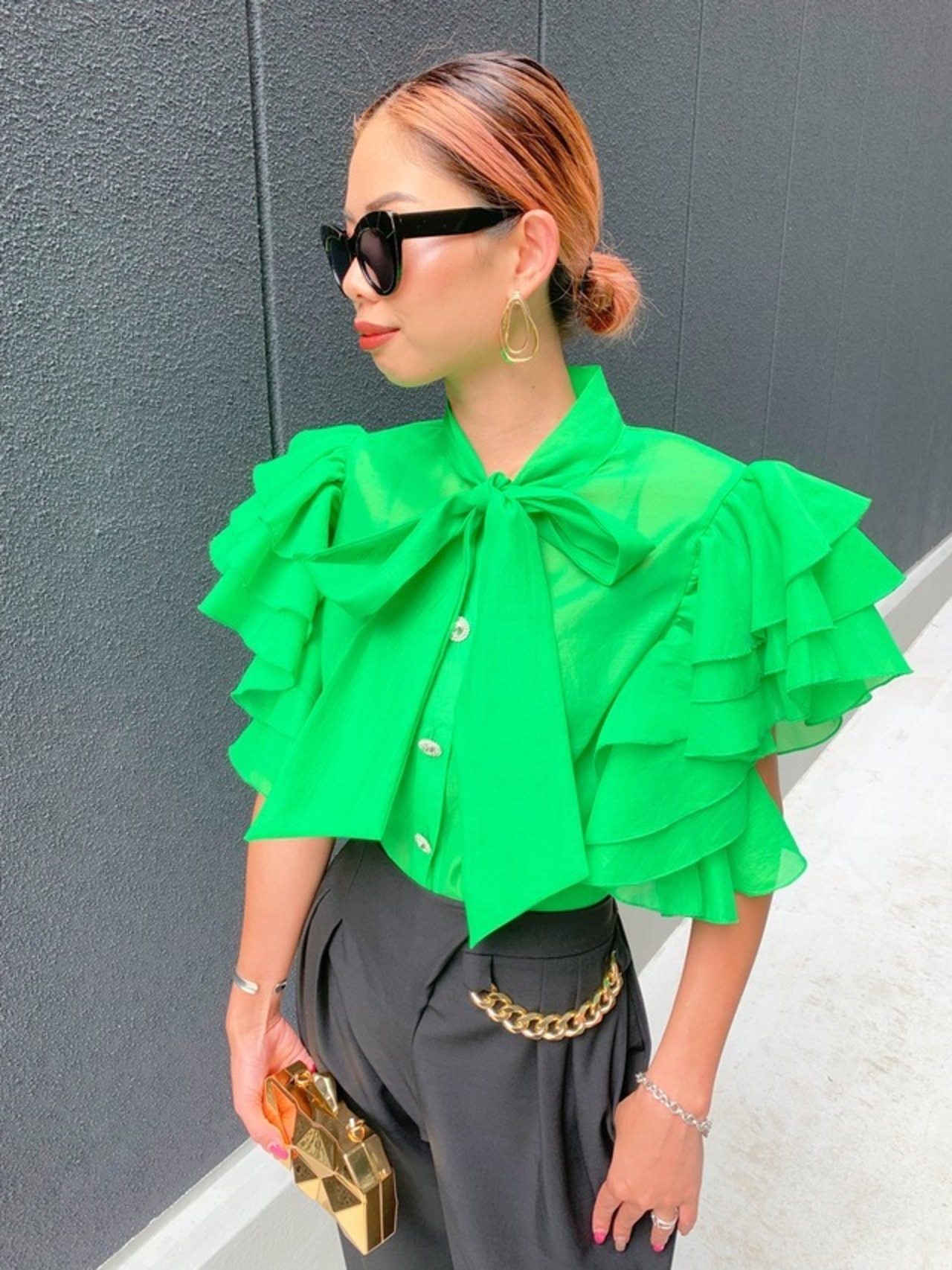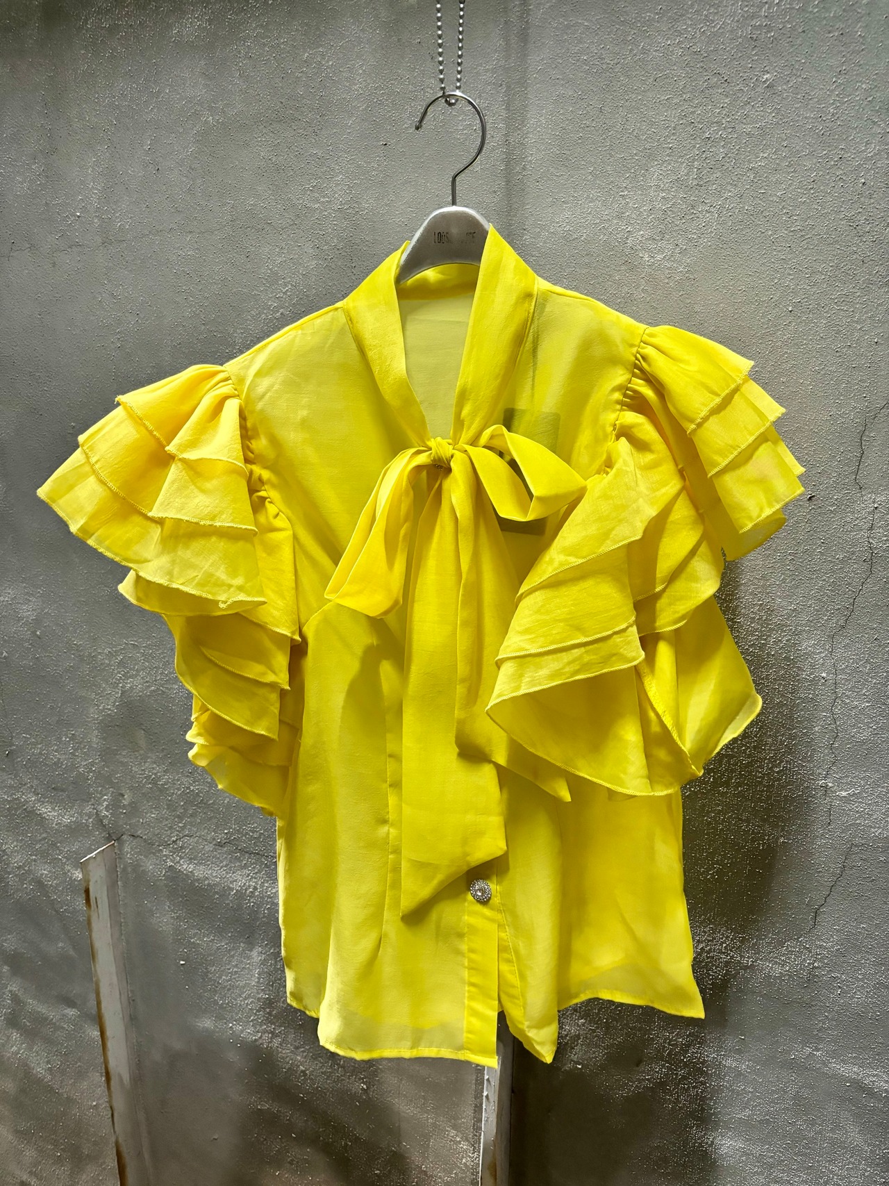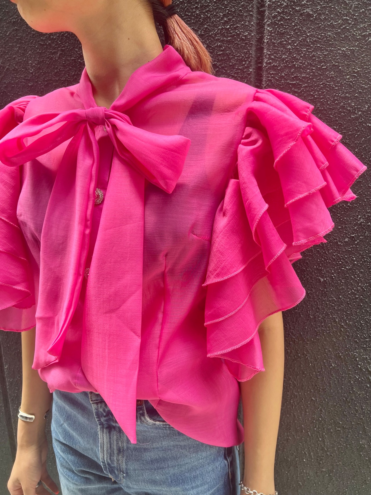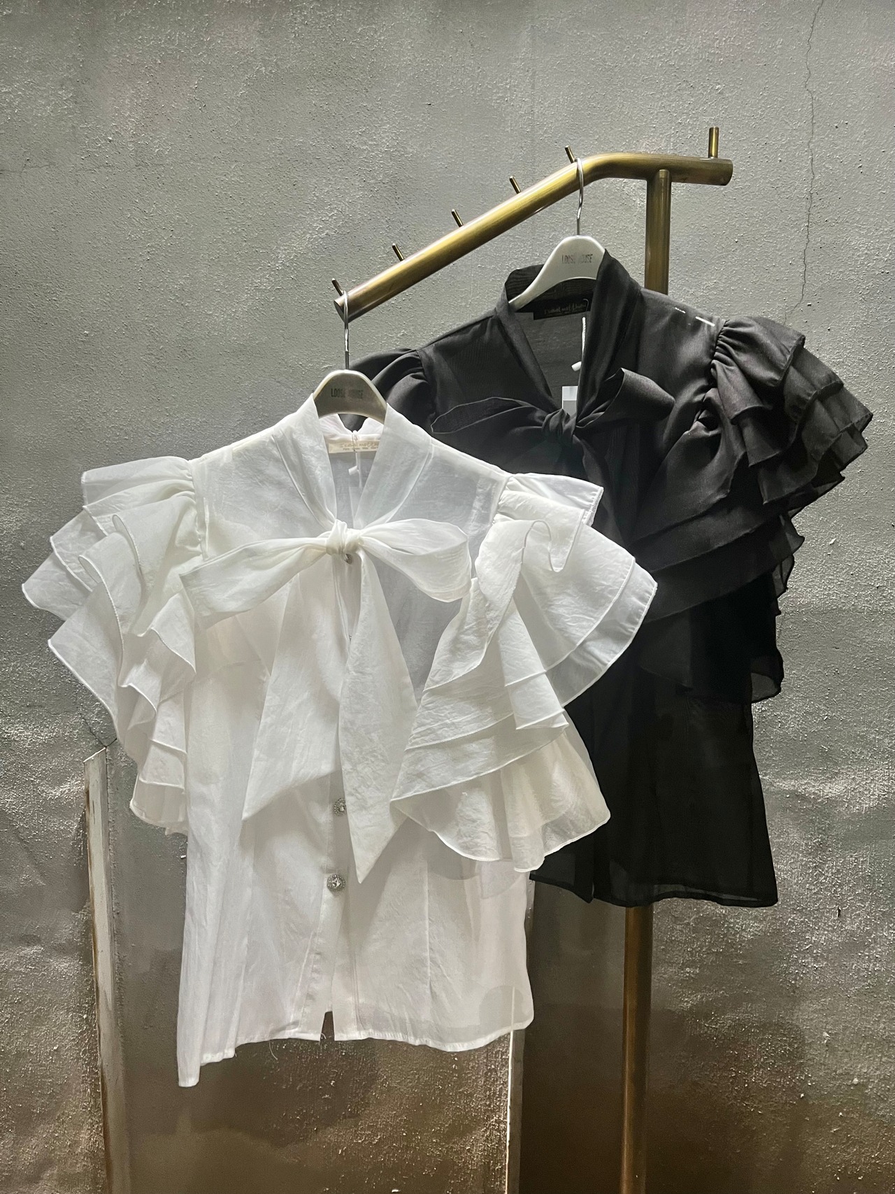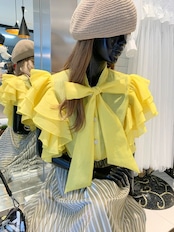 organdy frill sleeve bow-tie blouse ブラウス シャツ フリル ボウタイ リボン デザインボタン