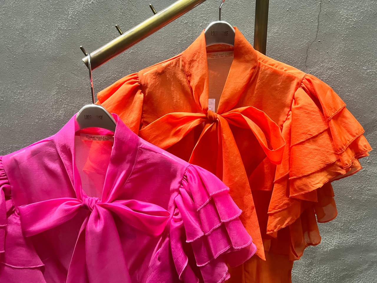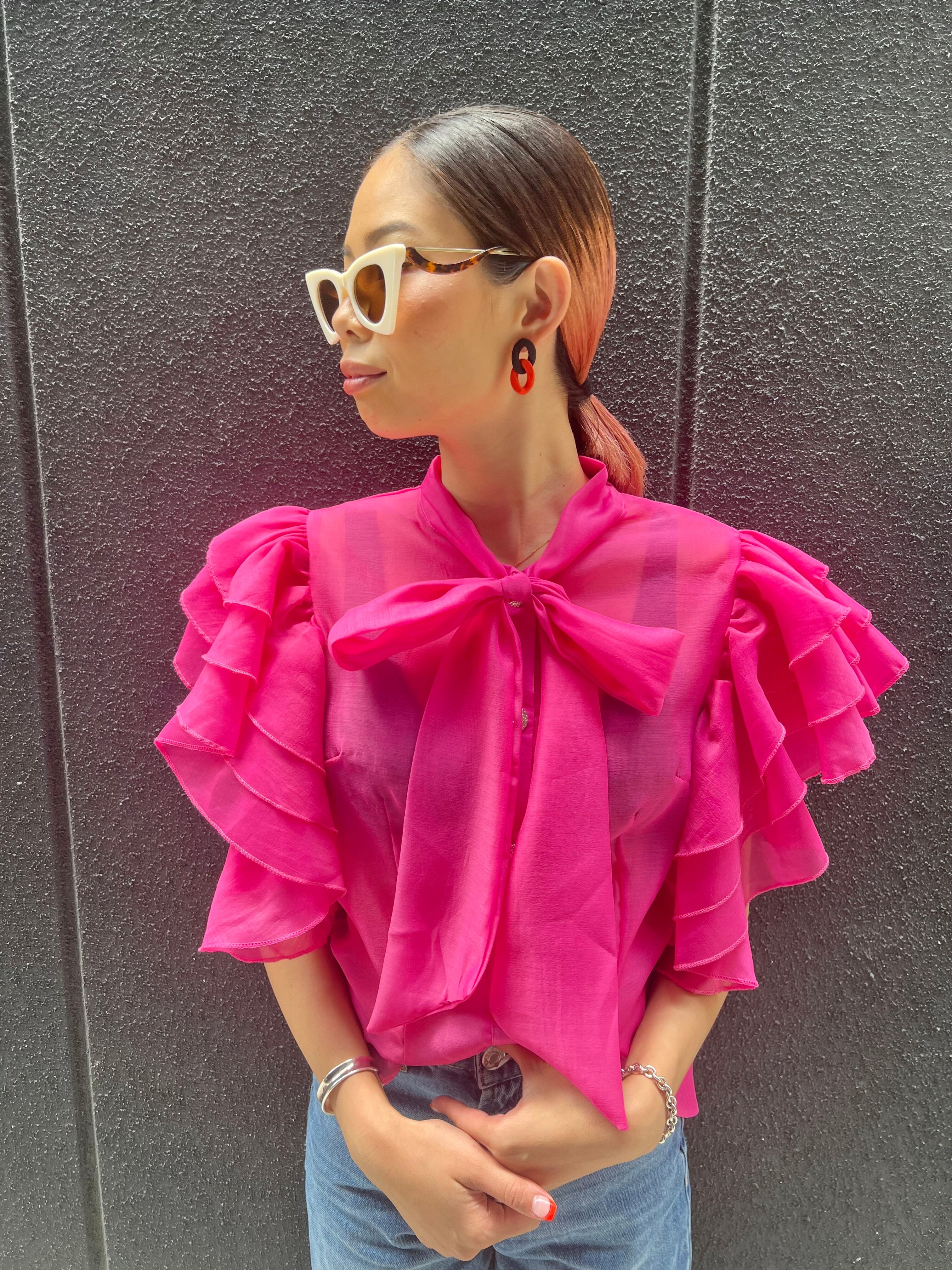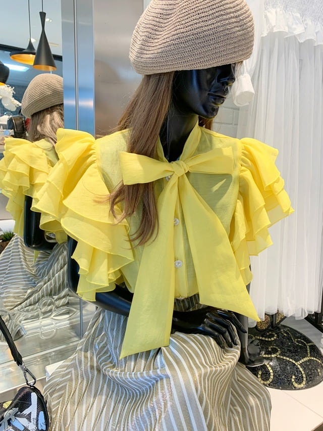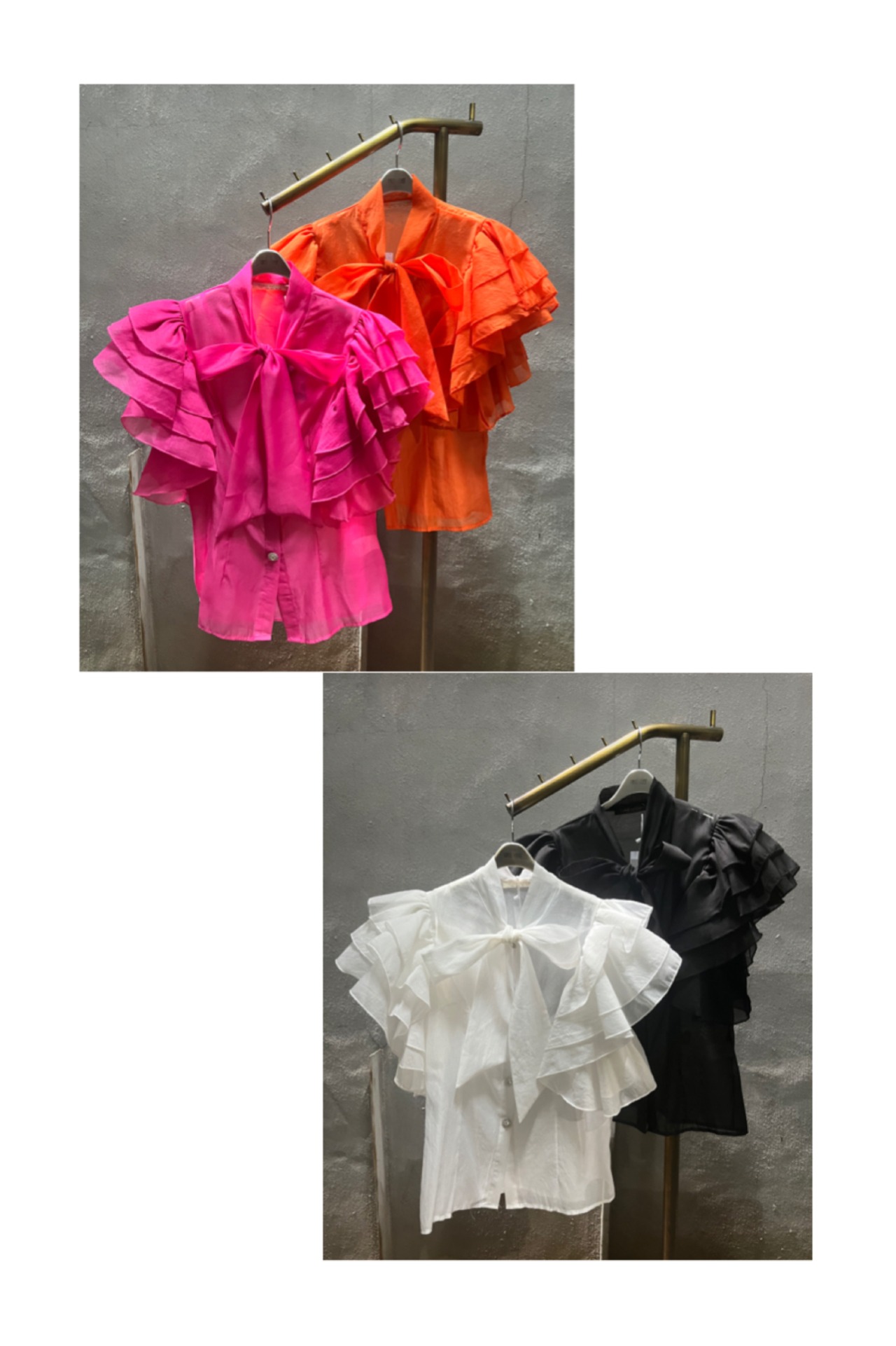 organdy frill sleeve bow-tie blouse ブラウス シャツ フリル ボウタイ リボン デザインボタン