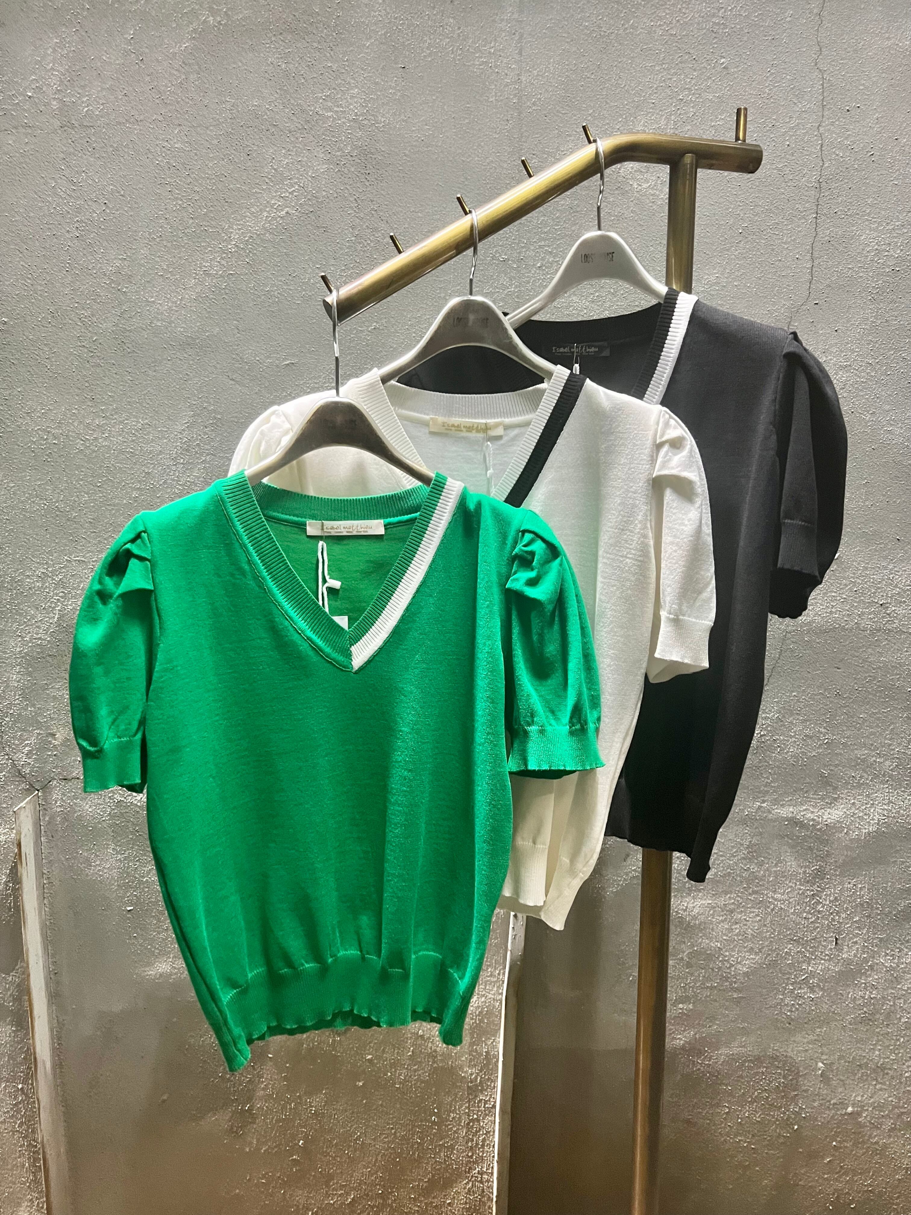 bi-color V-neck knit tops トップス ニット Vネック 半袖 ライン