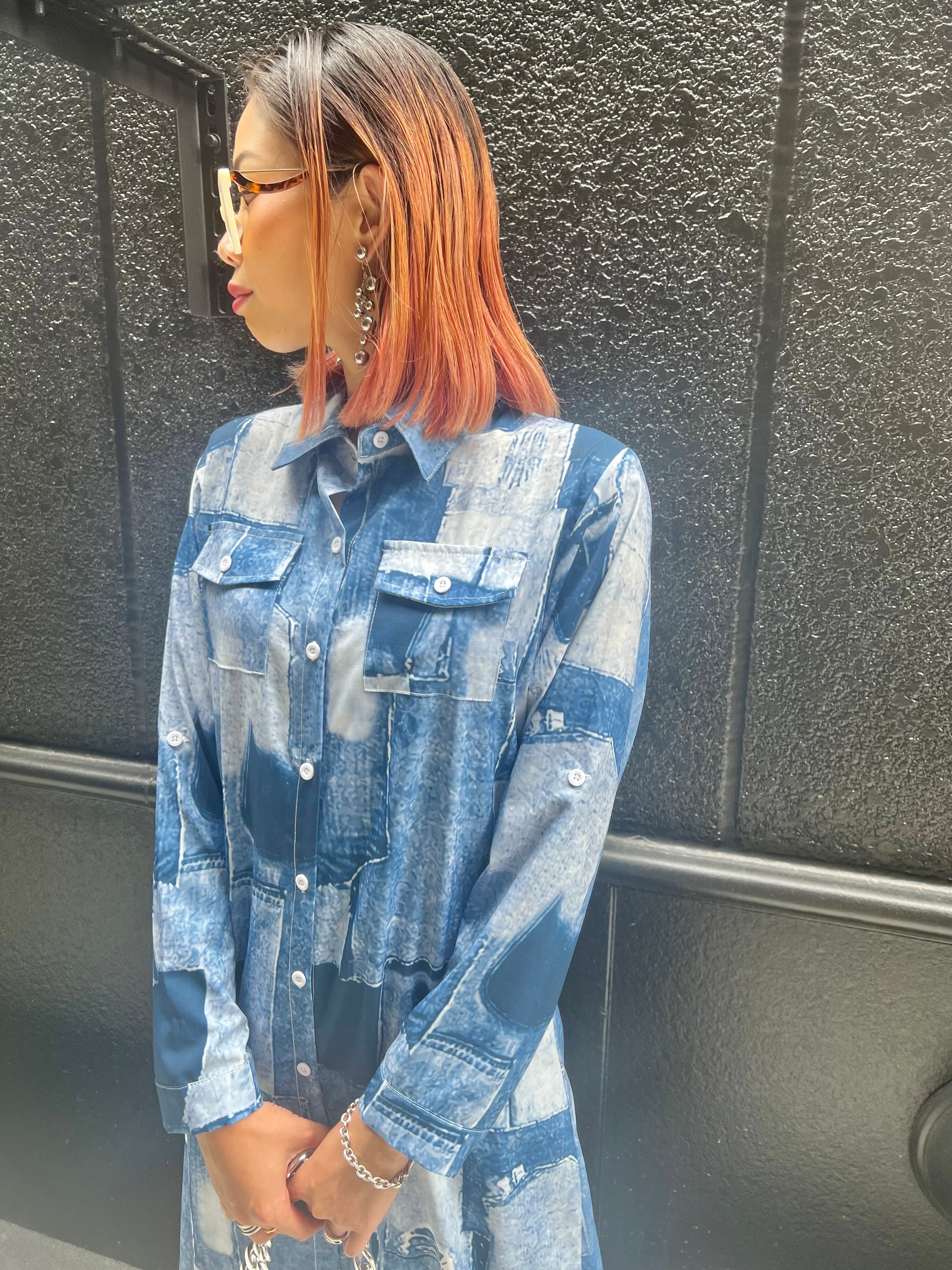 patchwork denim print long shirt one-piece ワンピース シャツワンピ ロングワンピ パッチワーク デニム