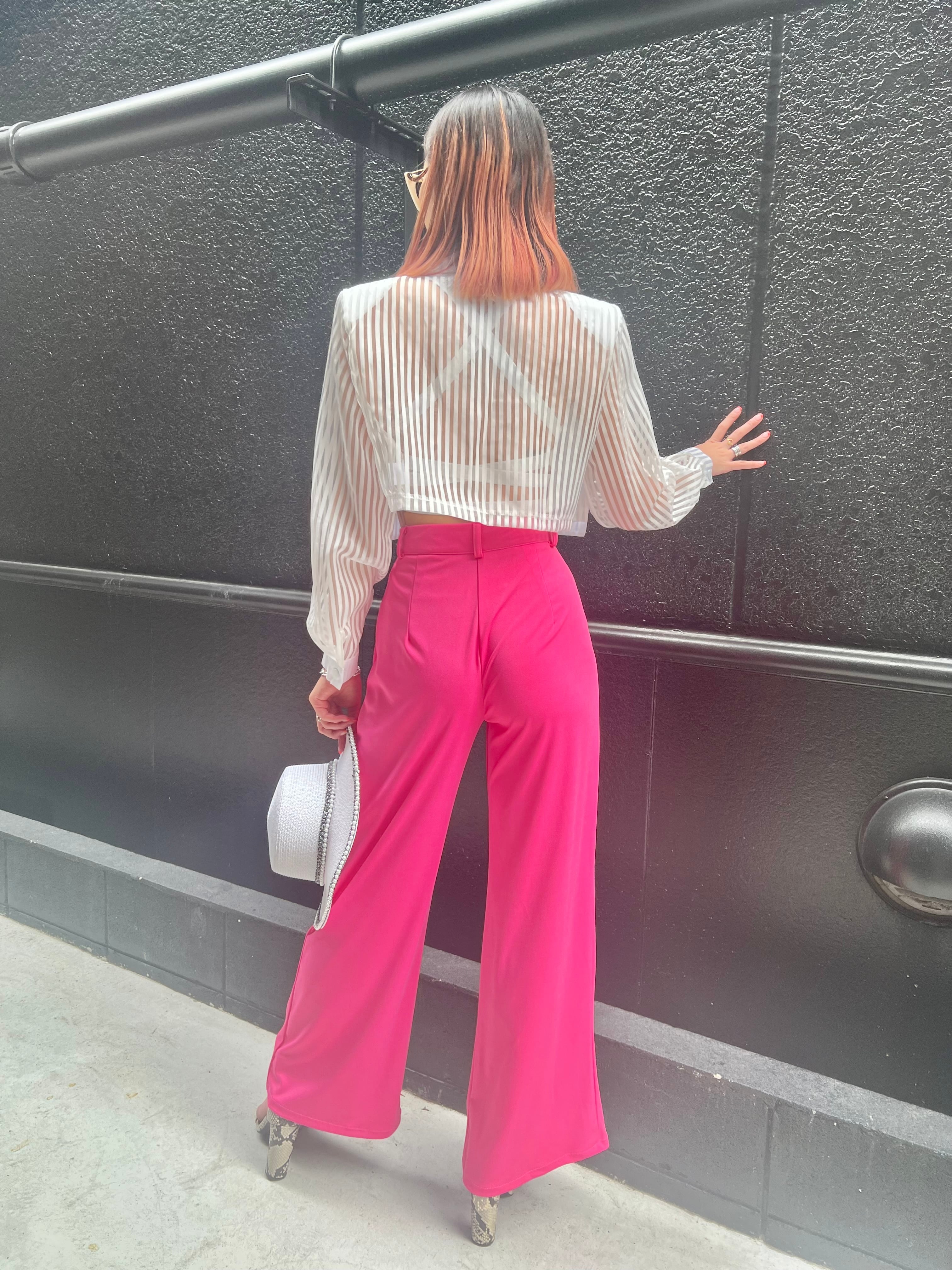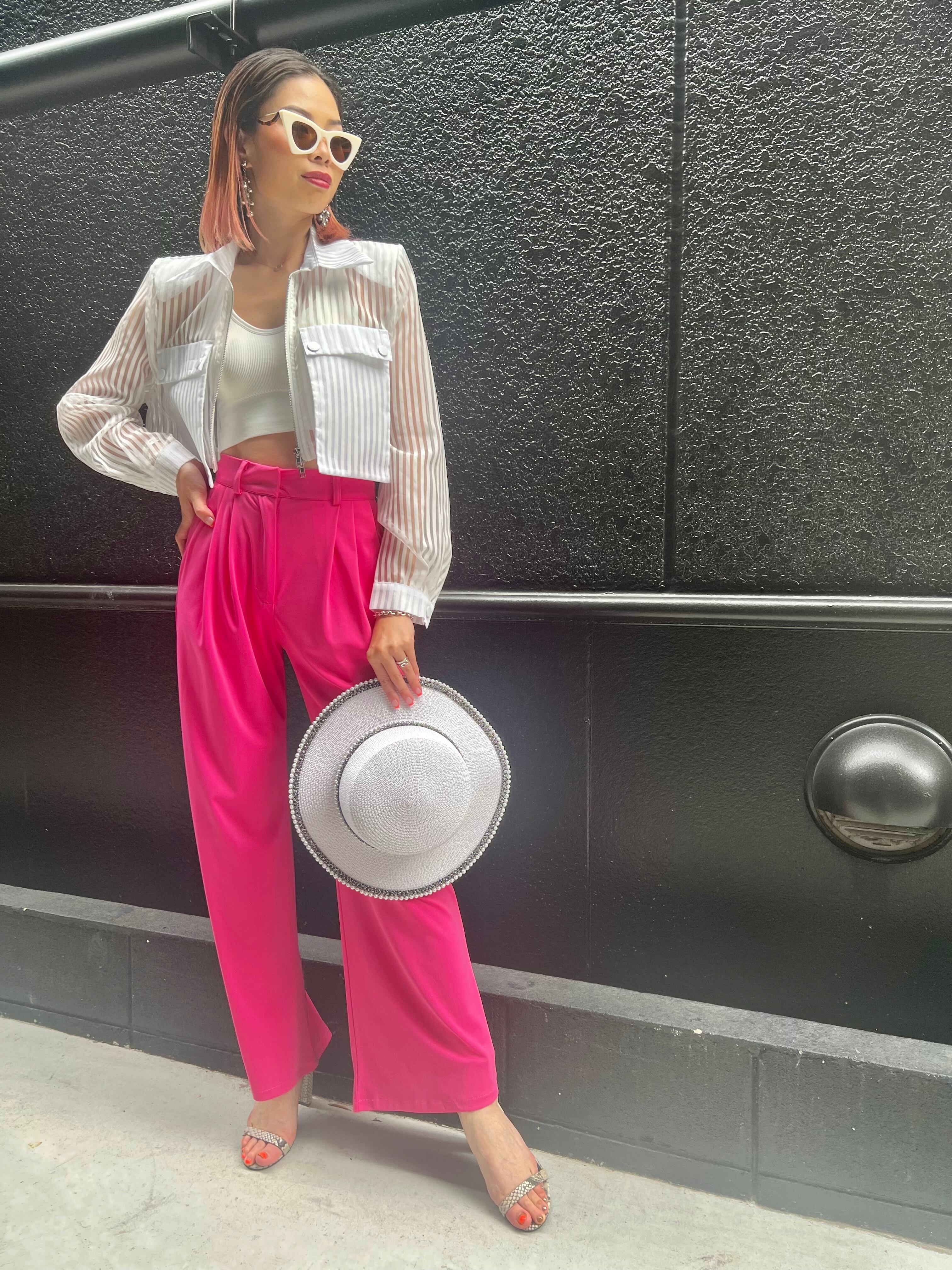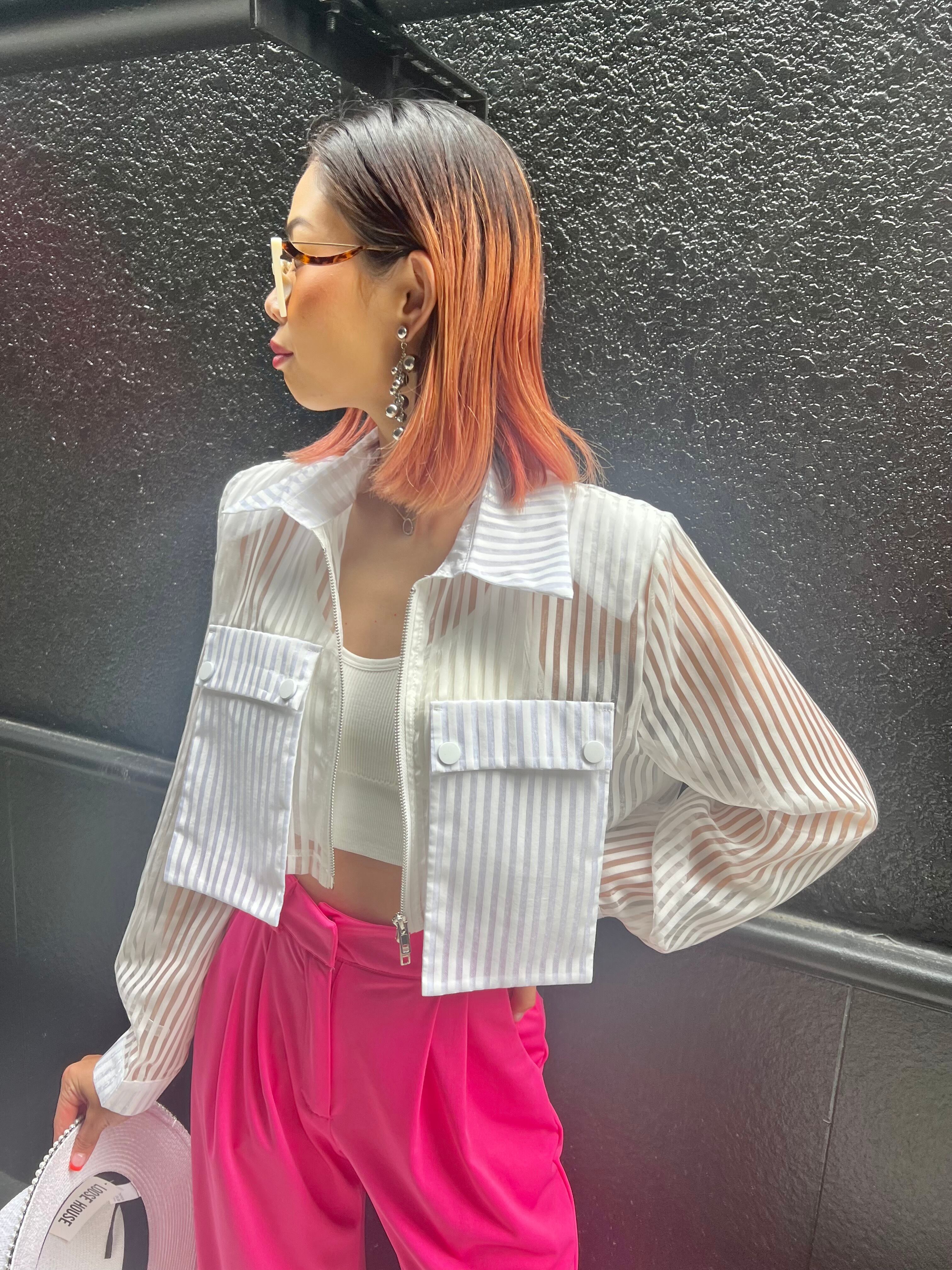 シアー素材で、透け感のあるストライプが、今季のトレンドを押さえたおしゃれな一枚です♡大きめのポケットもデザインのポイントのひとつで、