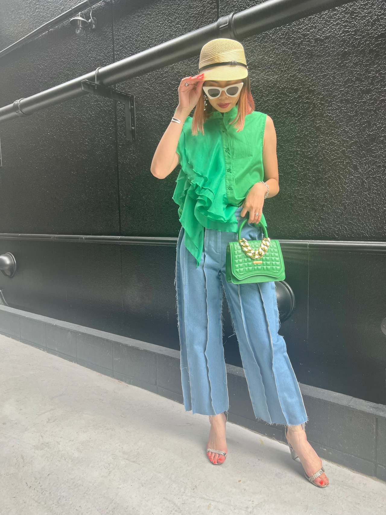 カットオフの裾やデザインのステッチがアクセントとなり、