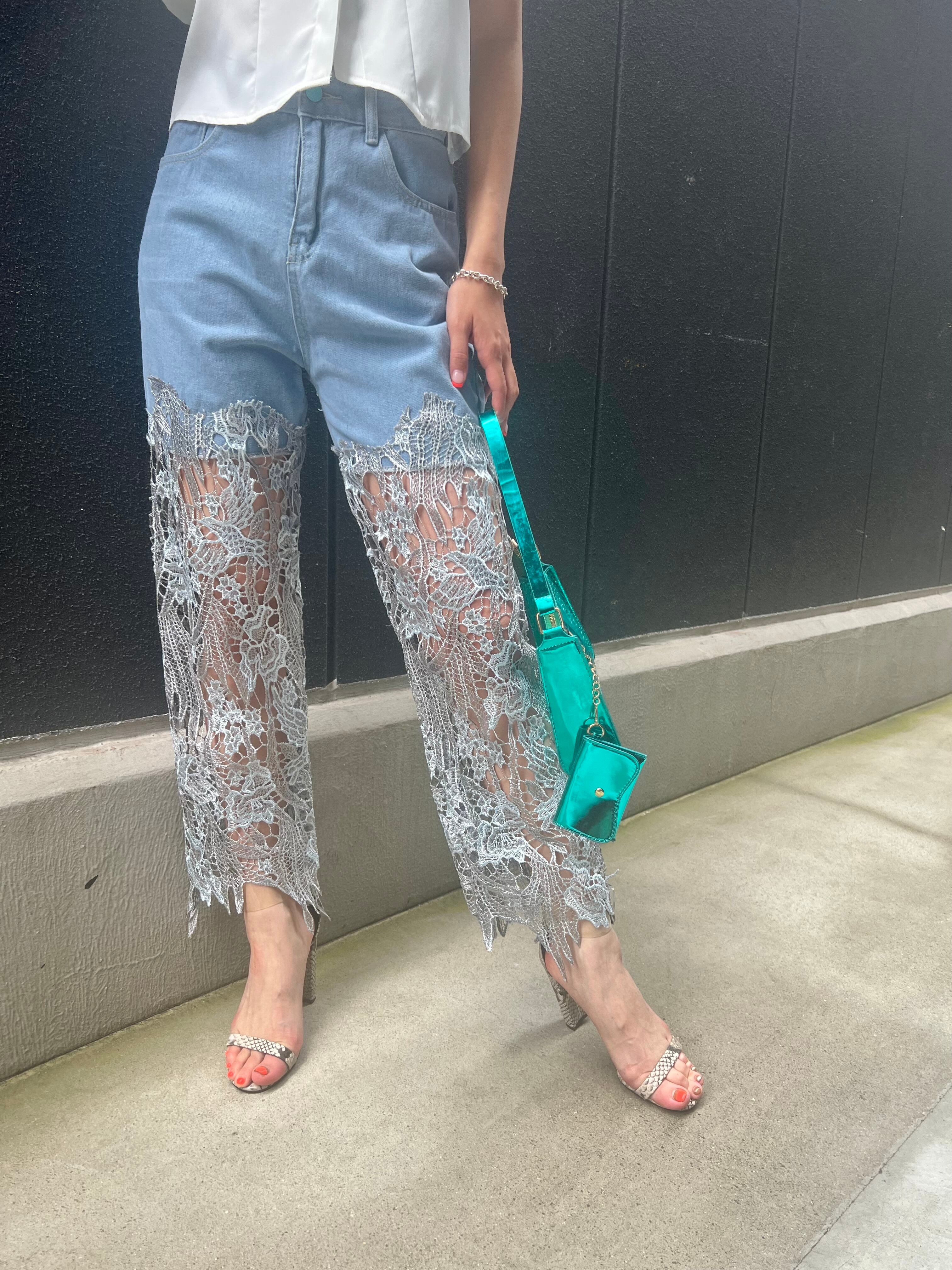 lace change design denim pants パンツ デニム レース 切替デザイン 個性的 デザインパンツ