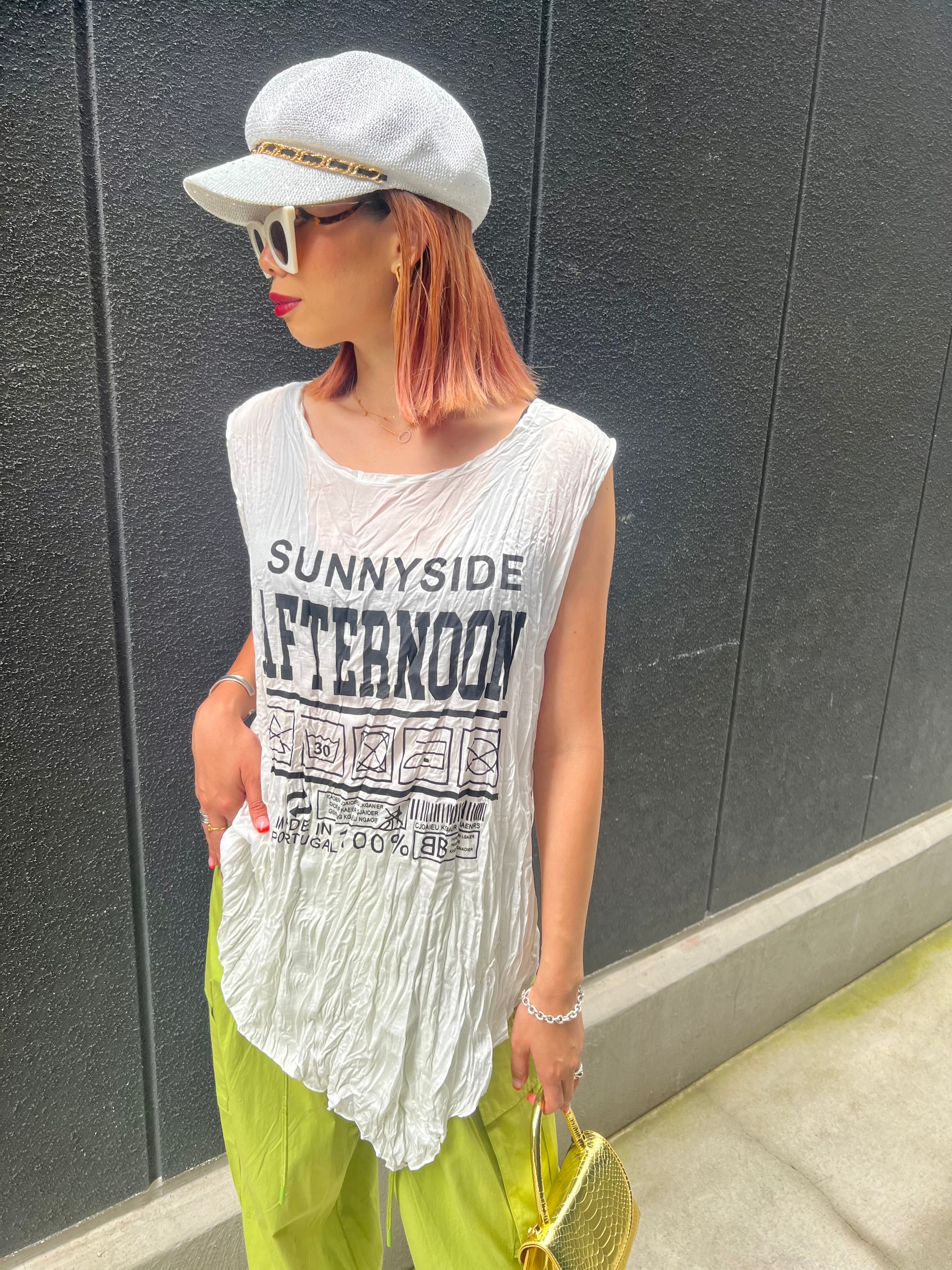 crinkle print sleeveless tops トップス タンクトップ ノースリーブ プリント バイカラー シワ加工 クリンクル アシンメトリー