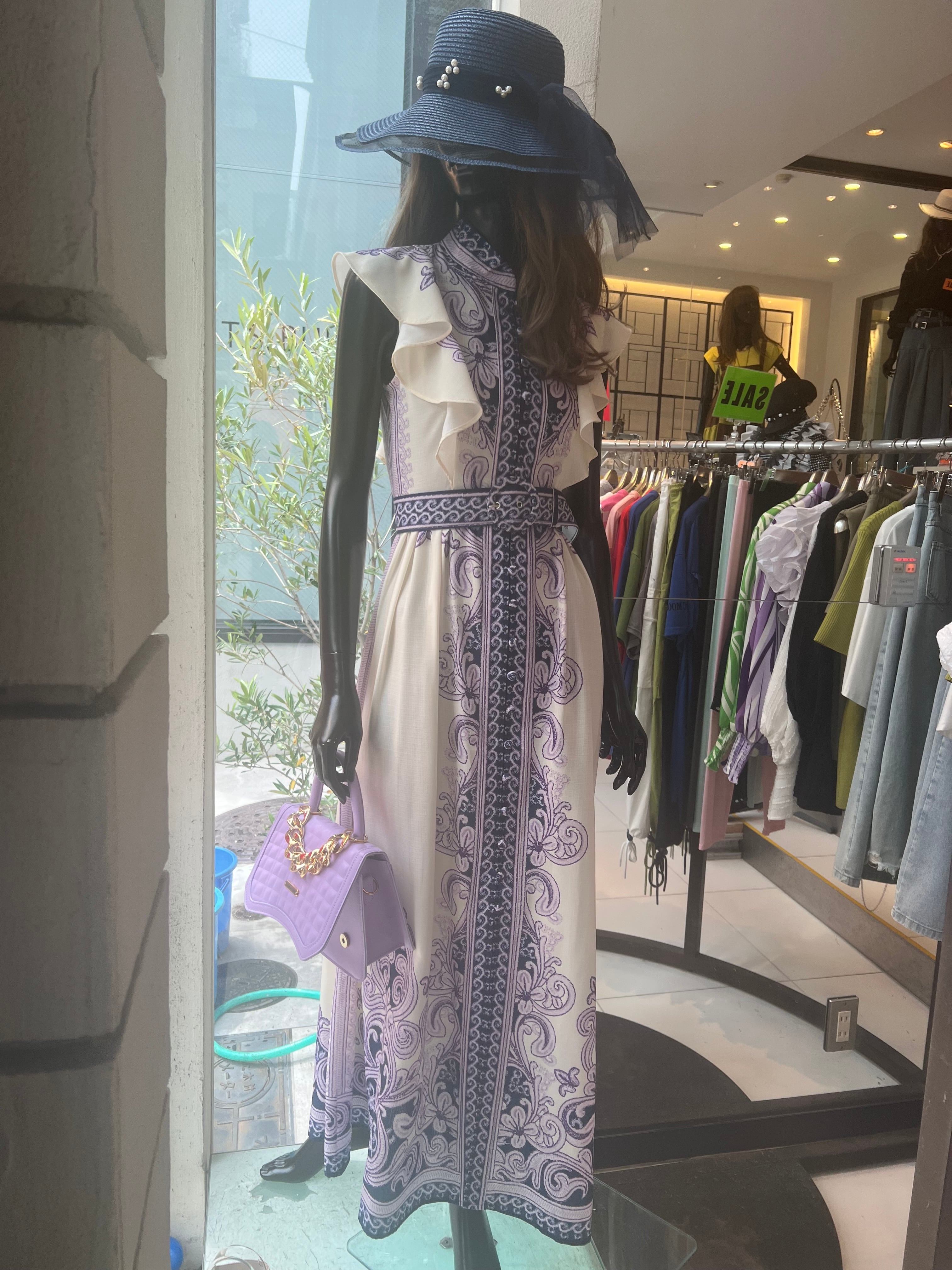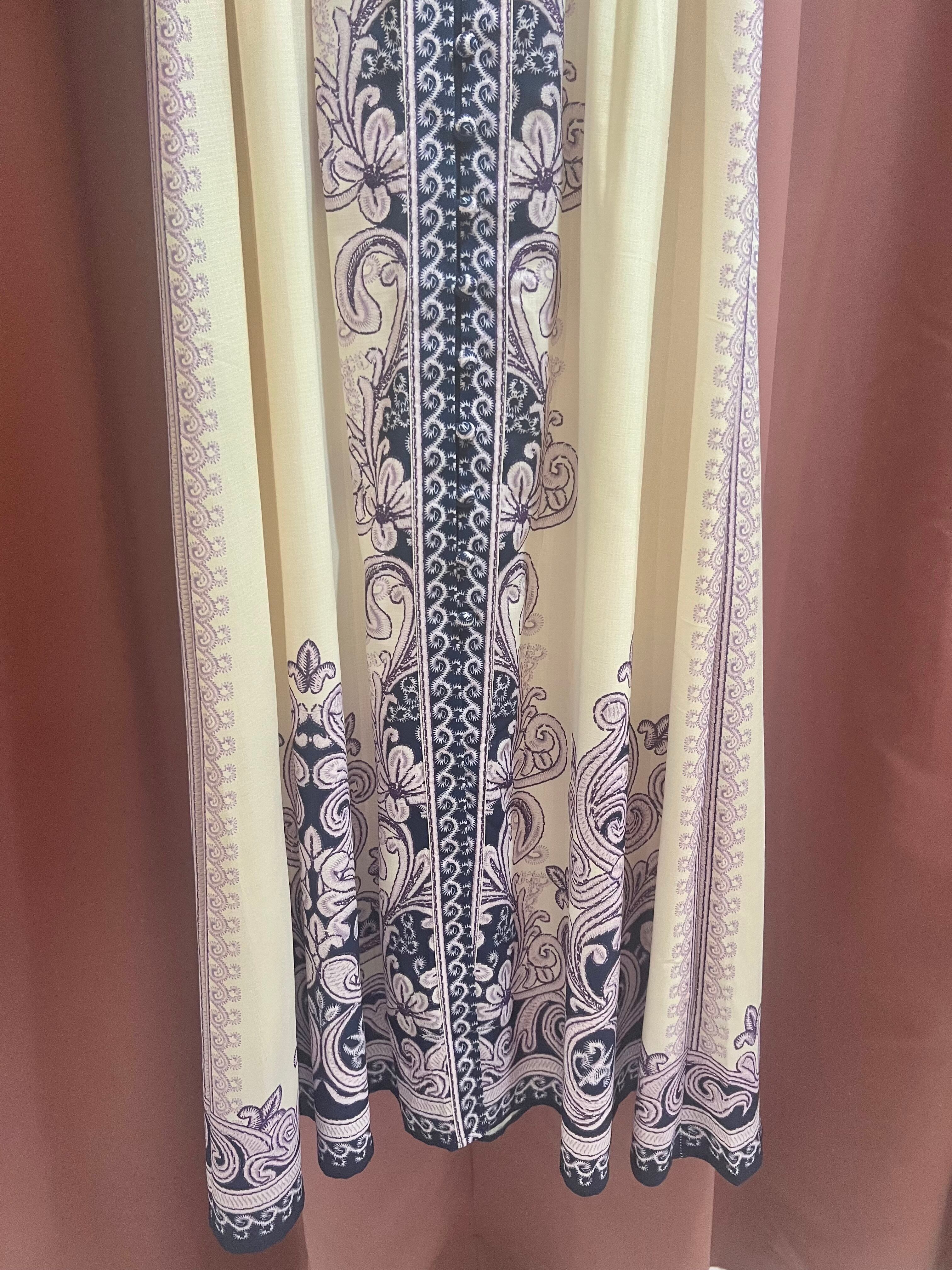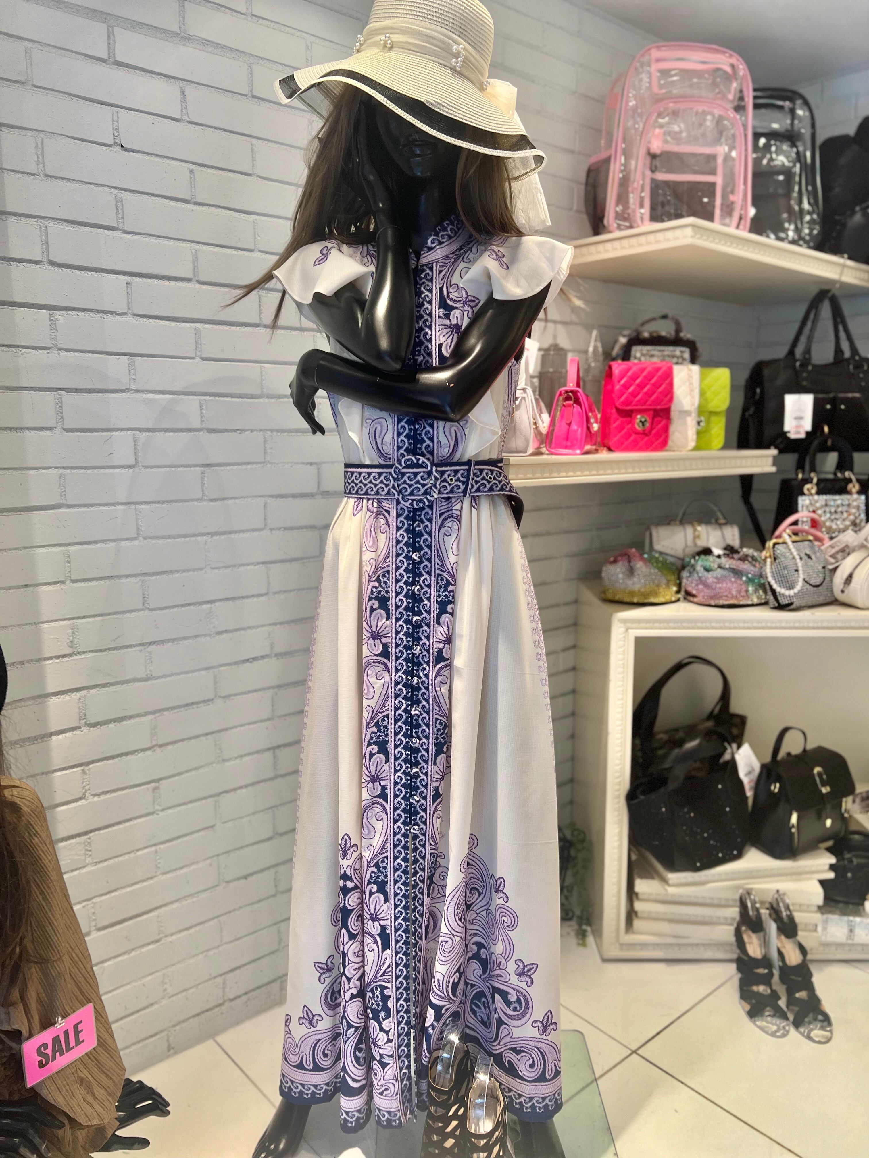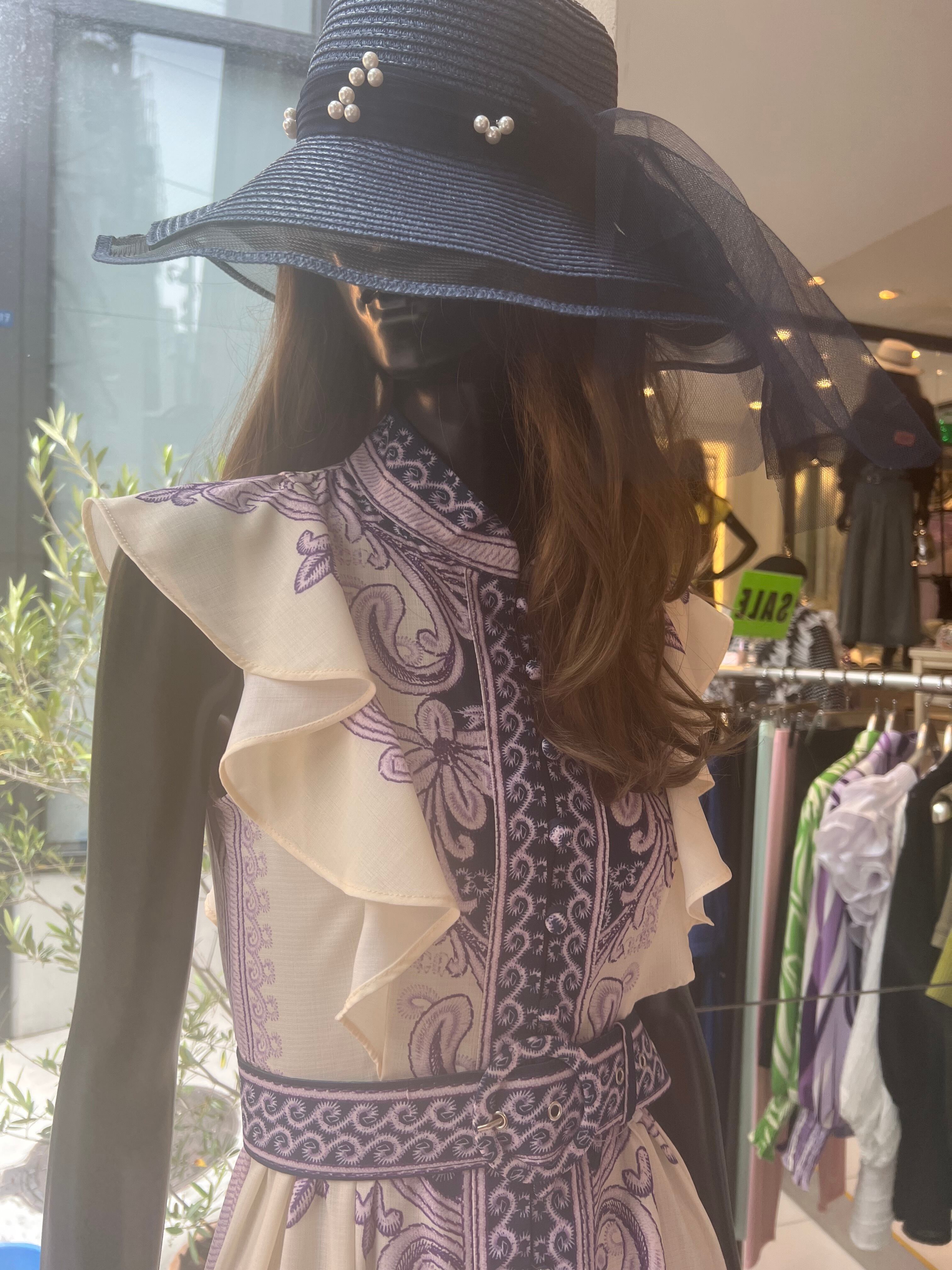 鮮やかなパープルの柄が目を引き、存在感のあるフレアデザインが女性らしさを引き立てます。